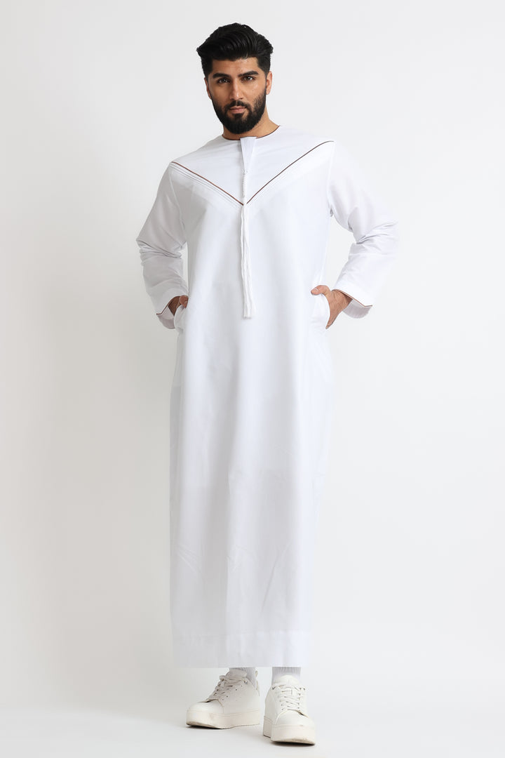 - White/Bronze Hue: The thobe's White/Bronze colour exudes a sense of luxury and sophistication. This subtle yet striking shade is versatile, making it suitable for various occasions, from formal events to everyday wear.