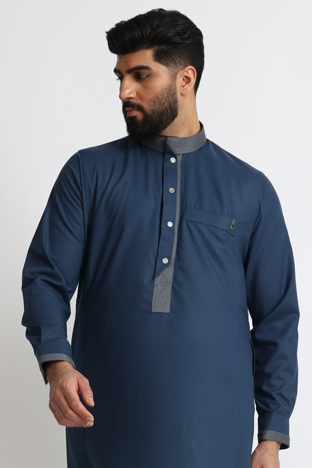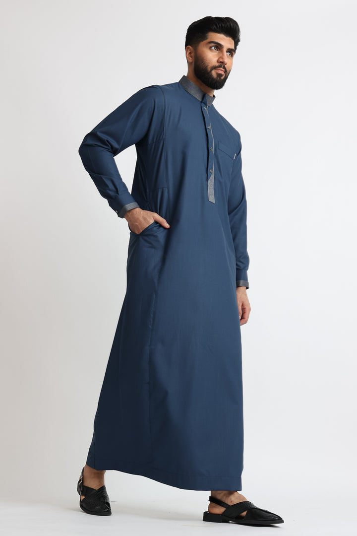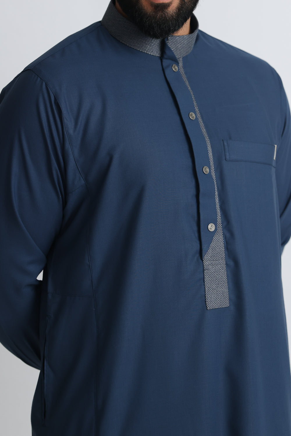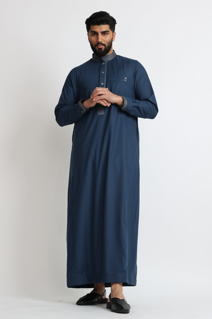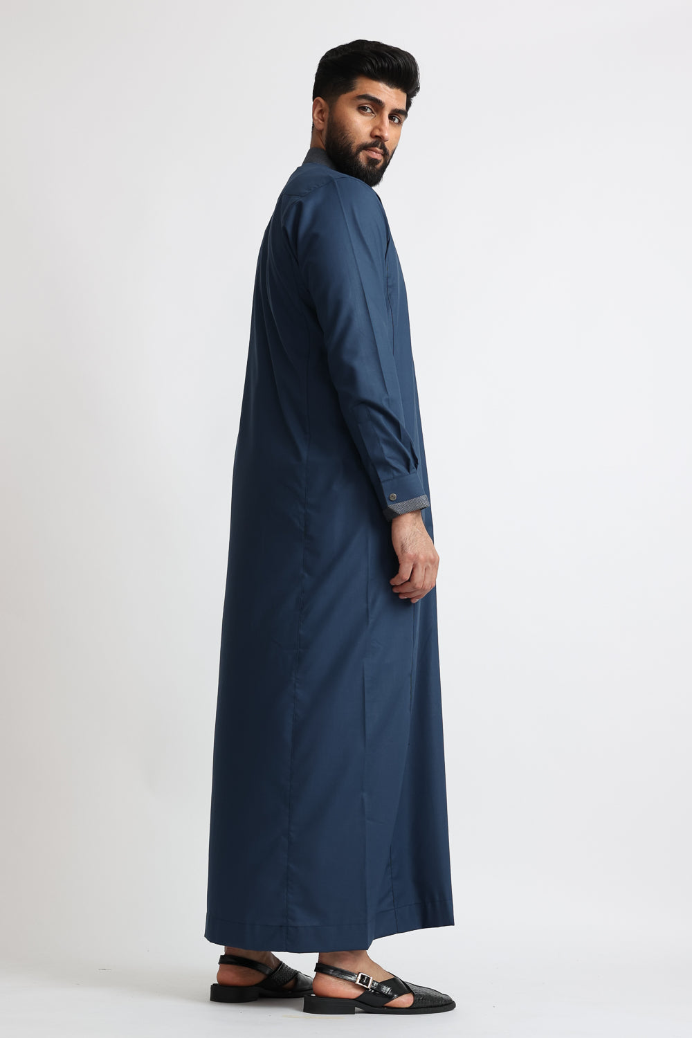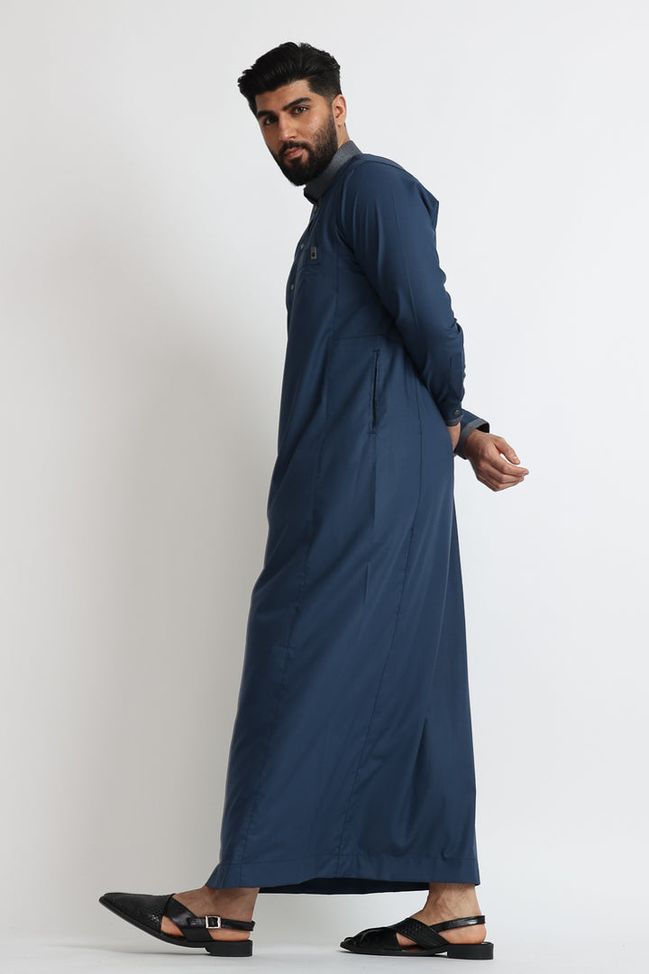 This Navy Thobe is designed with a perfect blend of modern and traditional aesthetics, making it an ideal outfit for various occasions.