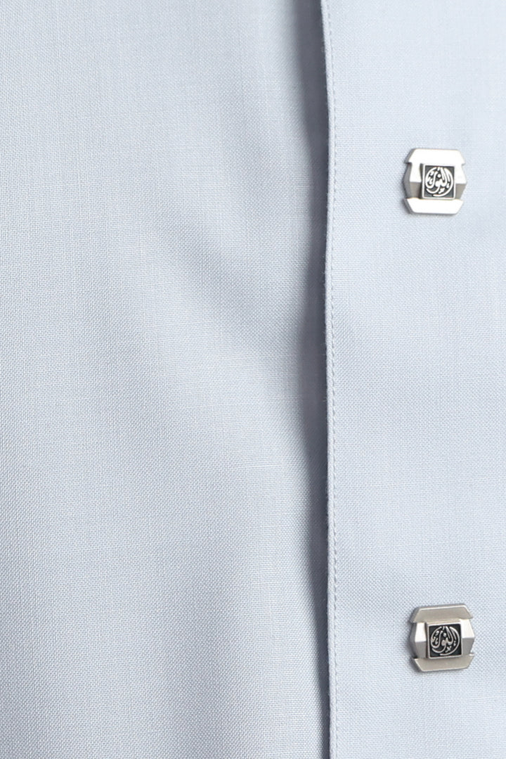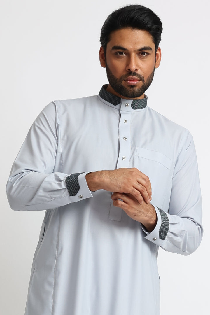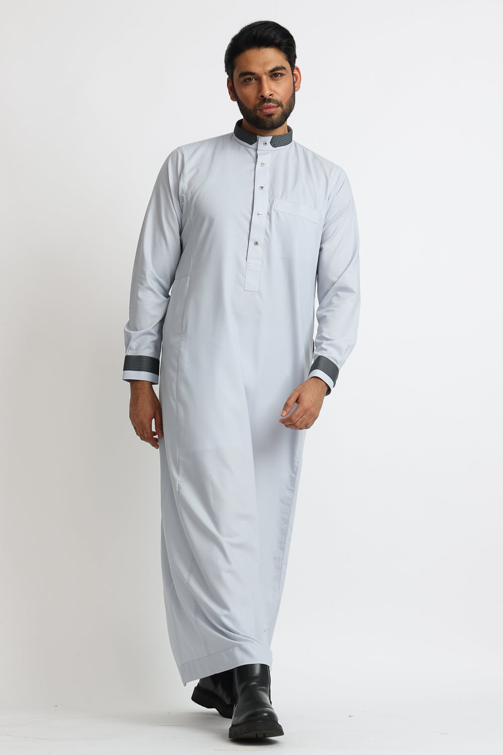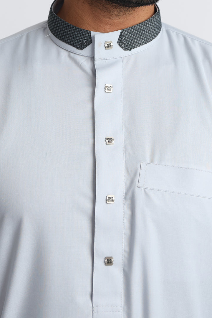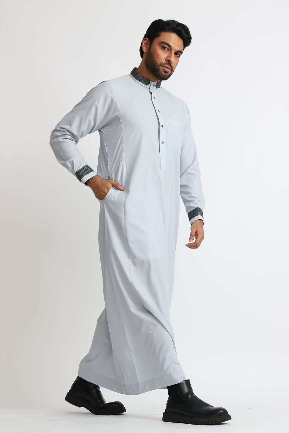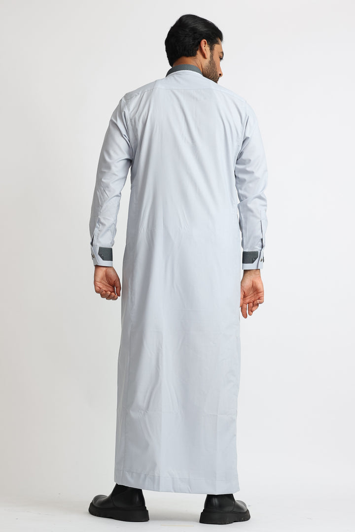 Elevate your style with the J105 Grey Collared Thobe. Made with high-quality soft polyester material, this thobe features a checkered fabric collar and cuff, as well as a convenient shirt style press button cuff. Add a touch of sophistication to your wardrobe with this versatile and stylish piece.