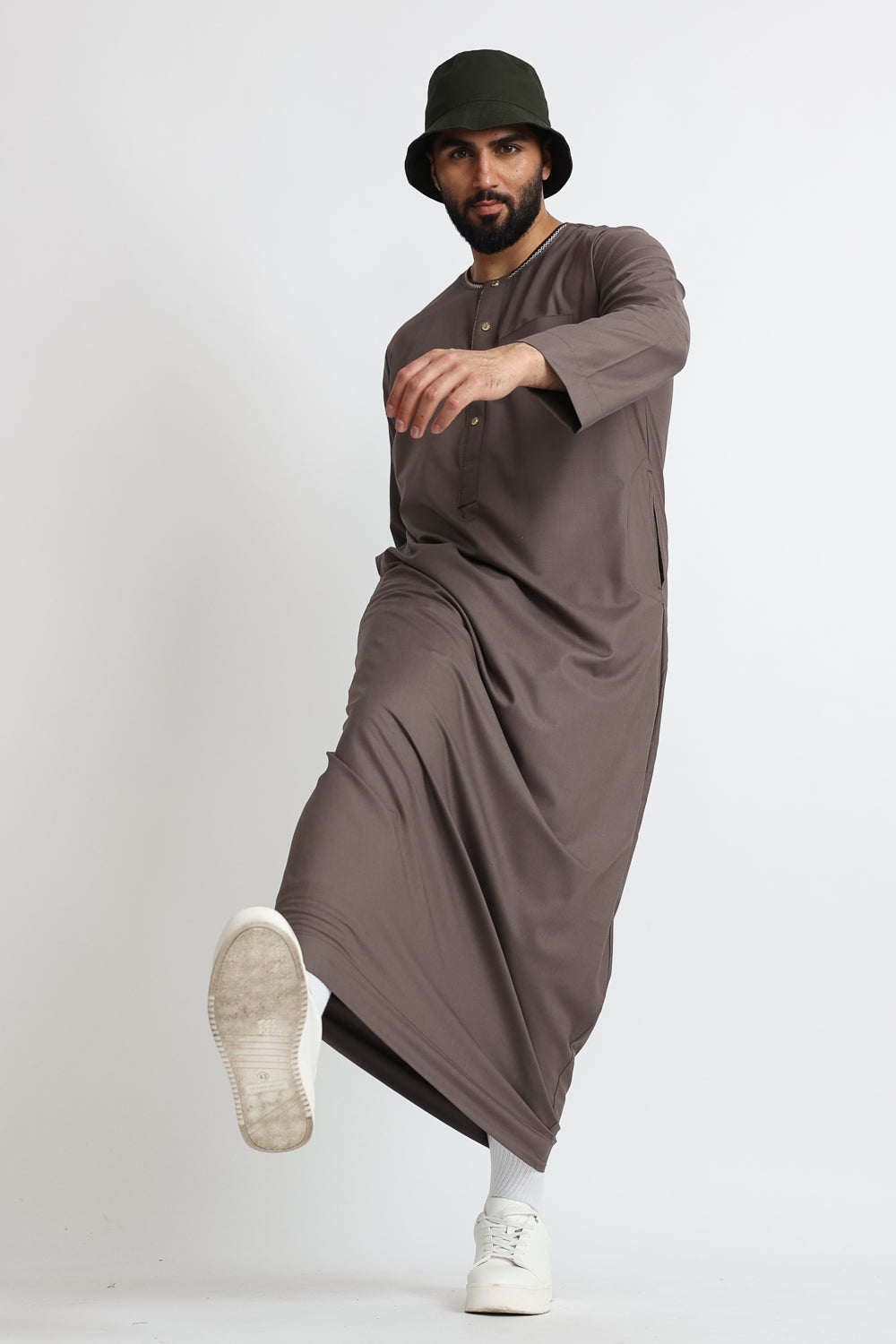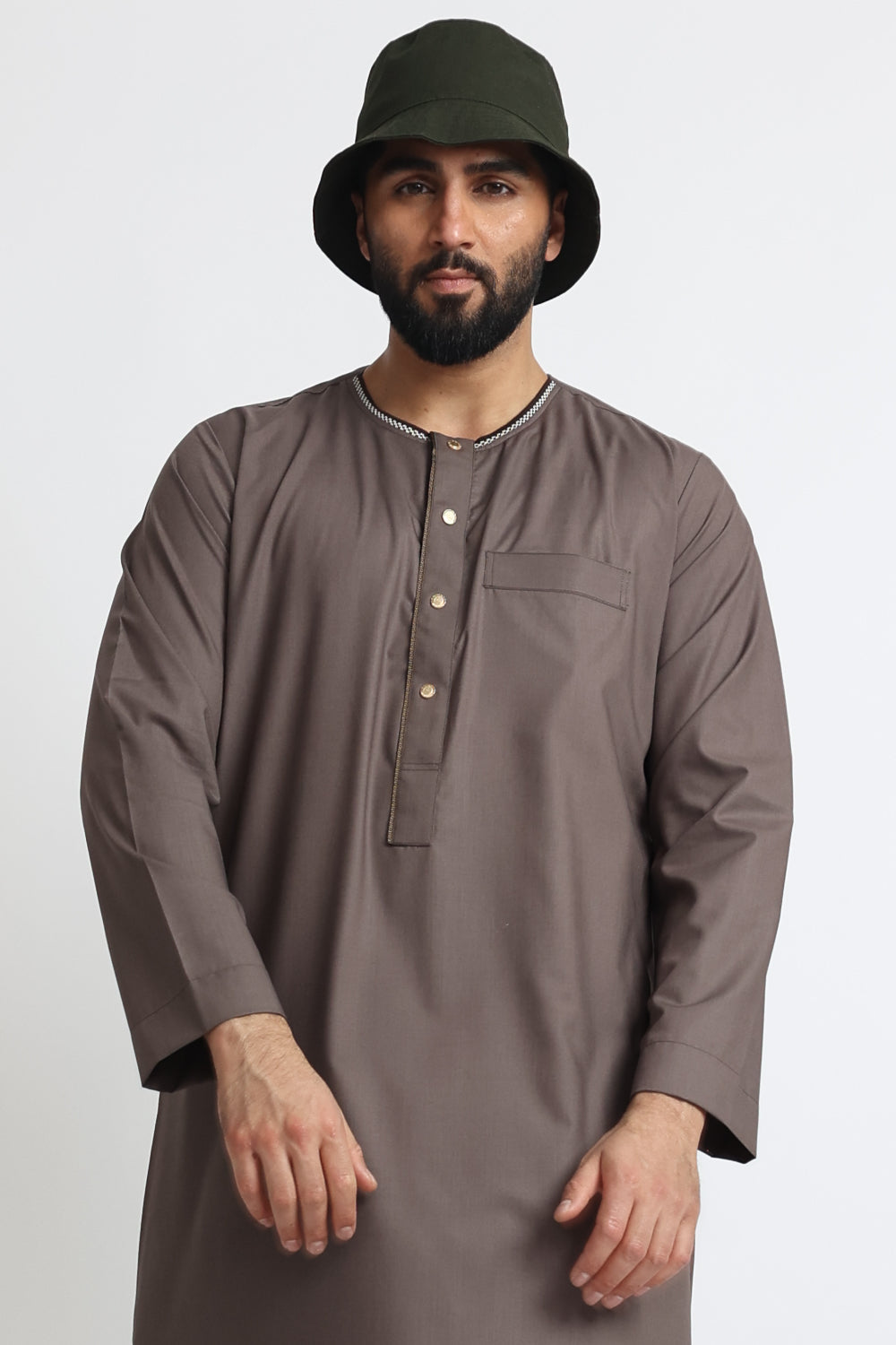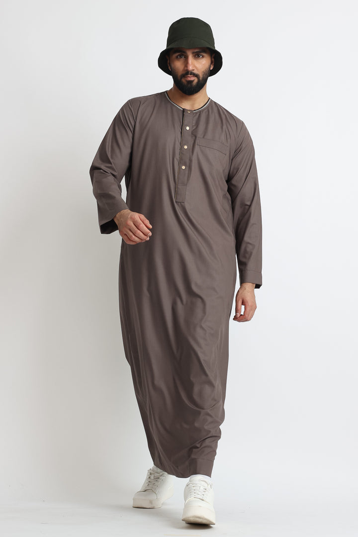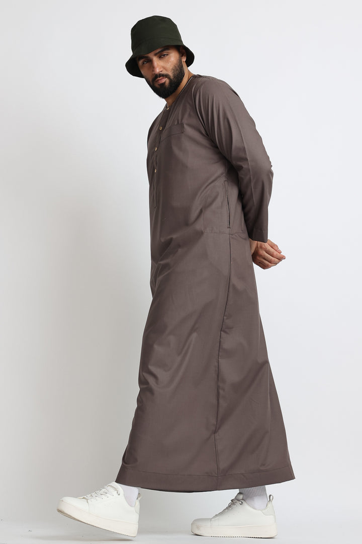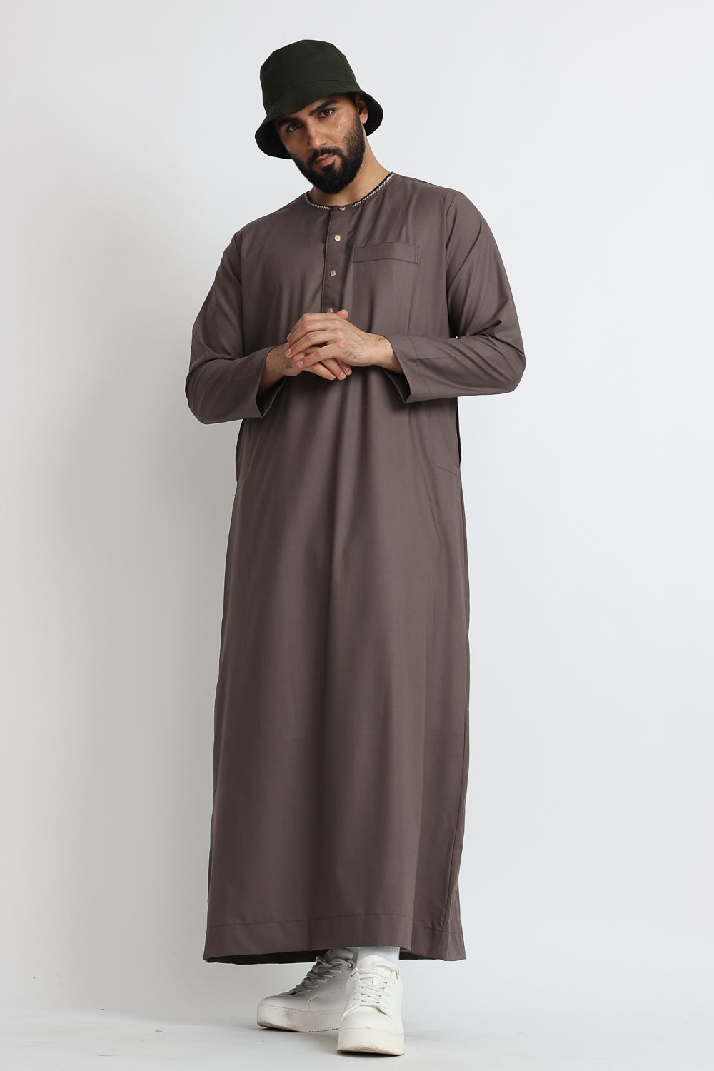 Experience true comfort and style with our J107 Brown Button Omani. Crafted with soft polyester material, it features a Greek-inspired print around the neck and a sleek press button opening. Lift up your wardrobe with the Al Noor Omani Thobe and make a statement wherever you go.