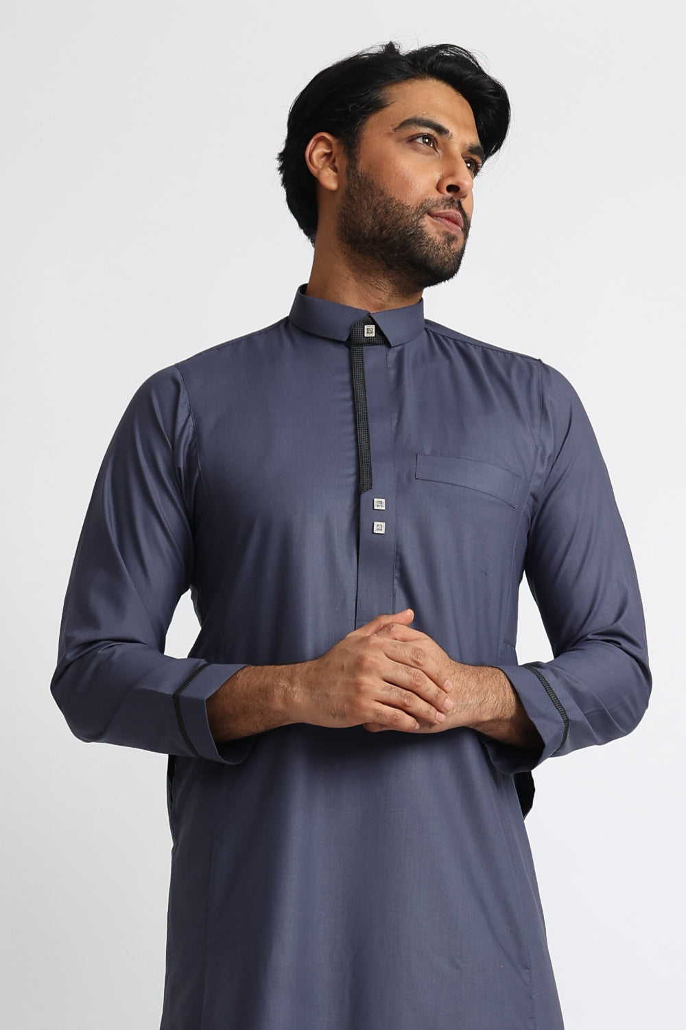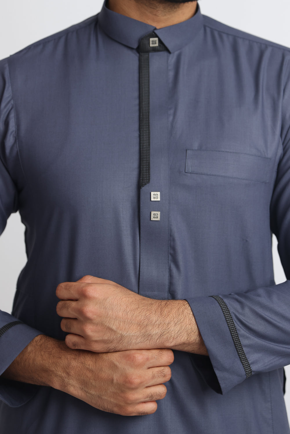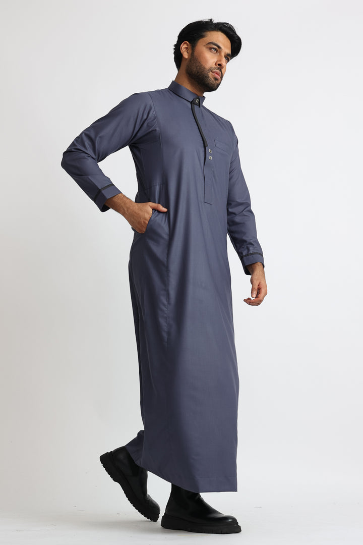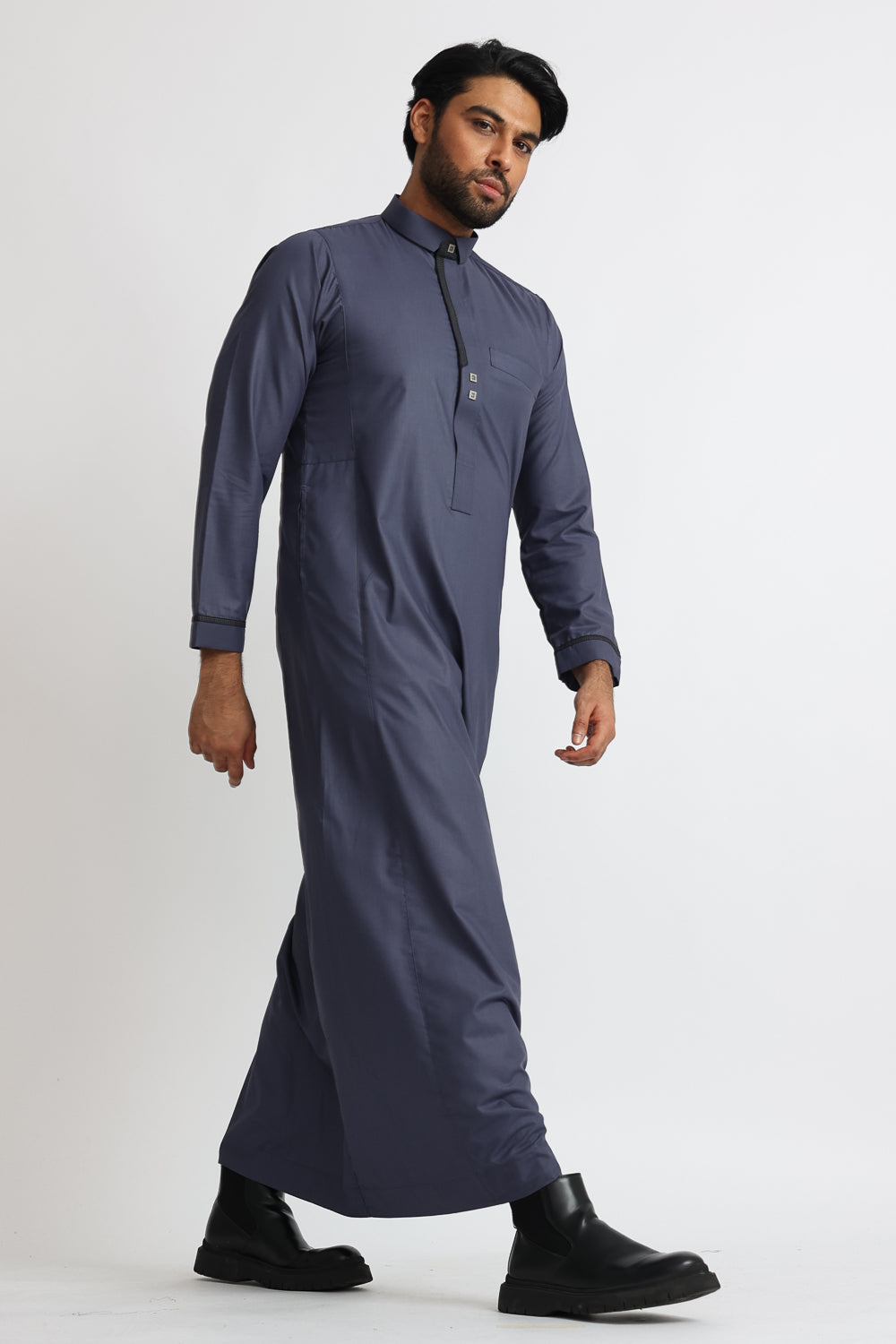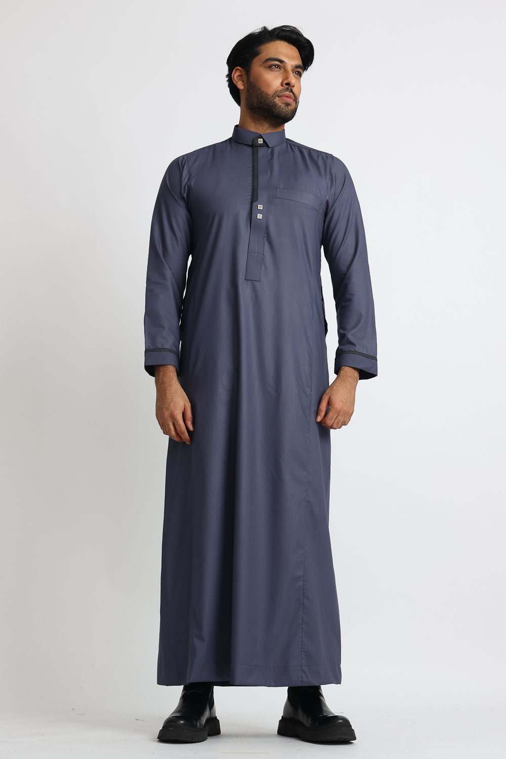 Get ready to take on any challenge with the stylish J111 Jet Grey Thobe. Made with Al Noor fabric and featuring a unique mandarin collar design, this thobe will make you stand out from the crowd. The zip opening and square buttons add a touch of adventure, while the open cuffs allow for easy movement. Unleash your bold and daring side in this thobe!