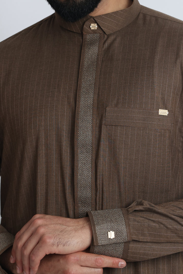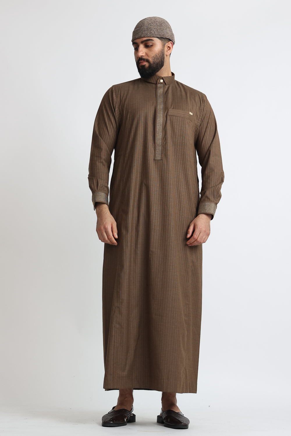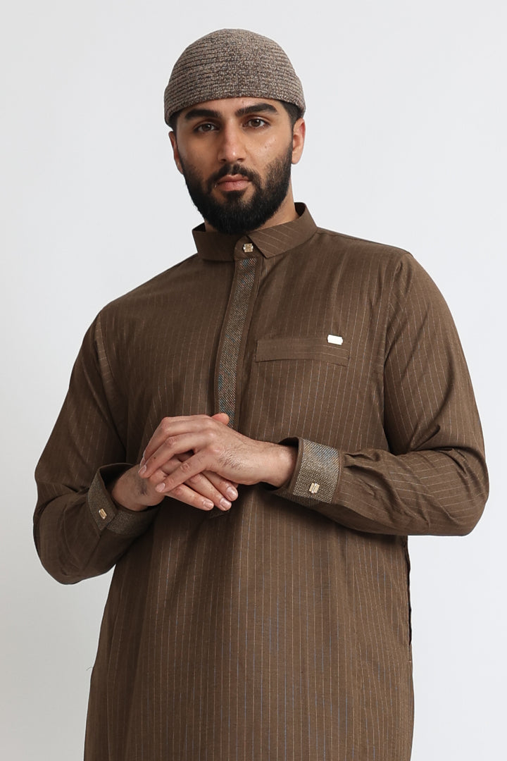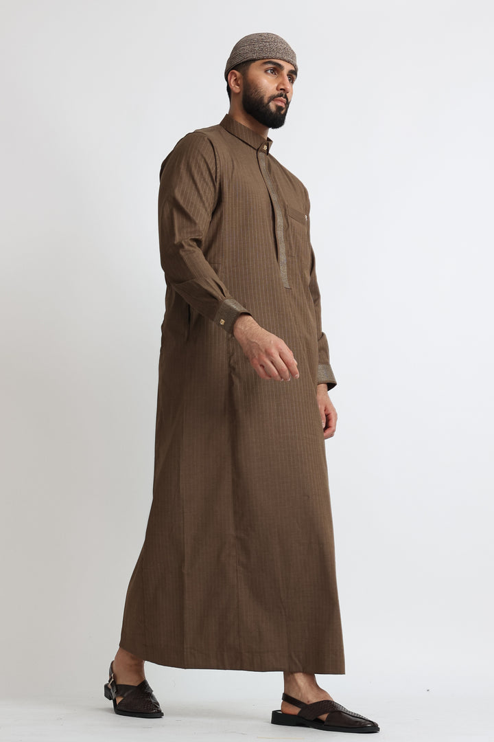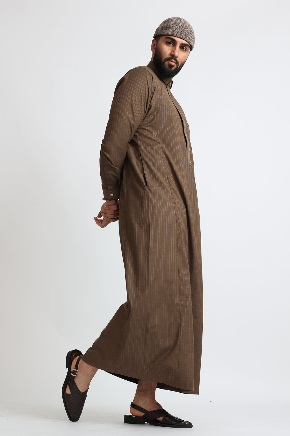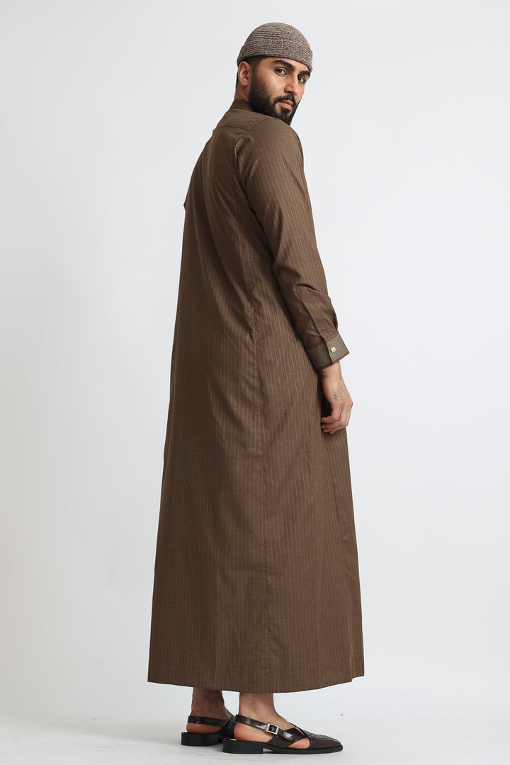 We’re excited to announce that our collaboration with Al Noor is stronger than ever, bringing you the latest must-have collection for Ramadan 2025: the Dark Brown Pinstripe Thobe.