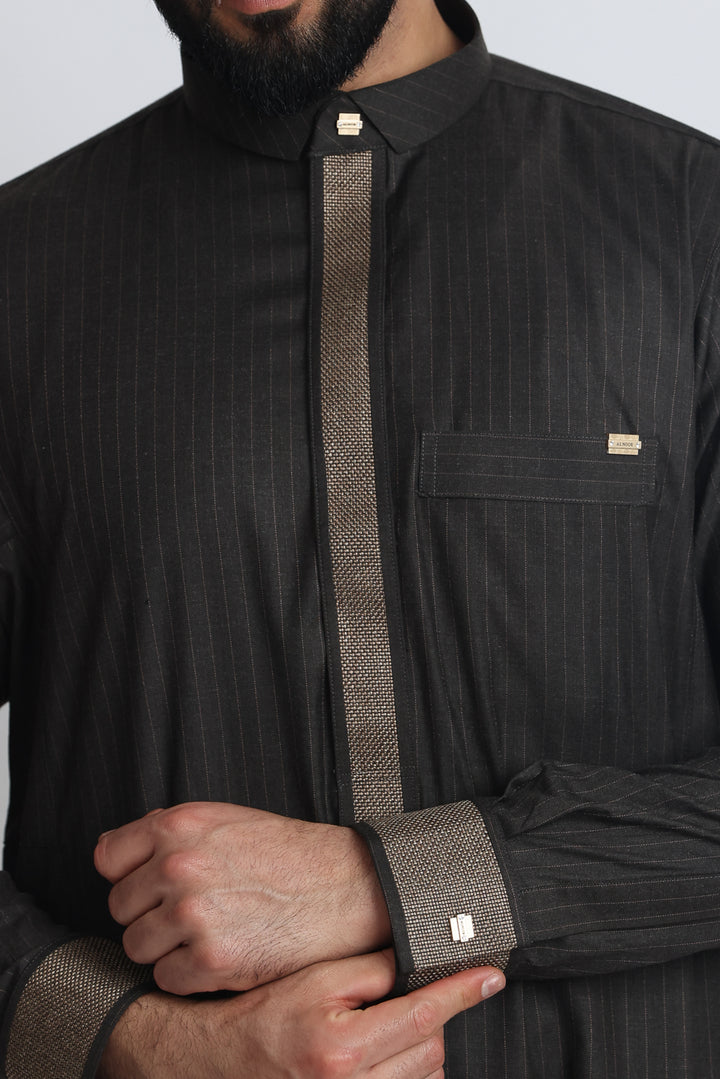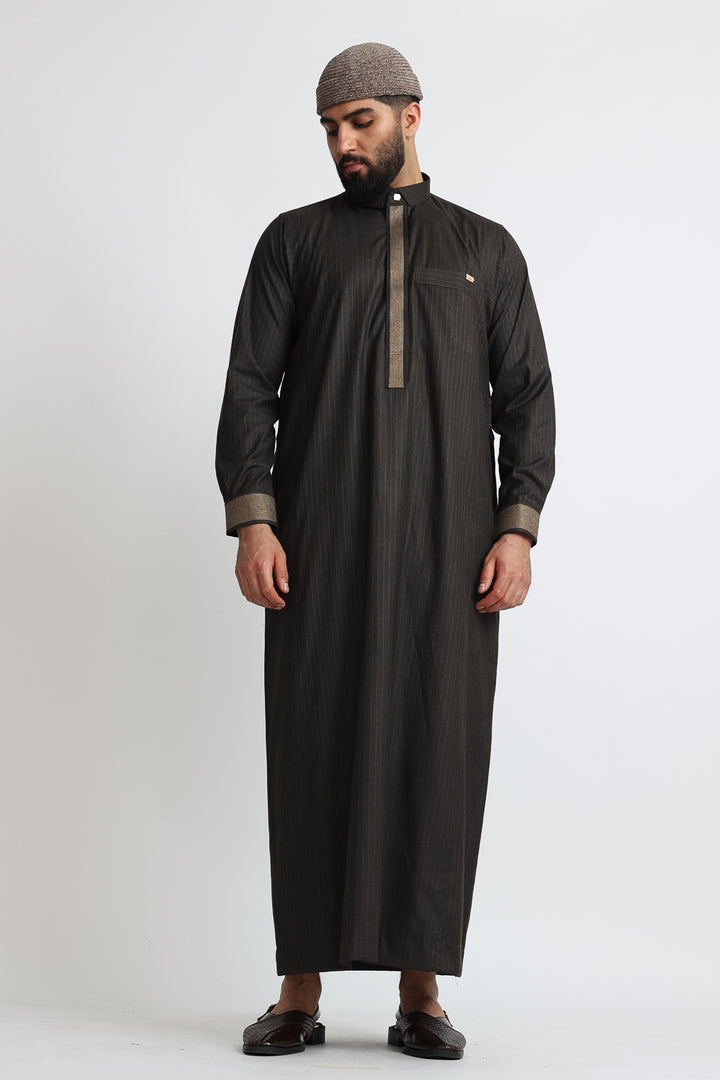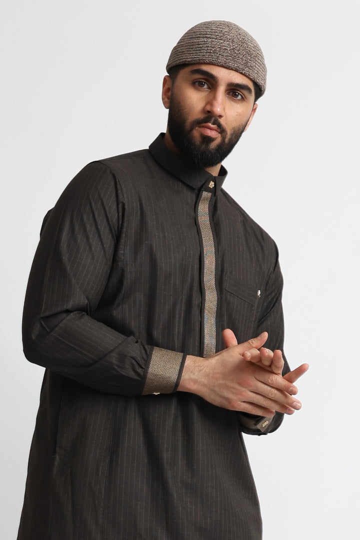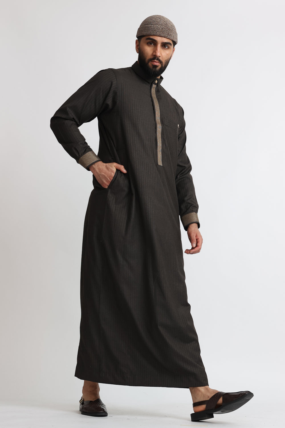We’re excited to announce that our collaboration with Al Noor is stronger than ever, bringing you the latest must-have collection for Ramadan 2025: the Dark Brown Pinstripe Thobe.