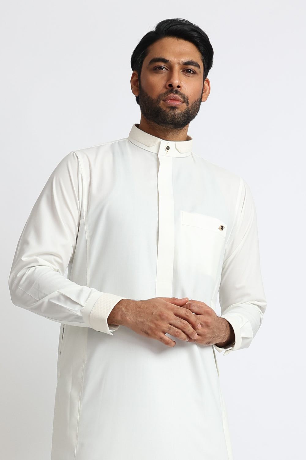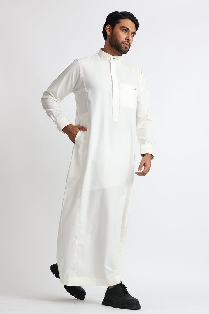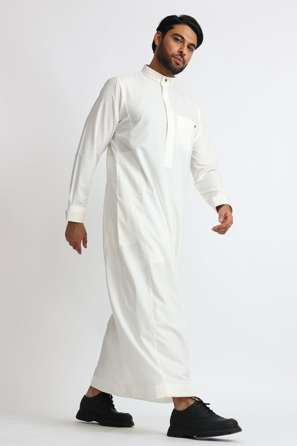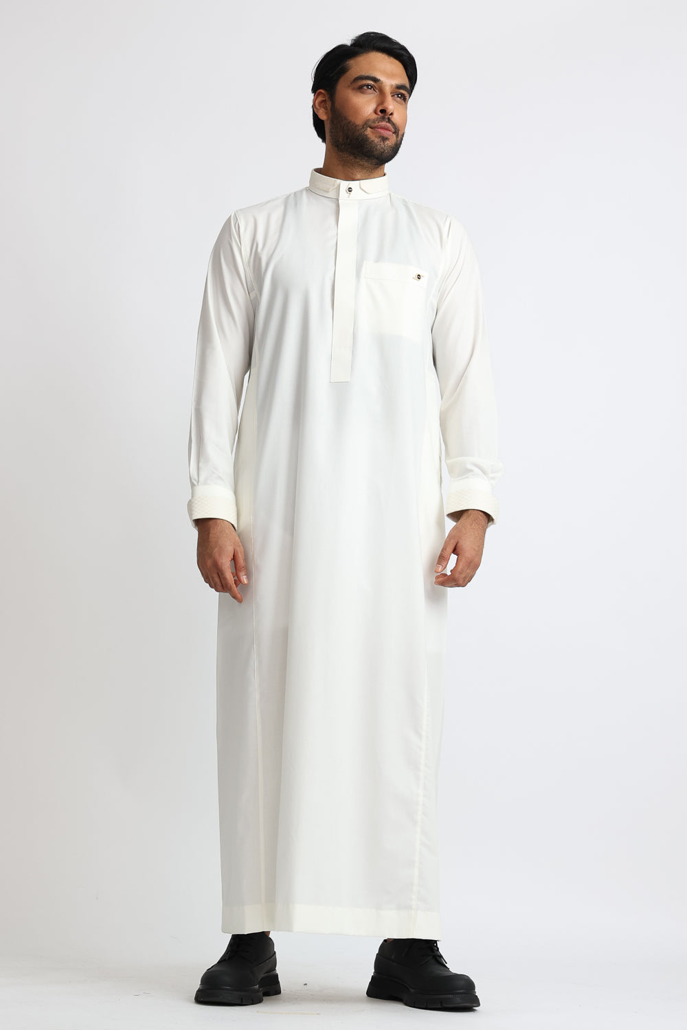 The Cream Collar Thobe with overlapping Jacquard fabric on the collar and cuffs is a sophisticated and stylish garment that combines tradition with modernity. Its elegant design, functional features, and unique details make it a perfect choice for those looking to elevate their wardrobe and make a lasting impression.