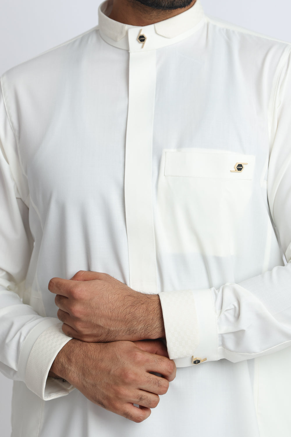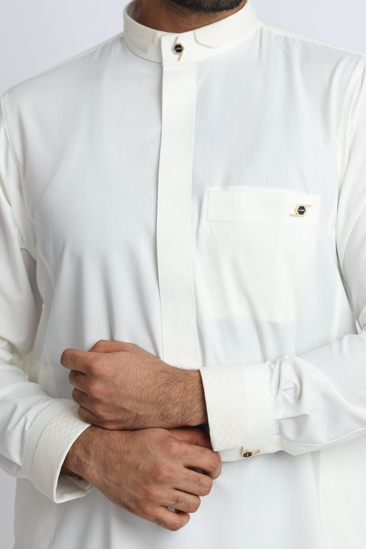 The Cream Collar Thobe with overlapping Jacquard fabric on the collar and cuffs is a refined and stylish garment that merges traditional elegance with modern sophistication. This thobe is designed to stand out with its unique features and meticulous craftsmanship, making it an excellent choice for those looking to make a statement.