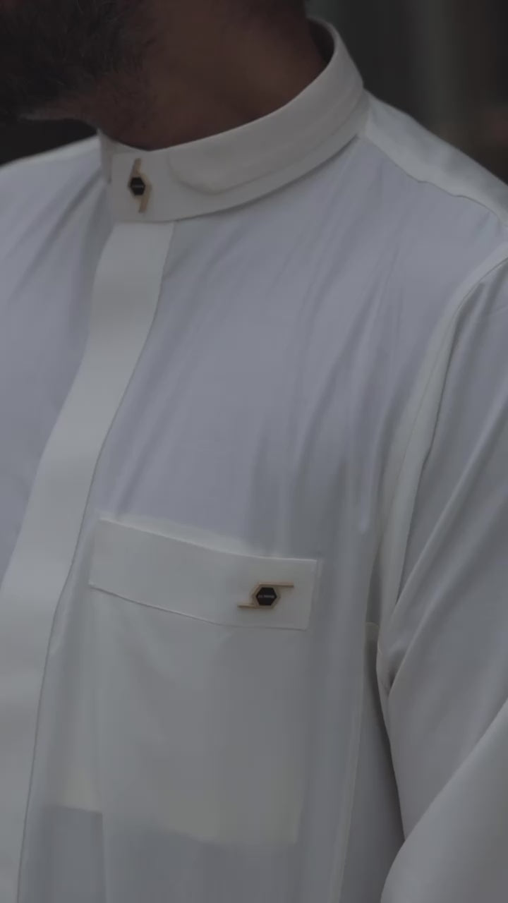 - Upper Left Chest Pocket: The chest pocket features a unique hexagon gold/black planket, adding a modern and sophisticated touch. This pocket is both practical and decorative, enhancing the thobe's overall aesthetic.