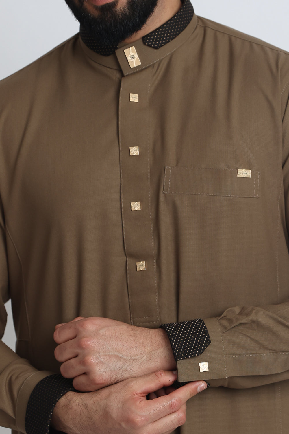 Elevate your everyday style with this premium thobe that is perfect for any formal occasion. The super-fine suiting material provides ultimate comfort, while the fine patterned design adds sophistication to your look. The herringbone fabric on collar and cuff creates texture, making this thobe stand out from the crowd.