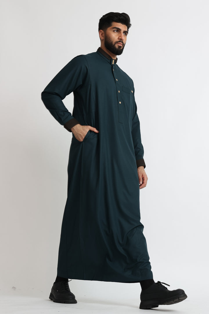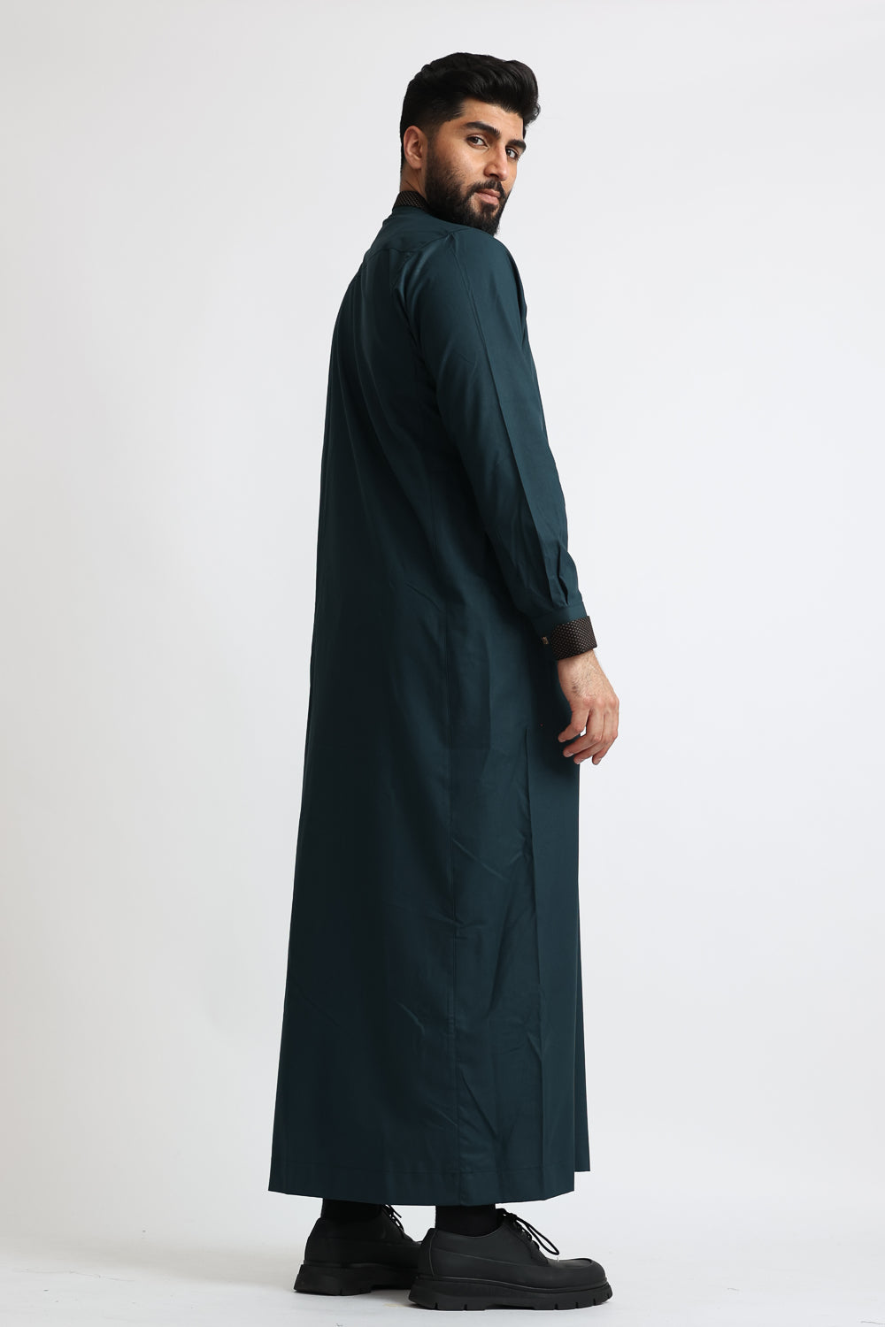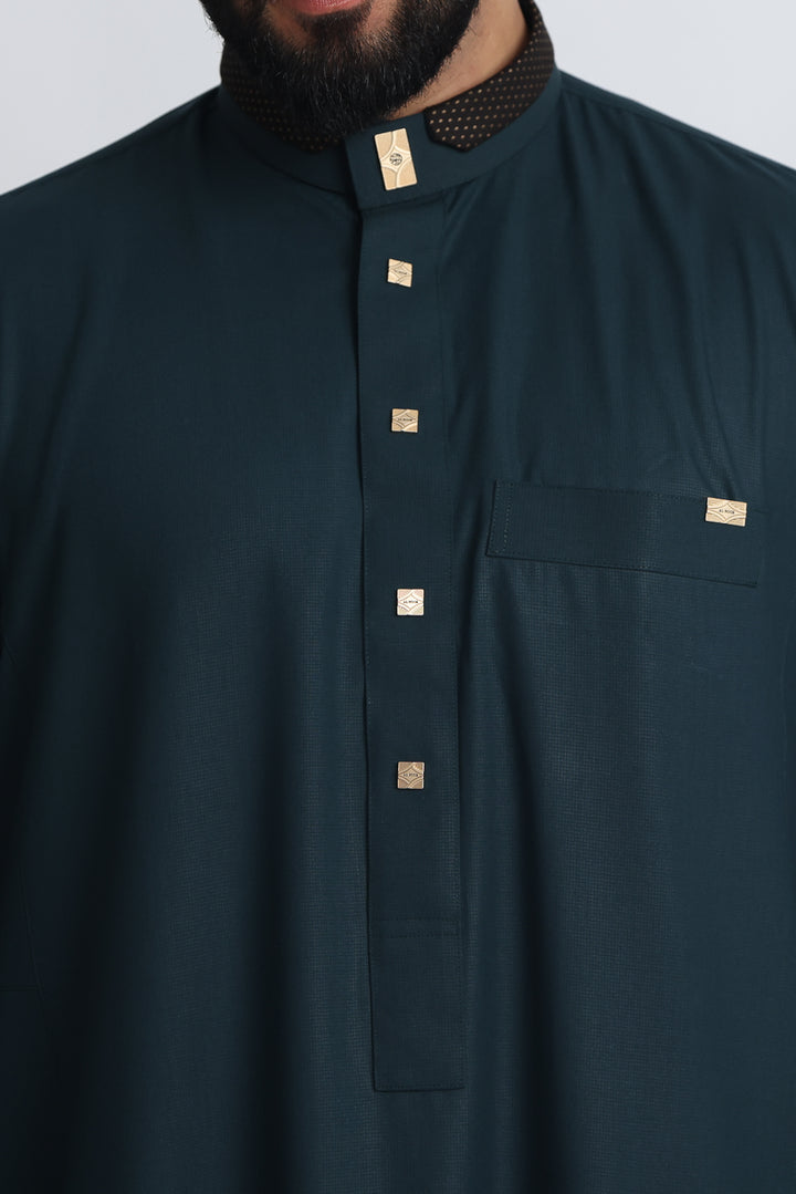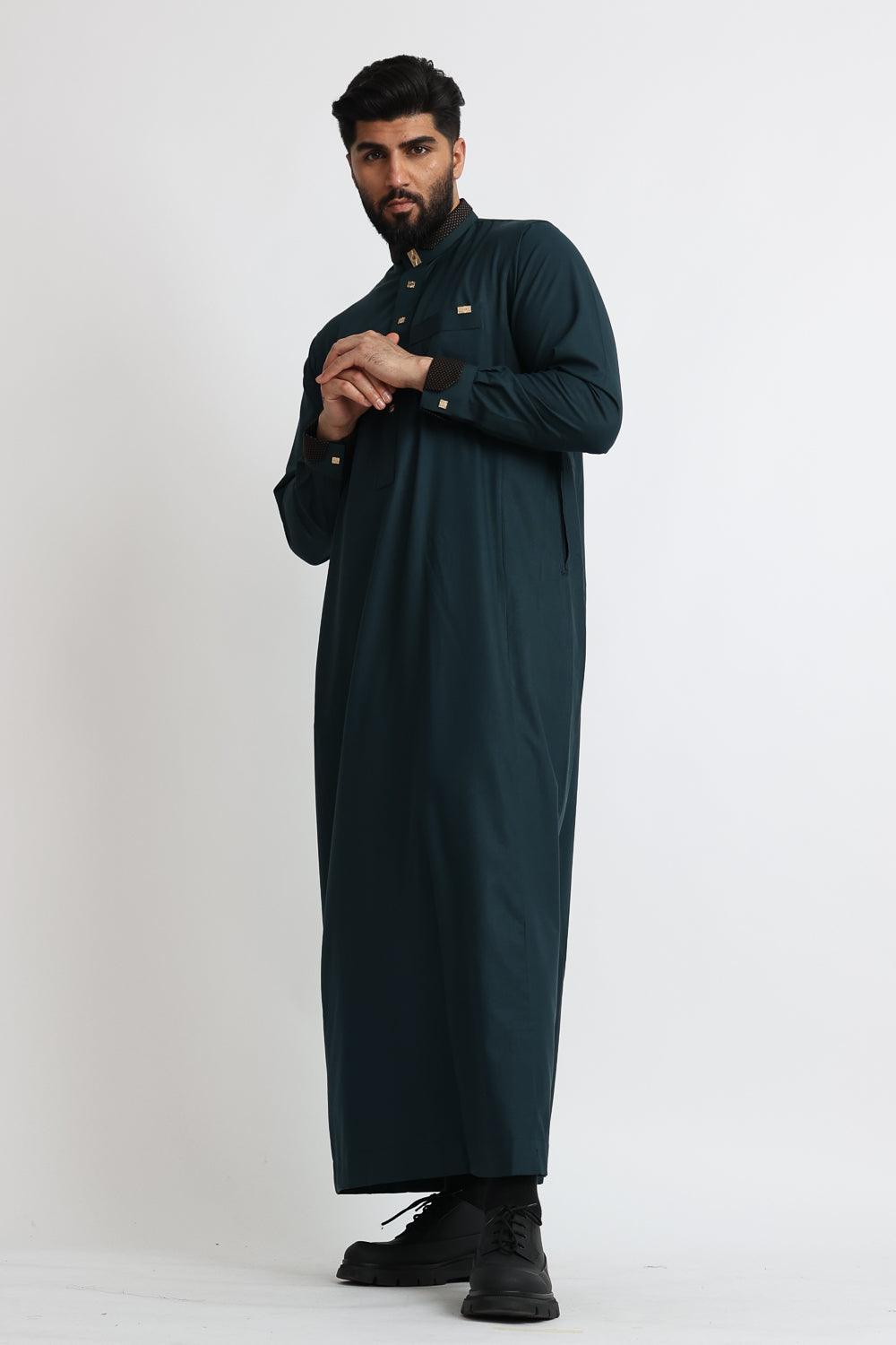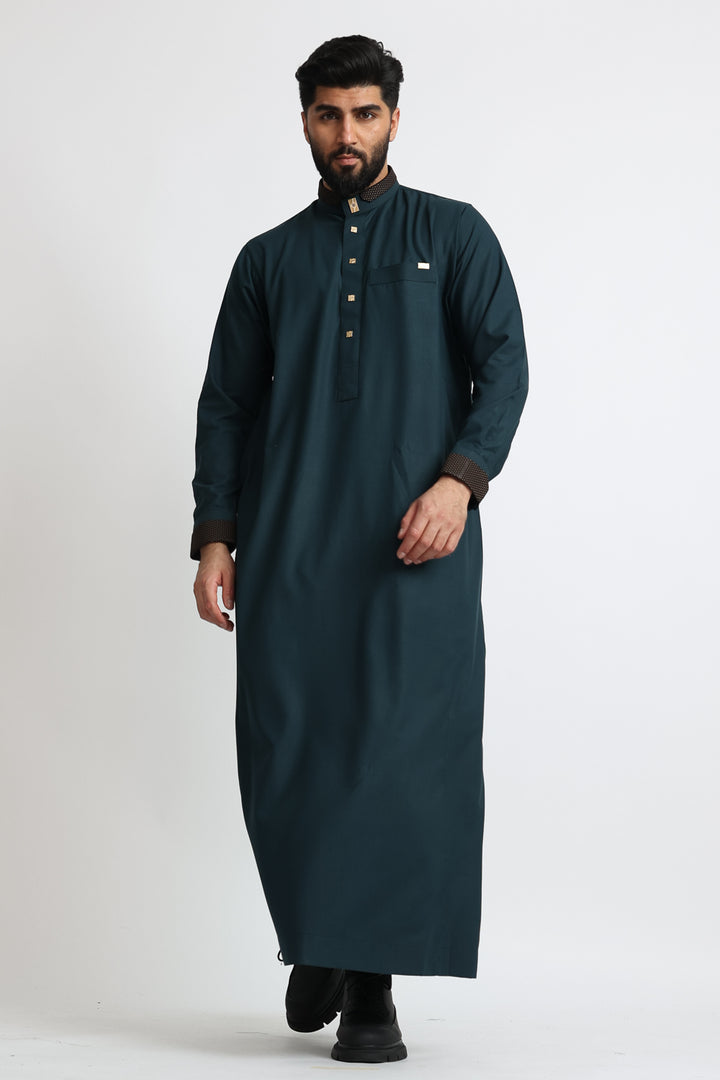 Elevate your everyday style with this premium thobe that is perfect for any formal occasion. The super-fine suiting material provides ultimate comfort, while the fine patterned design adds sophistication to your look. The herringbone fabric on collar and cuff creates texture, making this thobe stand out from the crowd.