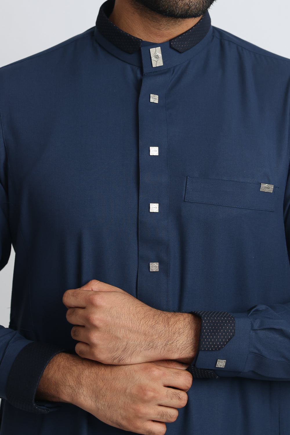 Elevate your everyday style with this premium thobe that is perfect for any formal occasion. The super-fine suiting material provides ultimate comfort, while the fine patterned design adds sophistication to your look. The herringbone fabric on collar and cuff creates texture, making this thobe stand out from the crowd.