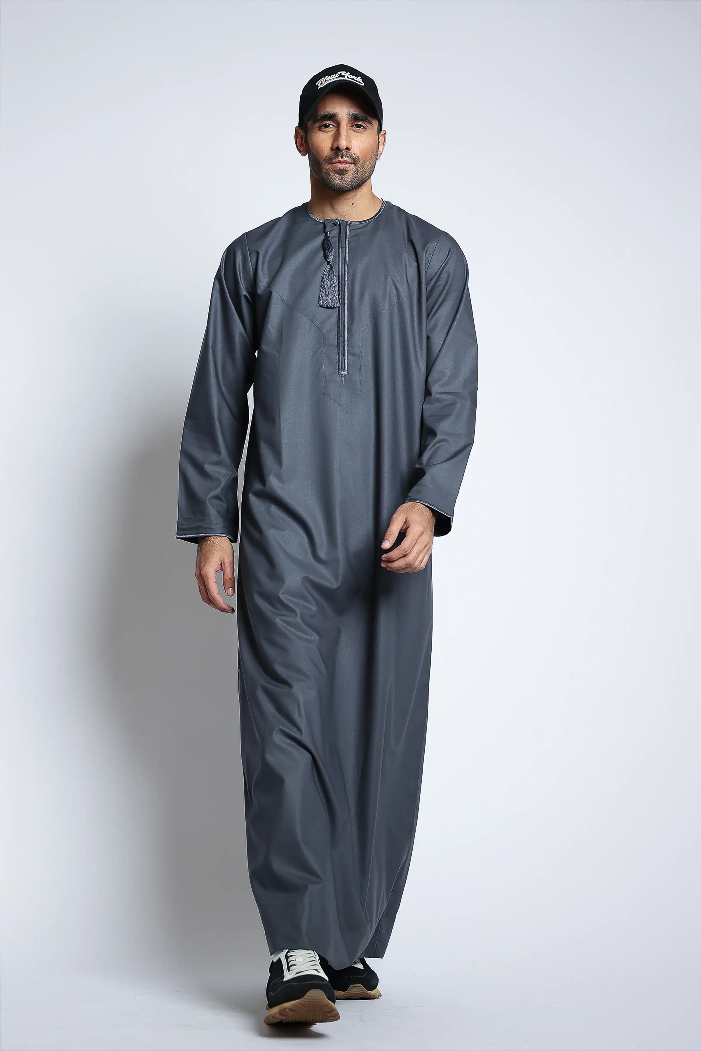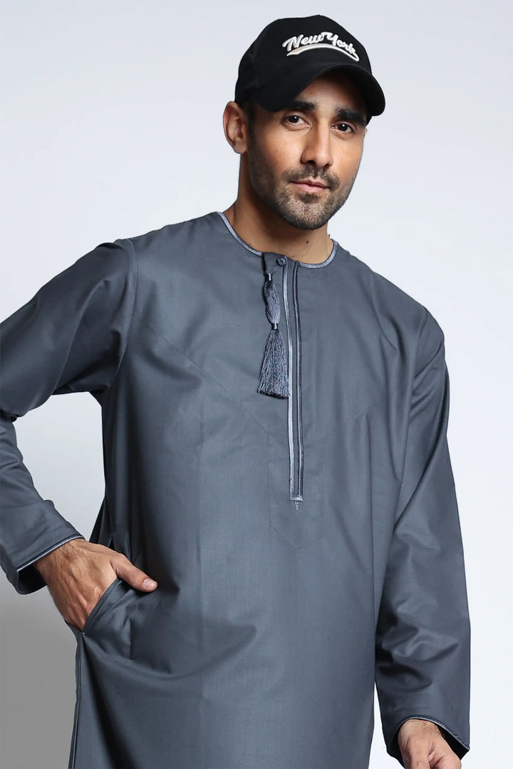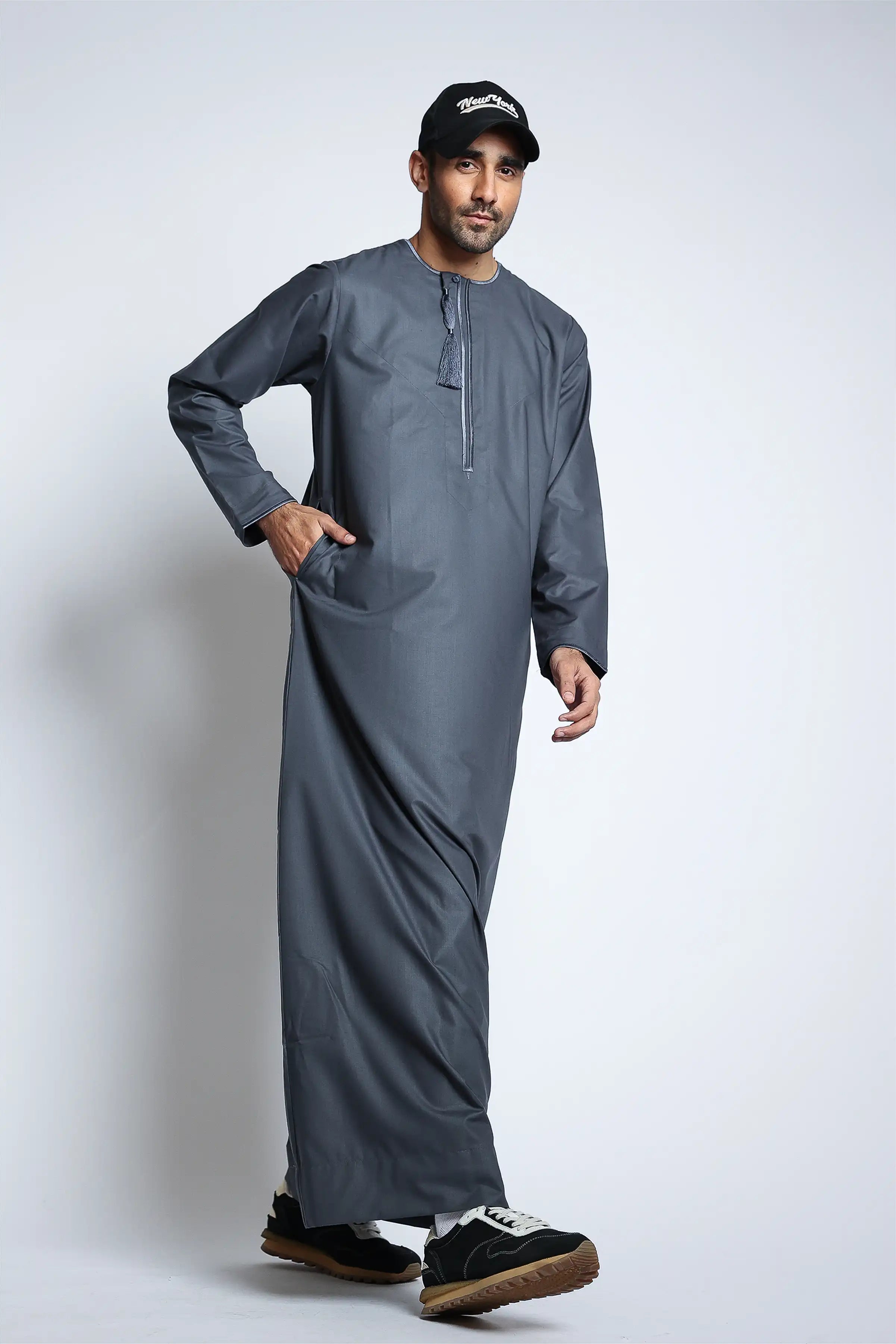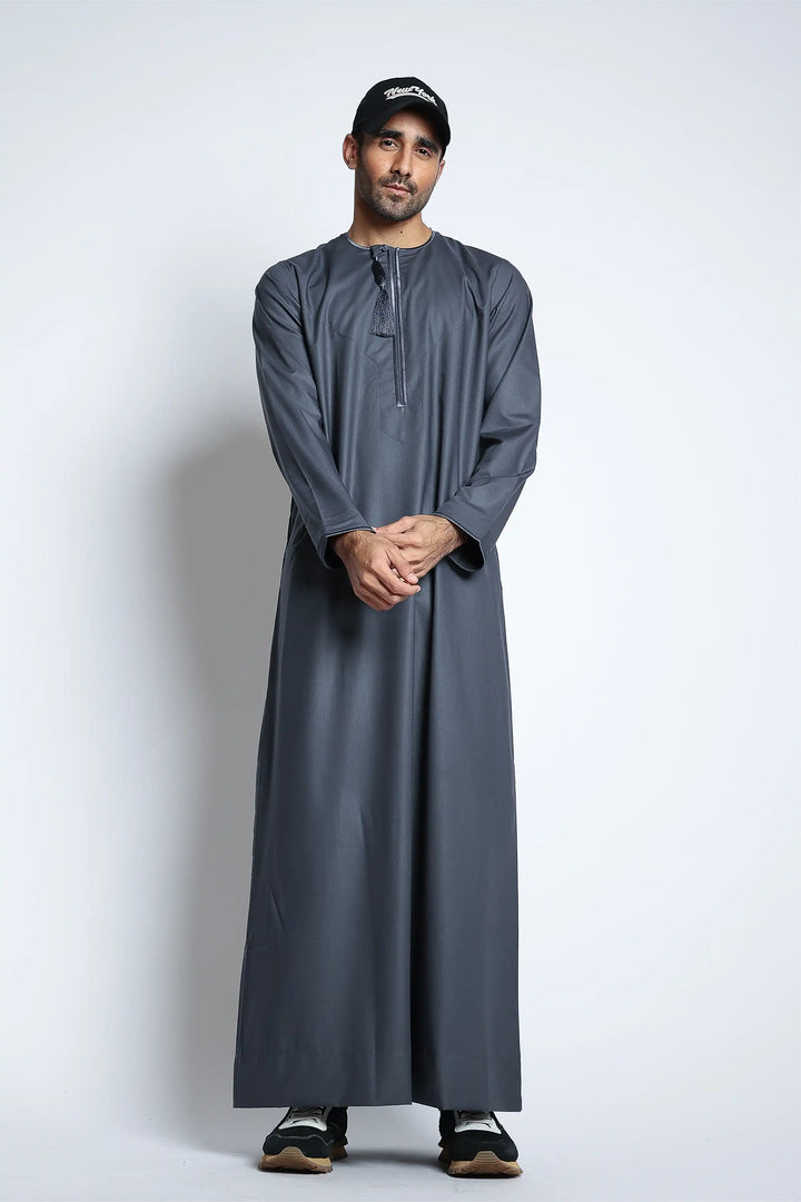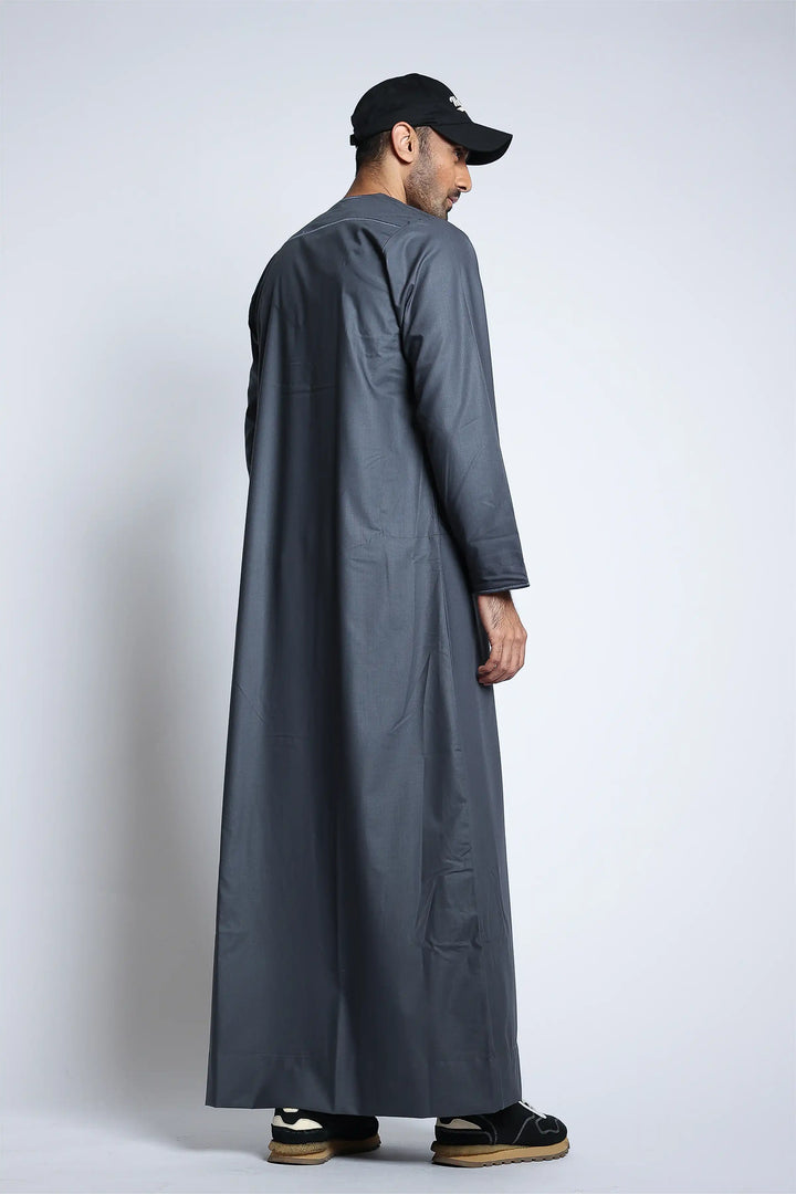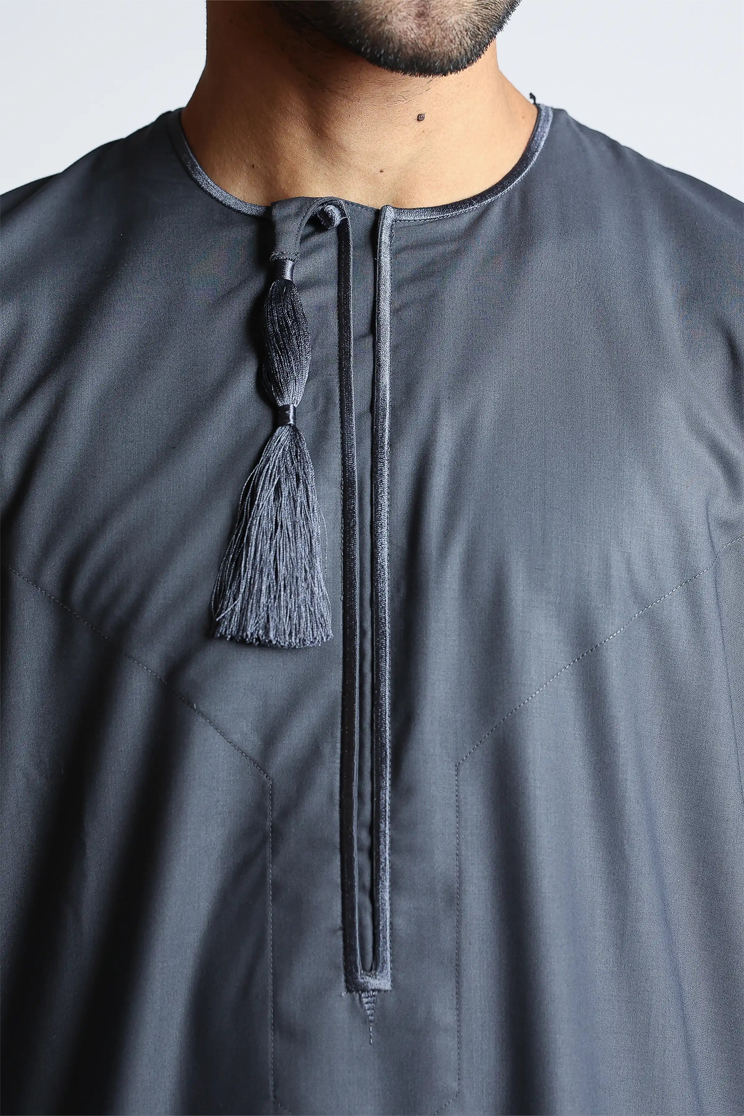 Feel the sophistication and glamour of the Carbon Grey Habeel Thobe! Crafted from a luxurious, soft polyester material and featuring intricate embroidery work with Japan Grey thread, this magnificent thobe will be the showstopper at any event. With two side pockets, side tassels, and a matte finish, you can feel confident in the quality and design of this statement piece!