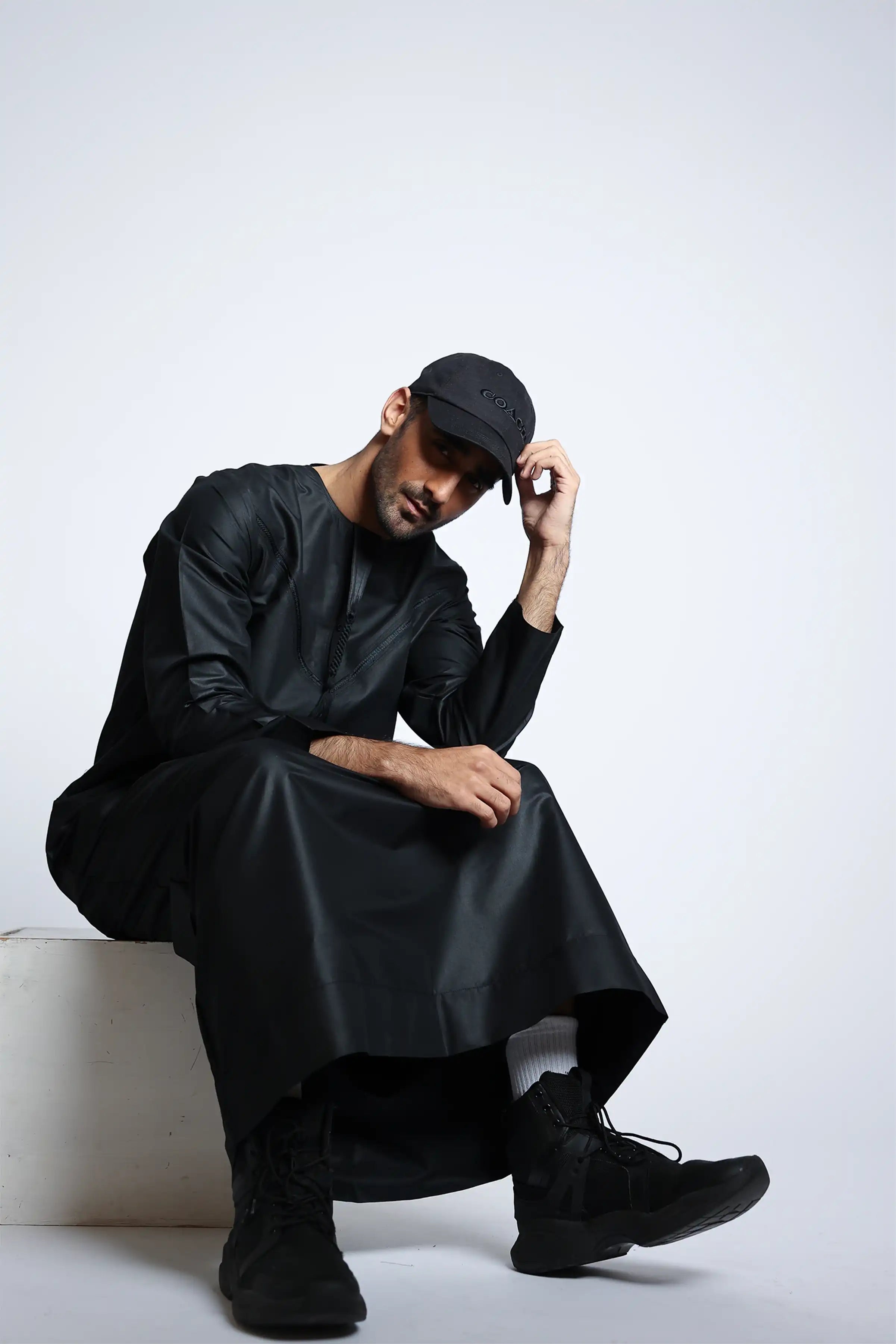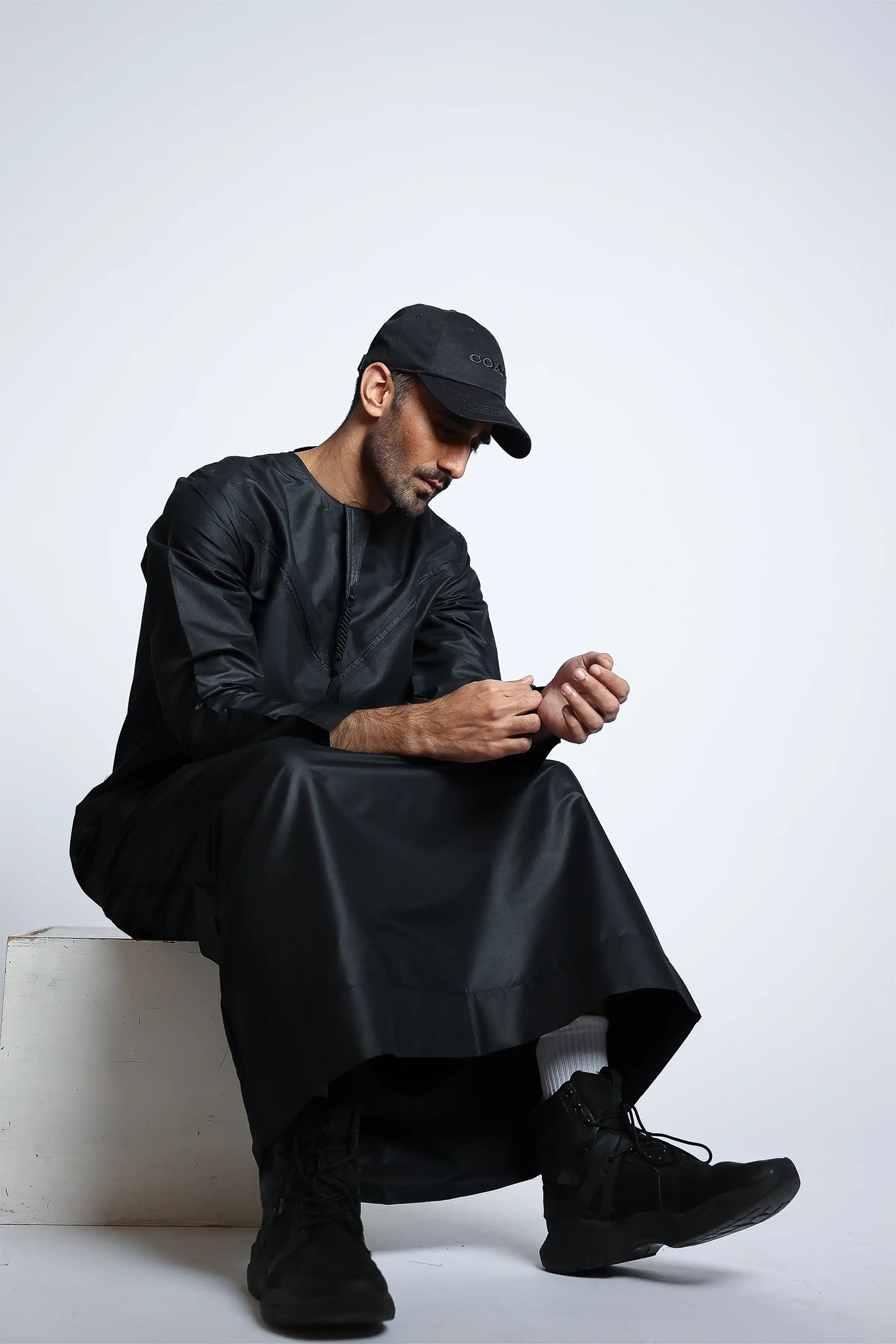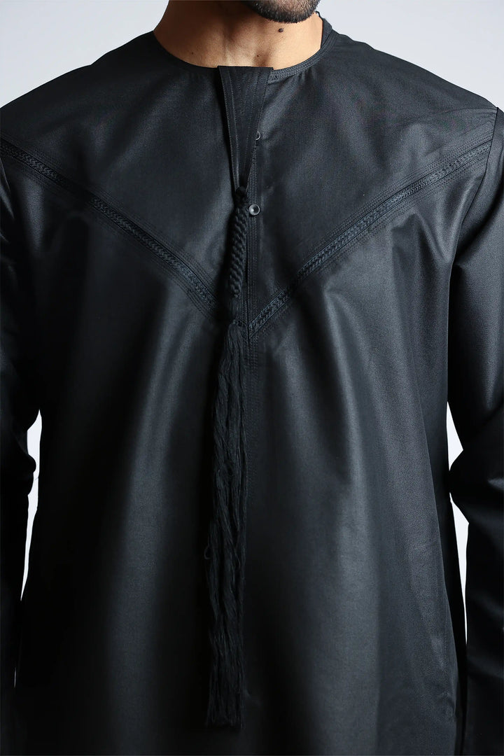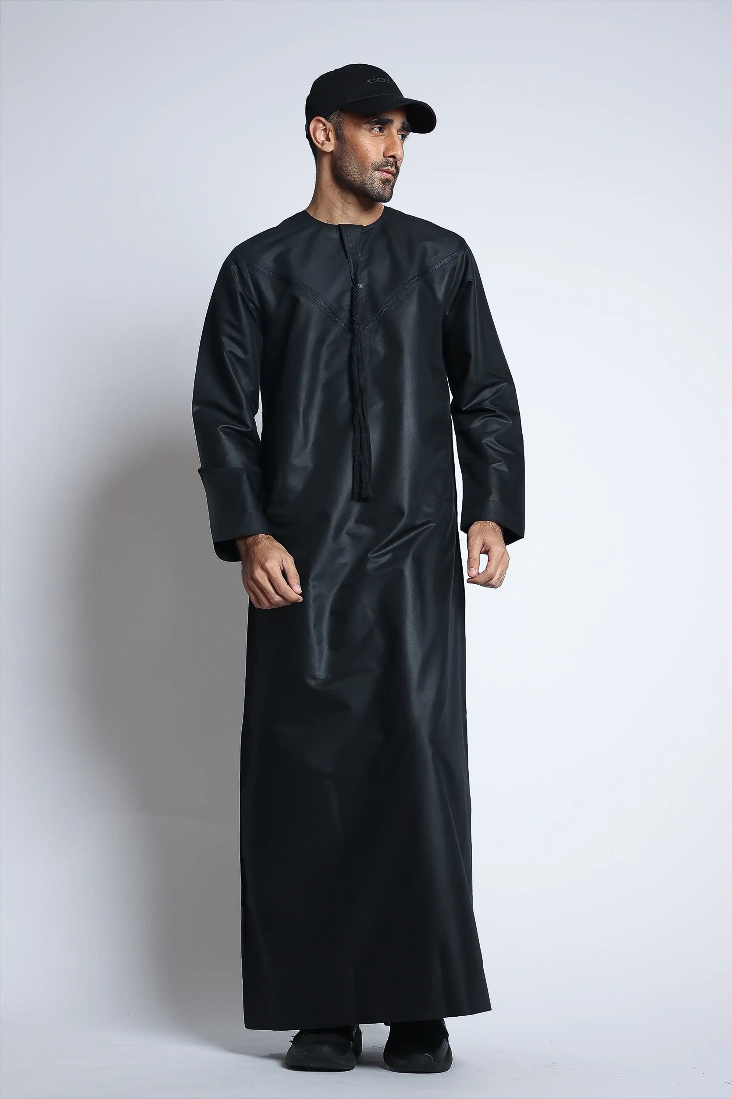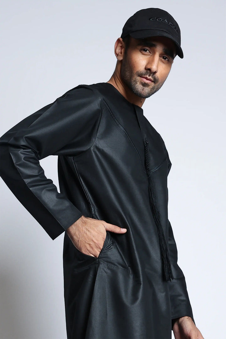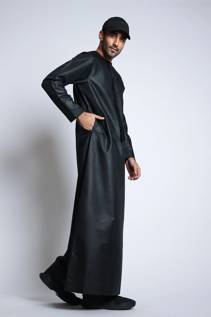 If there's one item that deserves a permanent place in your smart/casual line-up, it's the Black Emirati Kandura Omani Thobe. Al Noor Collection Black Emirati Thobe Removable Tassel Strong Metal Press Button Opening Side pockets on each side The Emirati Kandura Omani Thobe is made from soft, breathable fabric and is designed to provide comfort and style. It features a removable tassel, strong metal press button opening and pockets on both sides.
