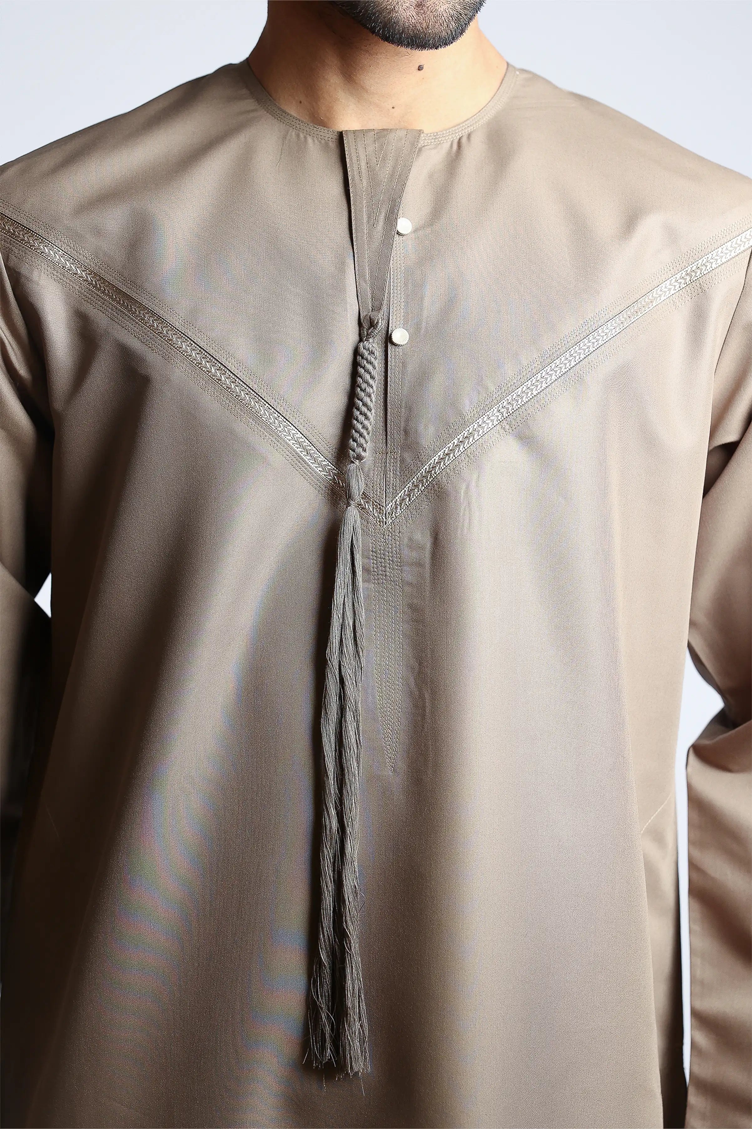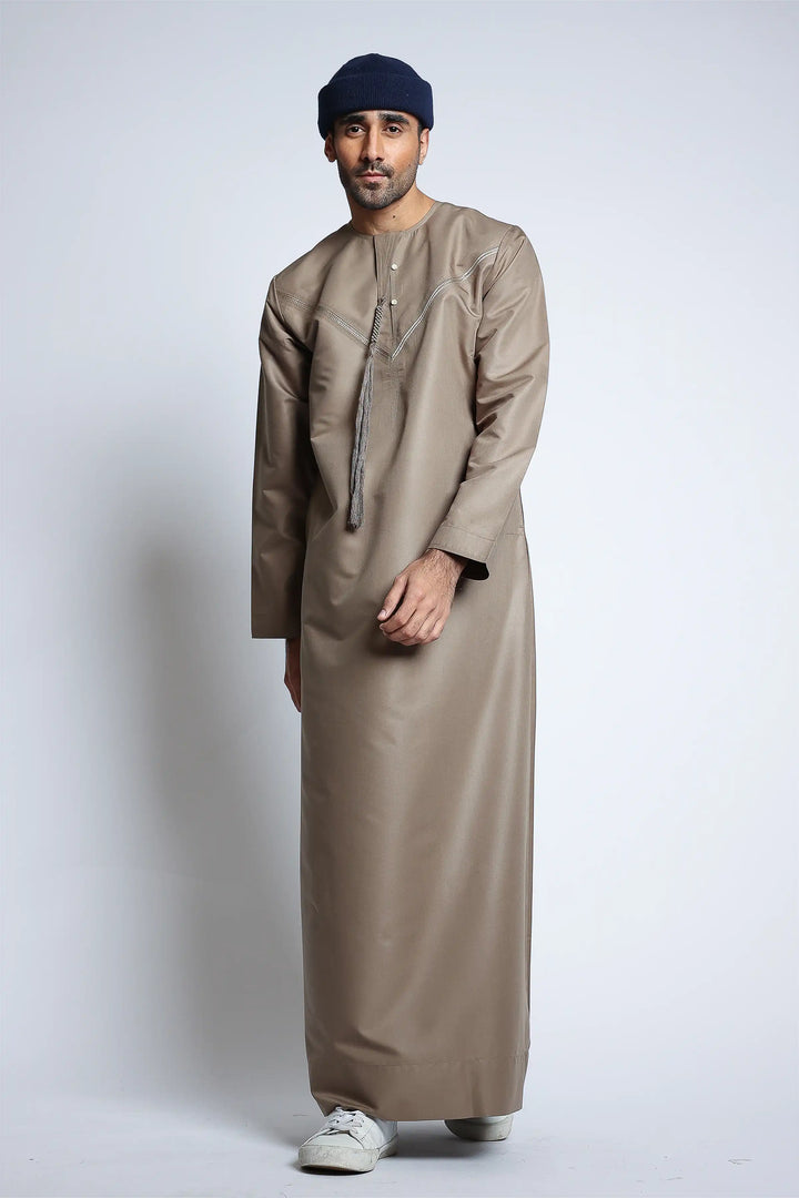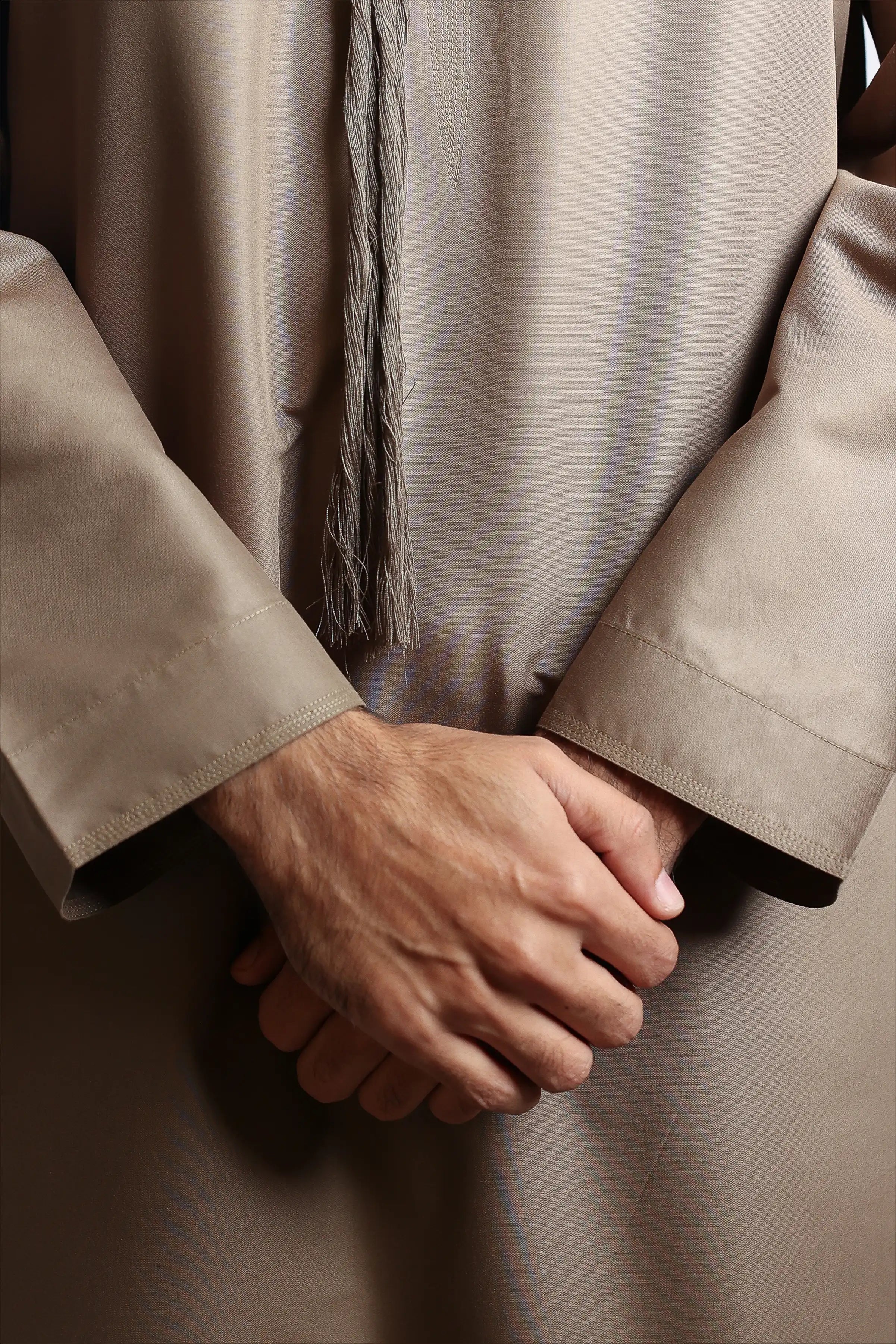 If there's one item that deserves a permanent place in your smart/casual line-up, it's the Cobblestone Emirati Kandura Omani Thobe. Al Noor Collection Cobblestone Emirati Thobe Removable Tassel Strong Metal Press Button Opening Side pockets on each side The Emirati Kandura Omani Thobe is made from soft, breathable fabric and is designed to provide comfort and style. It features a removable tassel, strong metal press button opening and pockets on both sides.