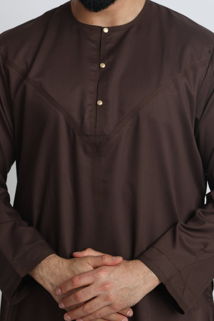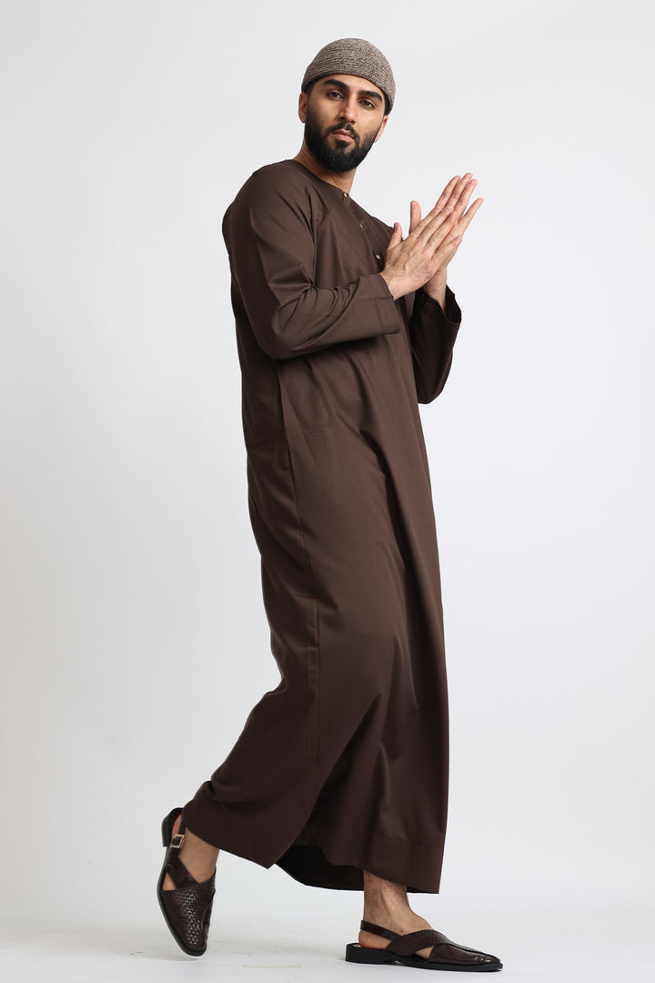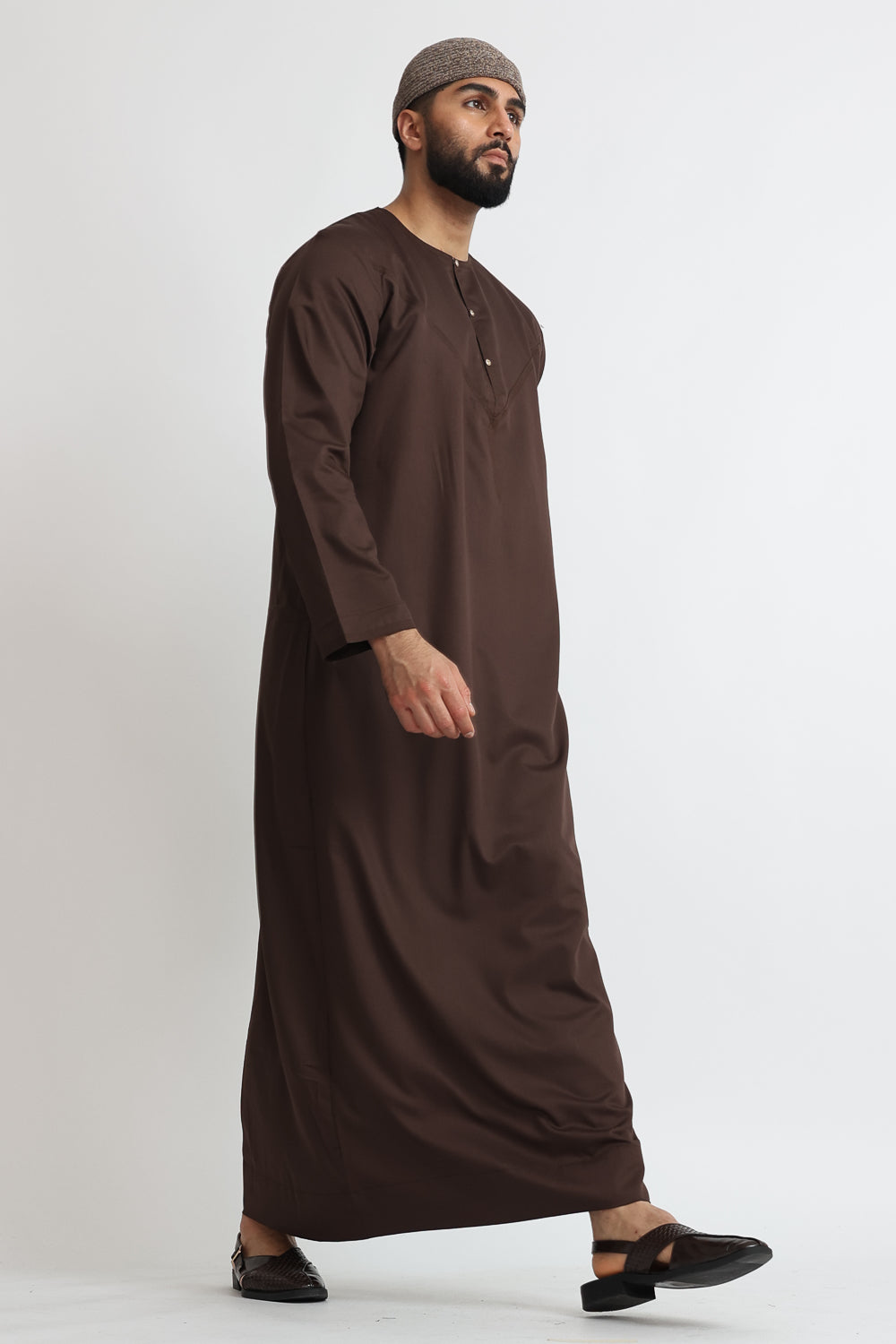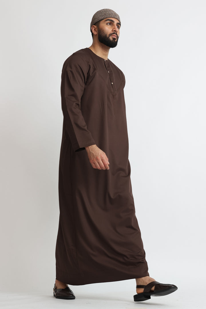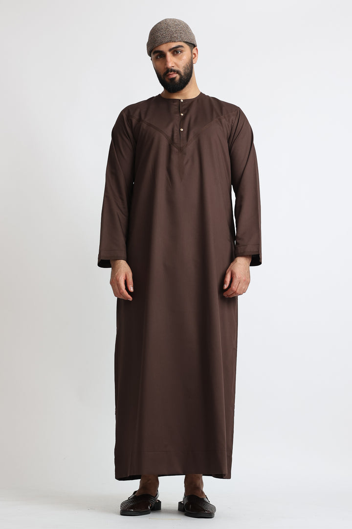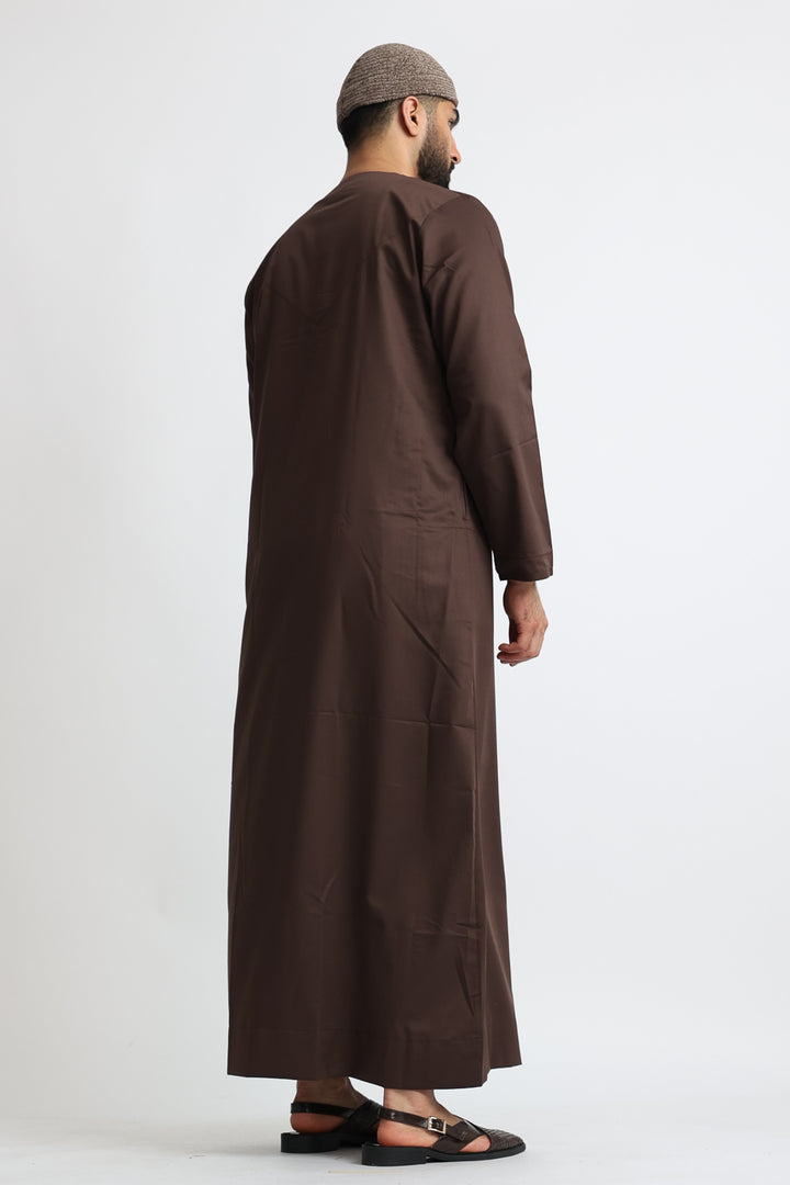Experience the luxurious comfort and effortless style of our Brown Omani. Crafted by Al Noor Thobe and soft matt fabric, this traditional thobe features a stylish press metal button opening, 2 side pockets for added convenience, and meticulous stitching. Elevate your wardrobe with this elegant piece.