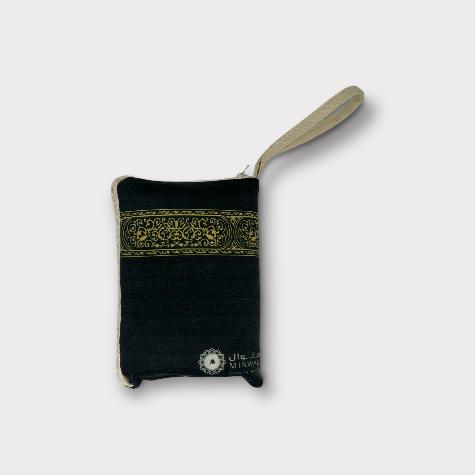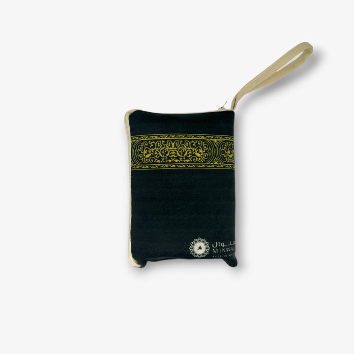 Travel Prayer Mat with a design of Al kaaba and its distinctive black color and foldable size easily. Soft prayer mat with a luxury finish.