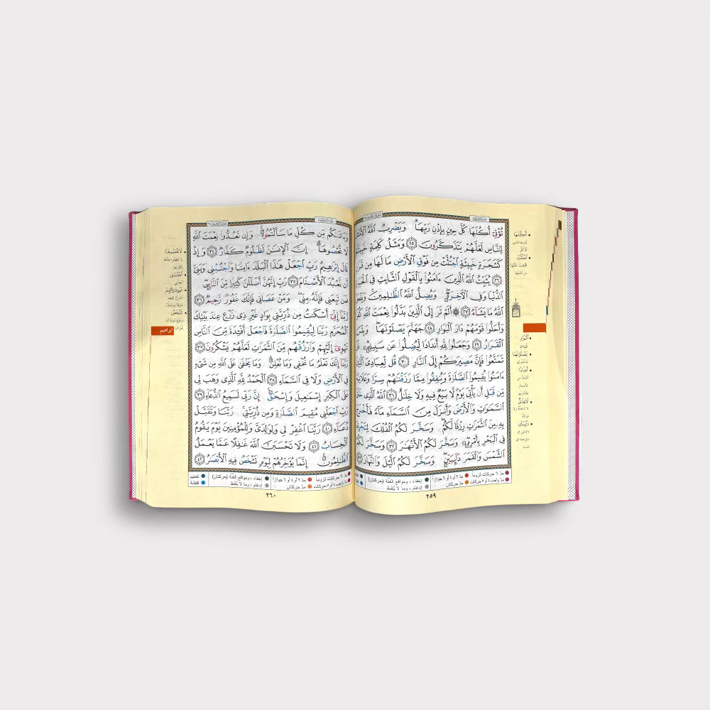 The Prophet Muhammad (PBUH) said, “The best of you are those who learn the Qur’an and teach it" Source: Bukhari no. 5027, Tirmidhee no. 2909 – [Sahih] What better way teaching it than by gifting it - A Rainbow Quran is the perfect gift for any occasion. Beautiful etched leather cover with a smooth matte finish Arabic Only Uthmani Script Coloured pages as per the photos shown with each 4 Ajza' in a different colour Product colour may slightly vary due to photographic lighting sources or your monitor setting.