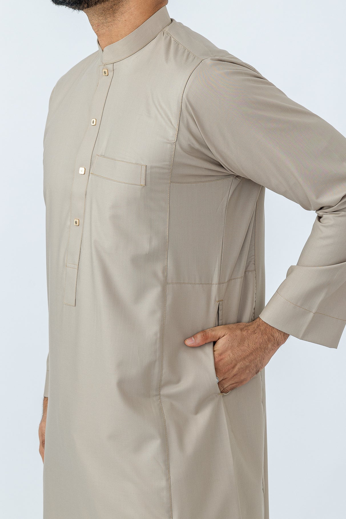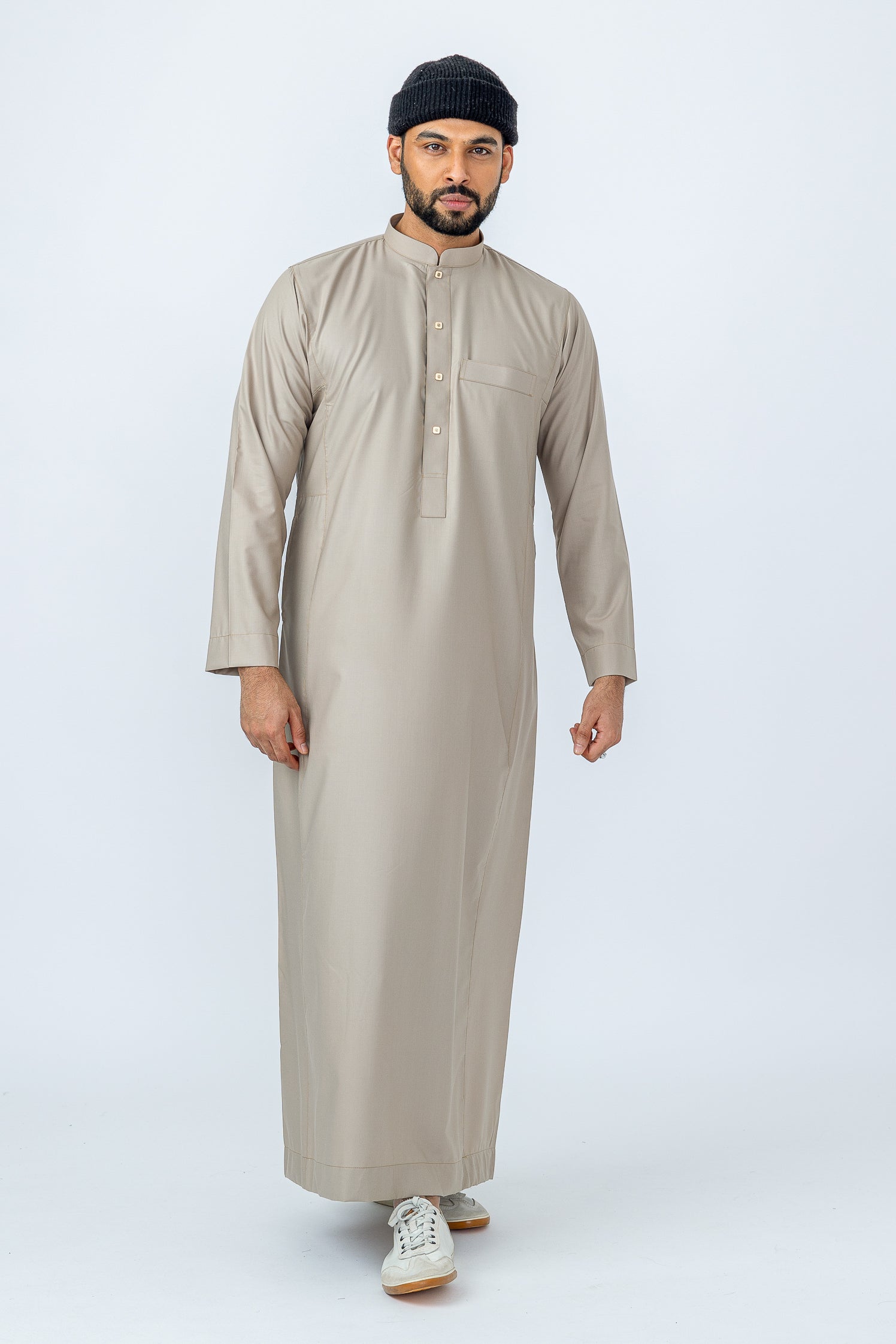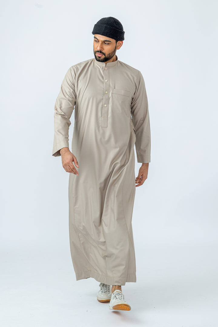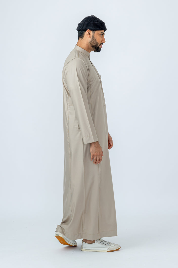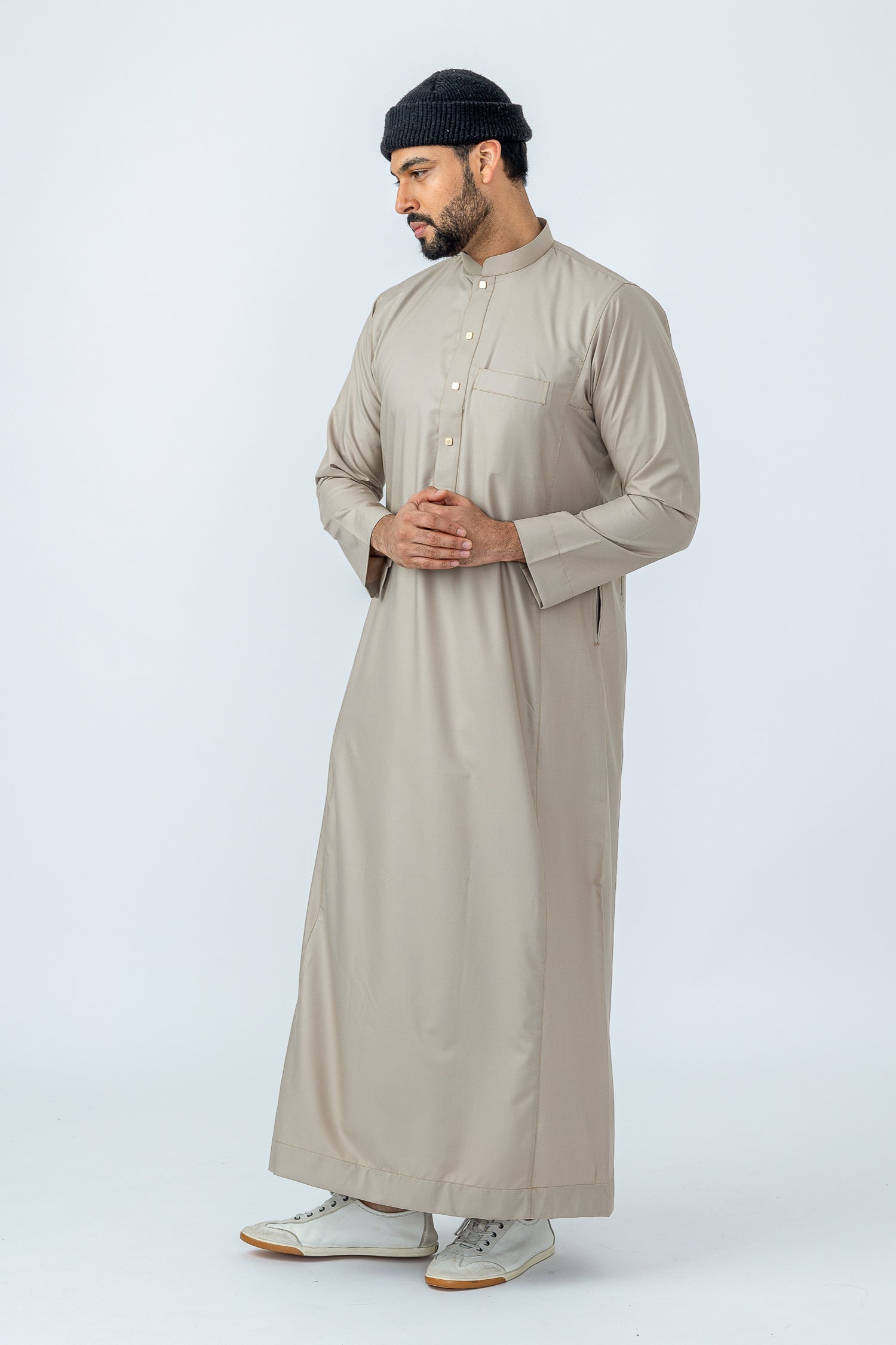 Our Light Beige Arab Collar is part of our Al Noor Collection, perfect for everyday wear. Its simple design is carefully crafted with a soft split collar, metal press buttons, and soft polyester fabric. It also features two side pockets and a left chest pocket to store your belongings. Experience the comfort of our Light Beige Arab Collar.