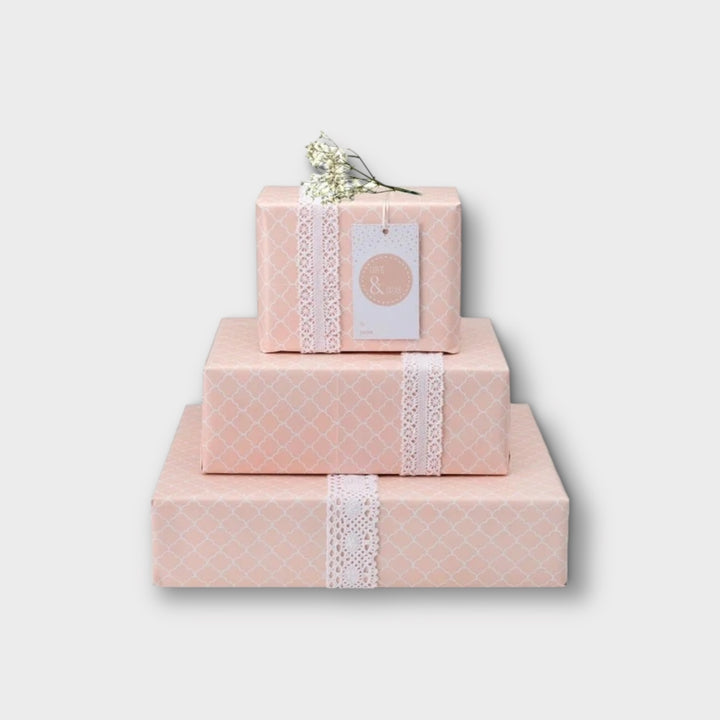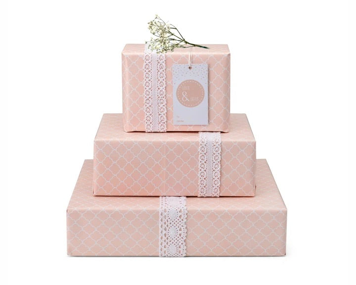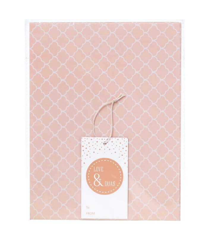 Gift wrapping for by Islamic Moments. A bright and colourful gift wrap with our signature trellis design in Blush and complemented with a strung gift tag. Pack all your fabulous gifts in this elegant Love and Du'as gift wrap.