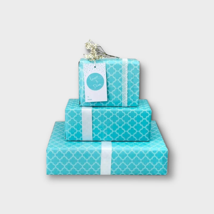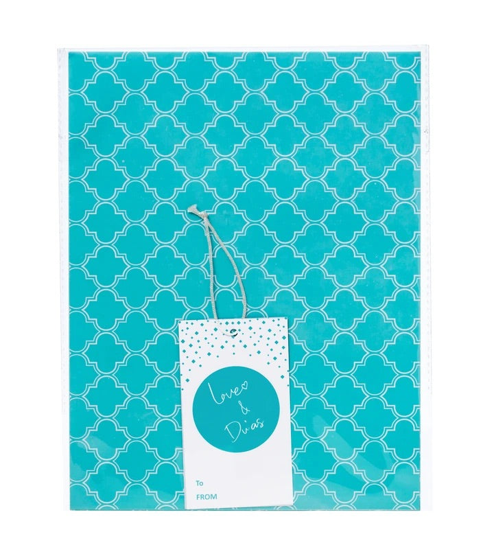 Gift wrapping for by Islamic Moments. A bright and colourful gift wrap with our signature trellis design in Aqua and complemented with a strung gift tag. Pack all your fabulous gifts in this elegant Love and Du'as gift wrap.