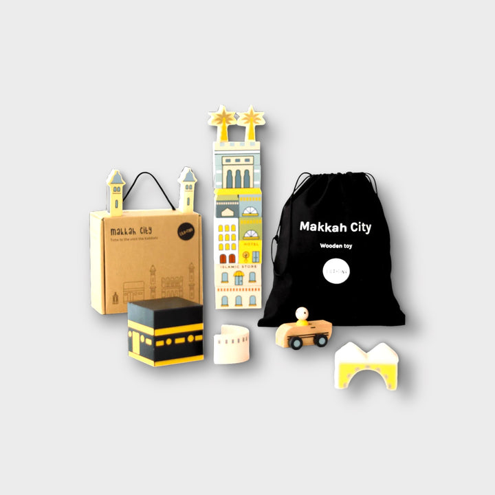 Comes with 26 different wooden figurines, from a Kaabah, Kaabah Gate, Minarets, Maqam Ibrahim, Hateem, Car, Pegdoll and several town elements all detailed illustrations on both side. The Makkah City Set includes a drawstring bag for those tidy up times.
