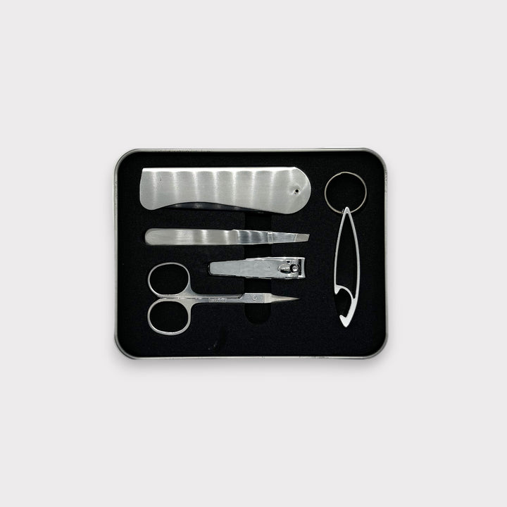 - All-in-one grooming & travel kit for gents - essential tools in a sleek metal case