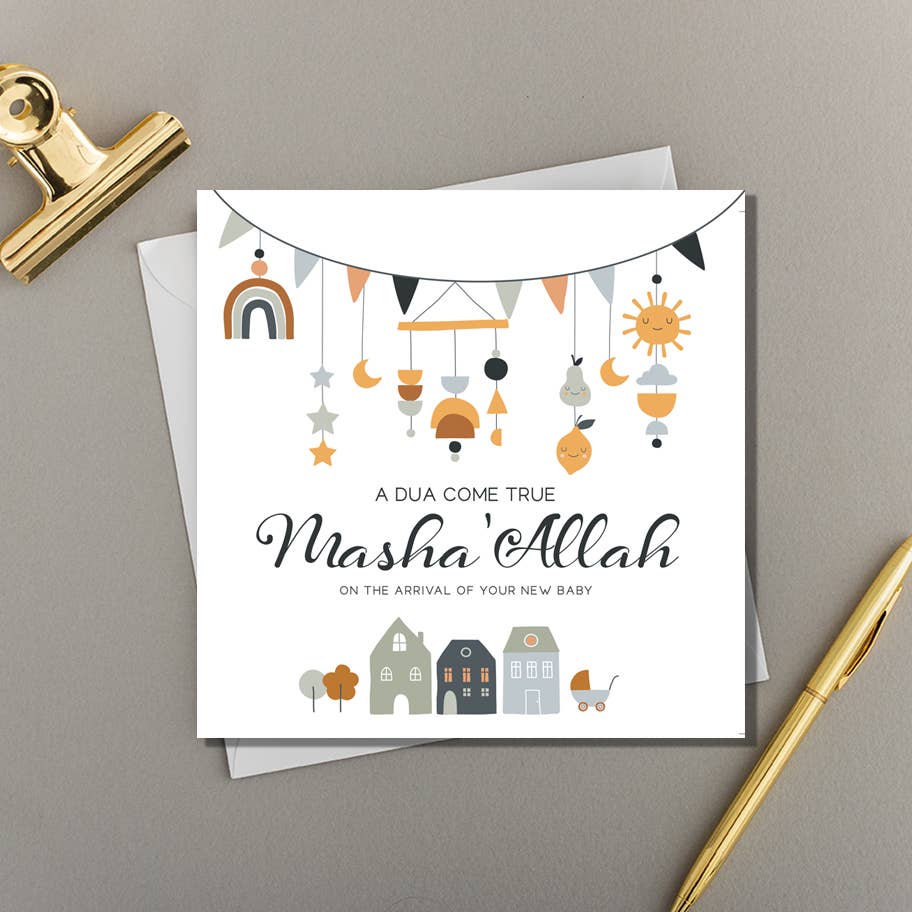 A contemporary Baby graphic design card featuring a hanging washing line perfect for a Boy or Girl! Card Reads: A Dua (prayer) Come True Masha’Allah On The Arrival Of You New Baby - Proudly designed printed in the U.K