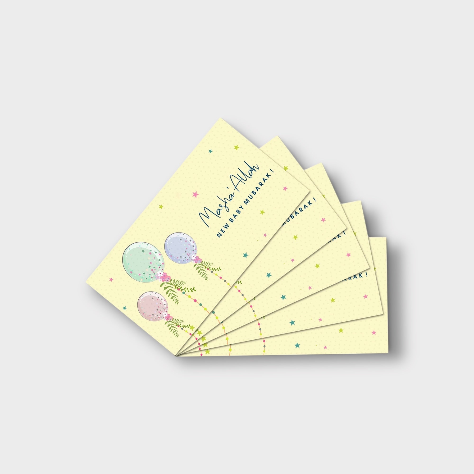 Set of 5 Masha'Allah New Baby Mubarak money wallets from our multi-award-winning stationery collection. Perfect for gifting money, vouchers, or gift cards to friends or relatives with a gorgeous new bundle of joy making a great alternative to presents. The wallets are secured by folding the flap over into a tab. There is provision to write the recipient and senders name on the back of the wallet.