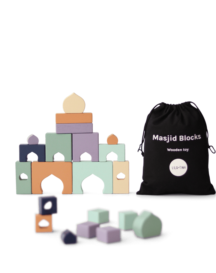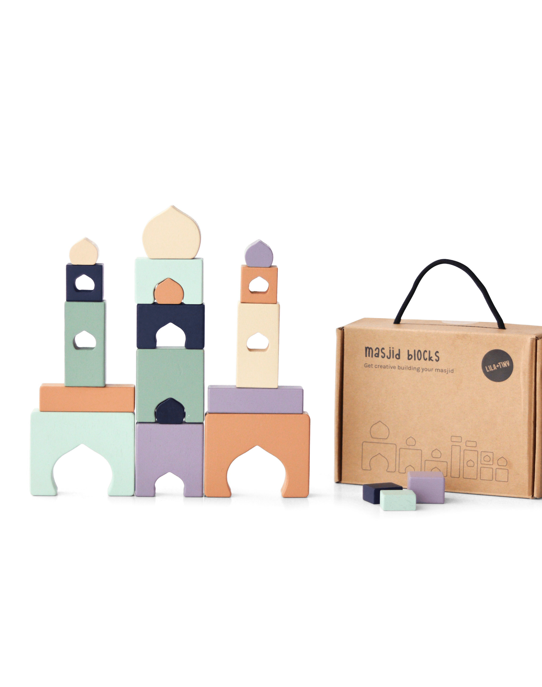 Painted in neutral muted tones, the Masjid Blocks comes with a drawstring bag for those tidy up times!