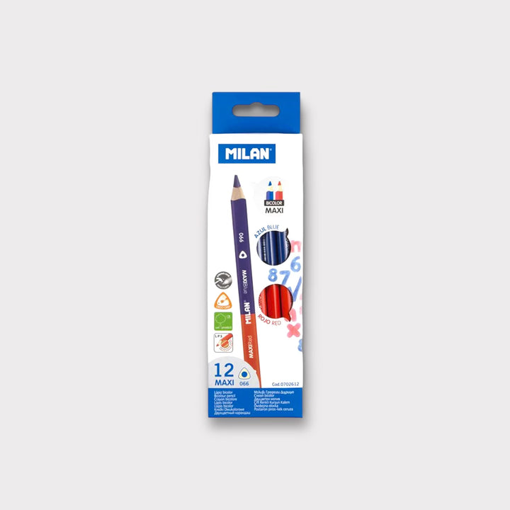 Milan bicolour red-blue MAXI pencils for marking, reviewing, underlining and writing. Lead measures 5 mm Ø. Ergonomic triangular shape. The lead creates a uniform stroke and is resistant to breakage due to its LPS (Lead Protection System) which strengthens the lead by sticking it to the wood.The wood is sourced from sustainable forests.