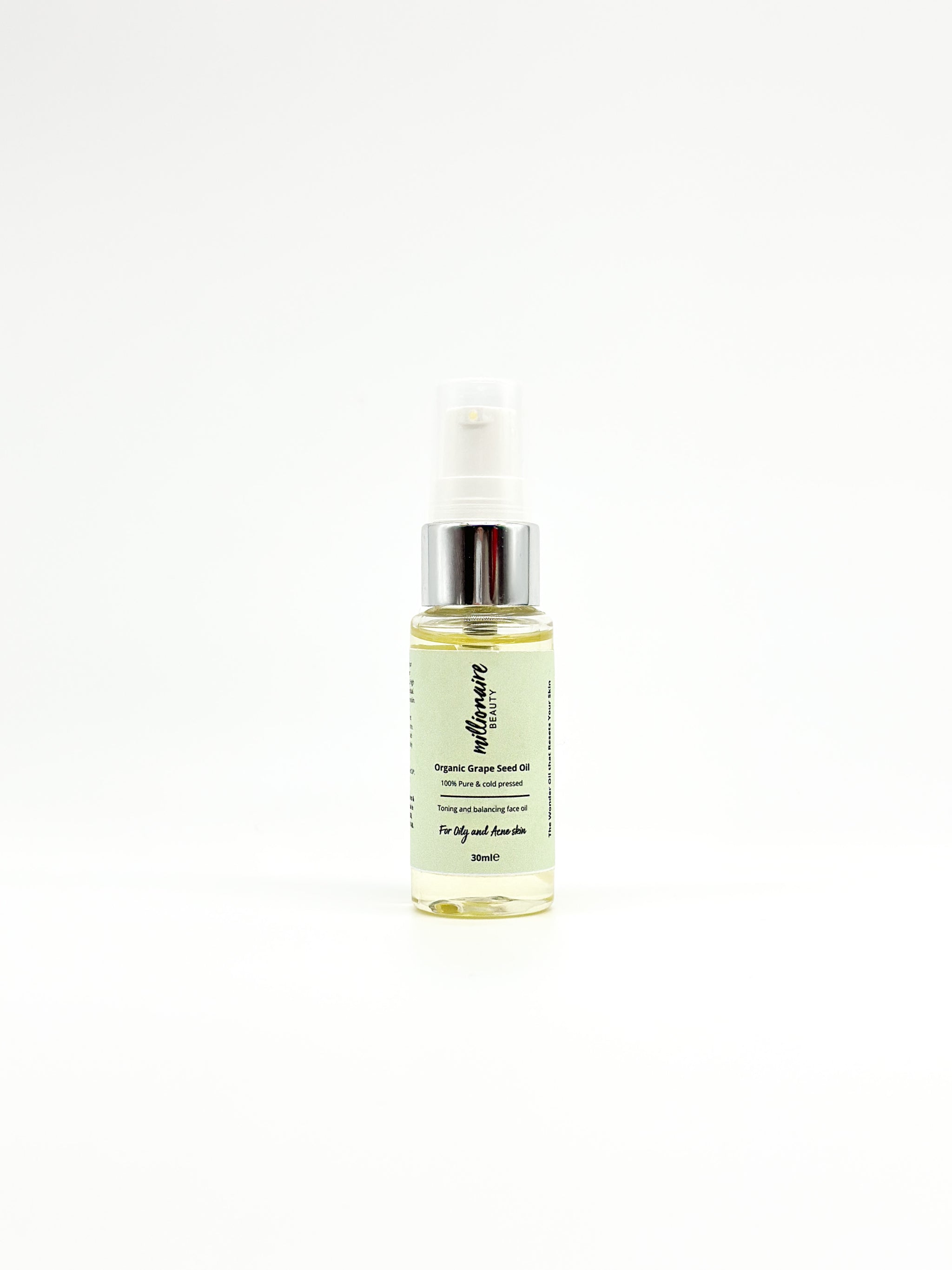 All Natural And Gentle Our Millionaire Grape-seed Oil is super gentle and perfect for combo/oily/ sensitive skin. Apply at the end of your skin care routine and massage into your face until it all soaks in.