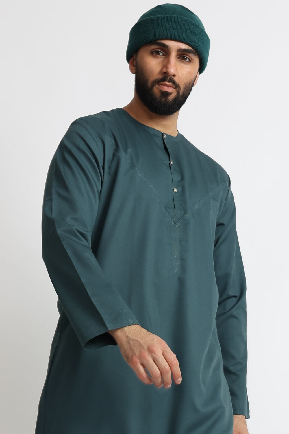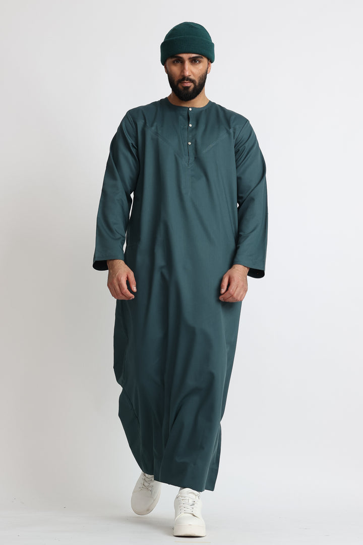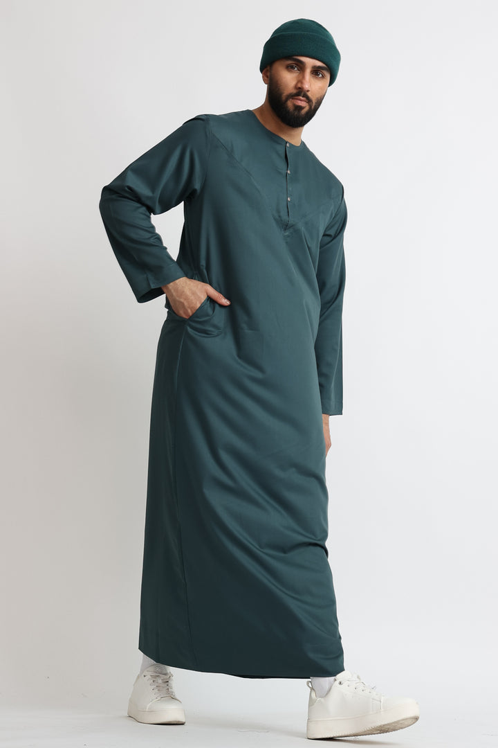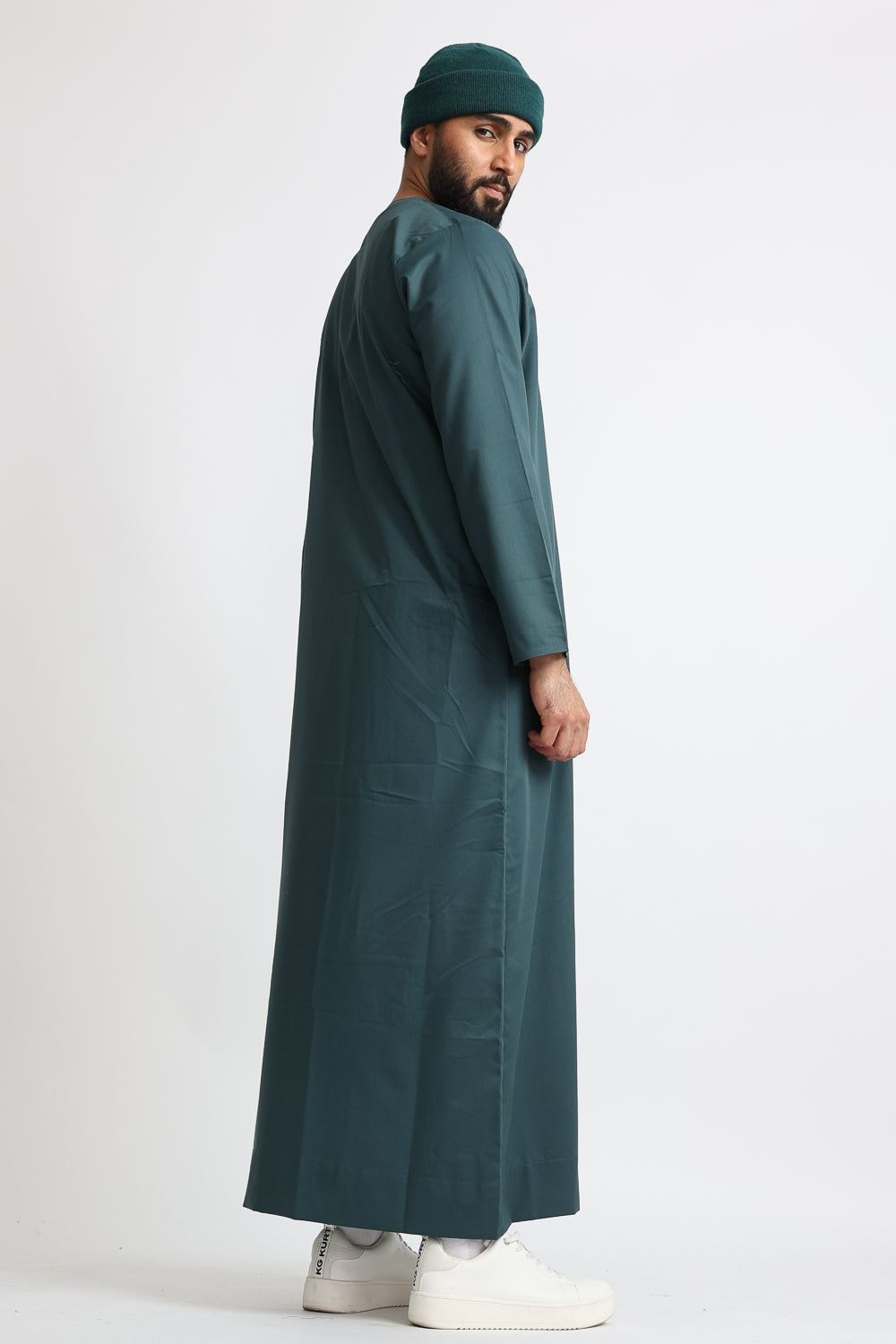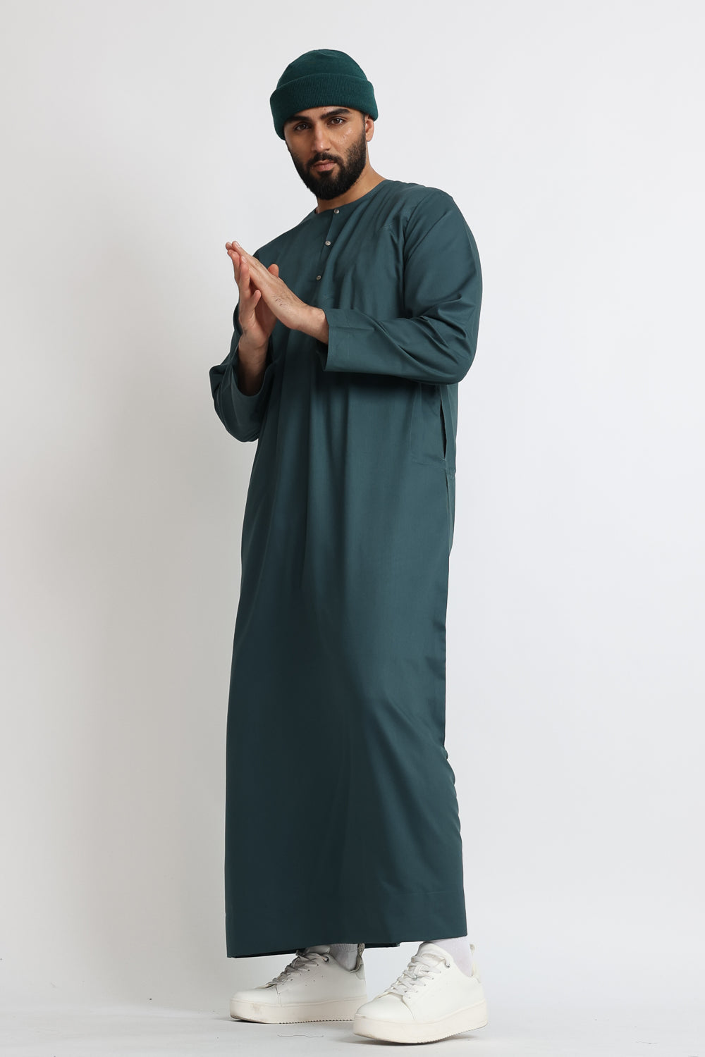 Experience the luxurious comfort and effortless style of our Mineral Green Omani. Crafted by Al Noor Thobe and soft matt fabric, this traditional thobe features a stylish press metal button opening, 2 side pockets for added convenience, and meticulous stitching. Elevate your wardrobe with this elegant piece.
