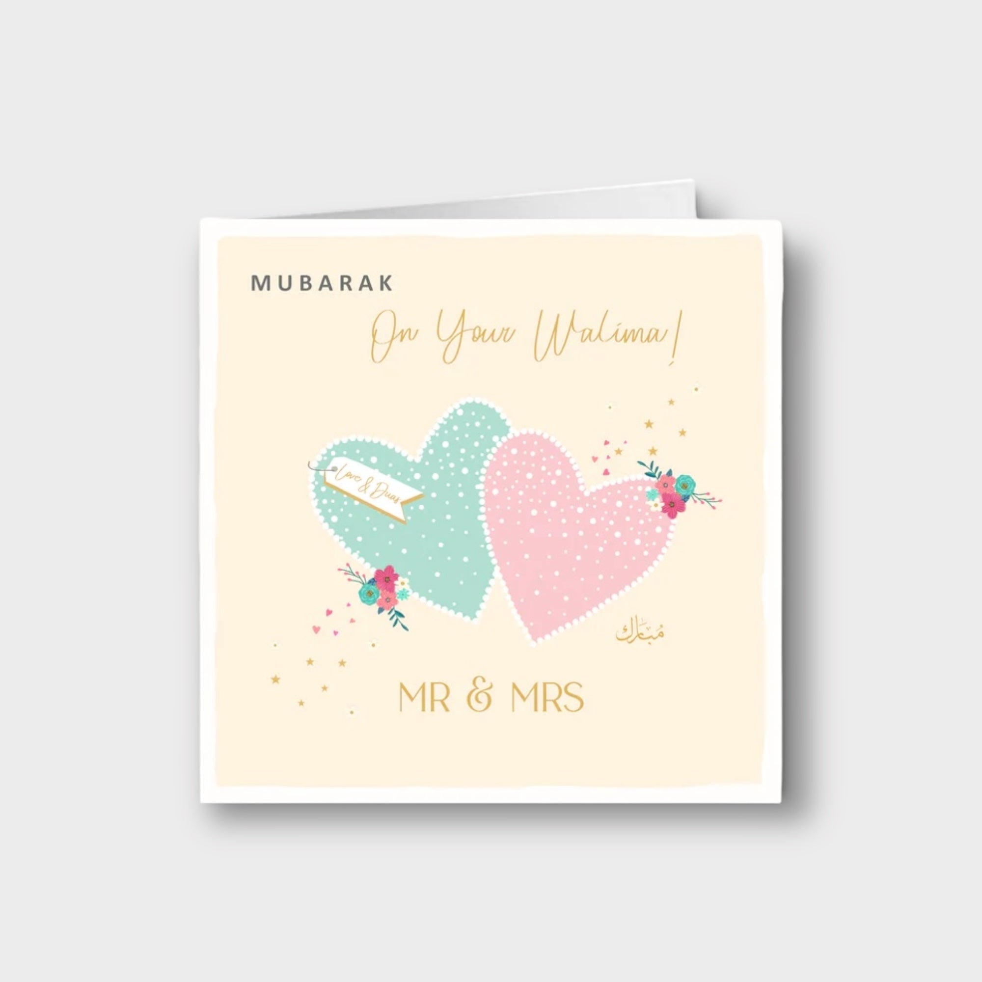 - Mubarak on your Walima! Mr & Mrs. 2 Lovehearts on vanilla background