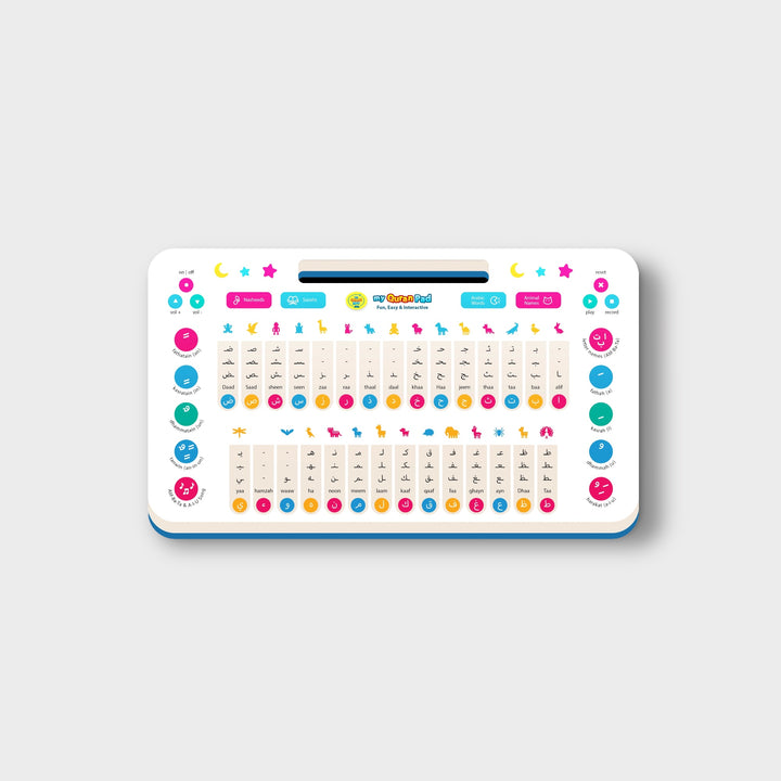Meet My Quran Pad! This Islamic learning tool is designed to teach children the Arabic Alphabet. Each key, when pressed, recites a letter, making learning interactive and fun. But that's not all – My Quran Pad also teaches kids animal names in Arabic, beginner words, introductory Surahs, and lovely Nasheeds. It's more than an educational device, it's a journey into the heart of the Quran and Arabic language.