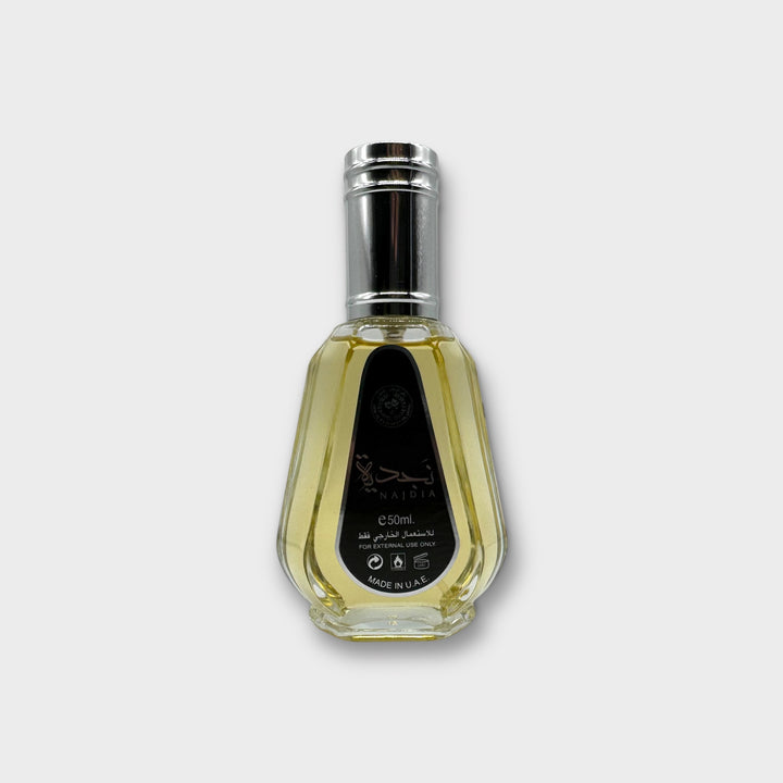 Perfume Oud Najdia Eau de Parfum by Lattafa is a fresh, woody fragrance with spicy notes. The top note commences off with fresh and woody scents of citrus and cedar. The middle note is determined by cinnamon. Further actors are cardamom, rosemary, Oudh, and lavender.