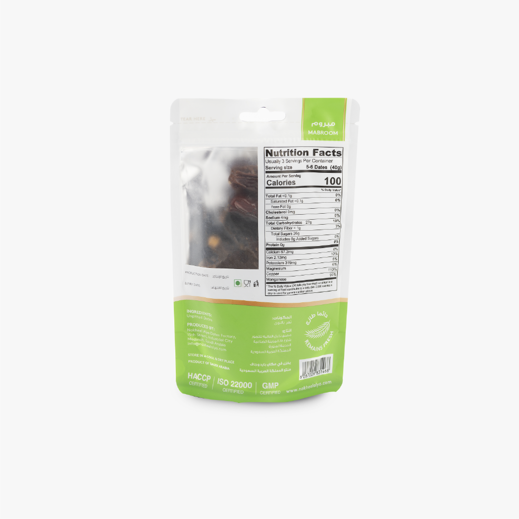 - GREAT ENERGY BOOSTER: A healthy meal replacement! Grown and packed from the natural oases from Madinah, these Mabroom dates are the best source of iron which helps to treat Anemia. Not only has high nutritional values but also our Madinah dates sound great in taste. A perfect pick to enjoy your snack time