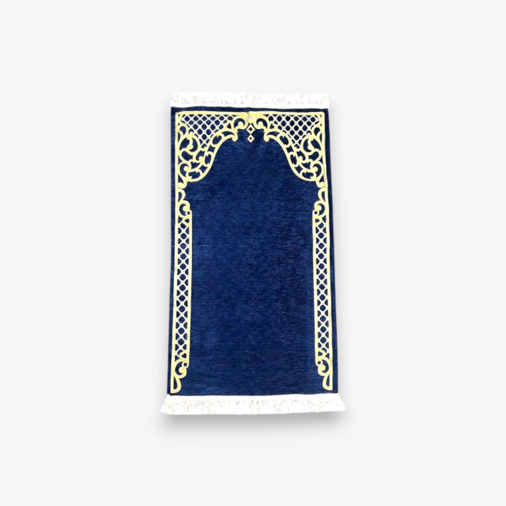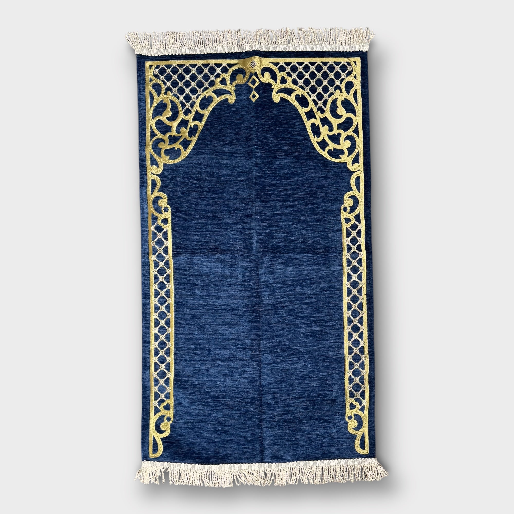 Deep navy blue creates a regal foundation for this distinguished prayer mat. The rich color is perfectly balanced with gleaming gold border work, featuring precise geometric patterns and flowing arabesque motifs. The mihrab arch stands out beautifully against the deep blue background, while the white fringed tassels provide an elegant contrast at each end.