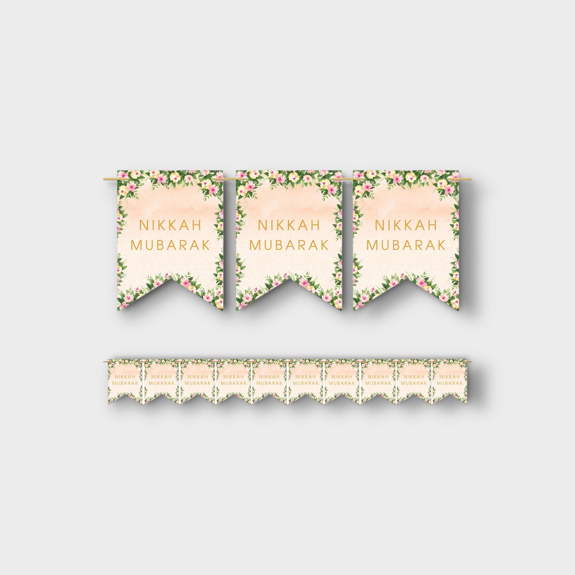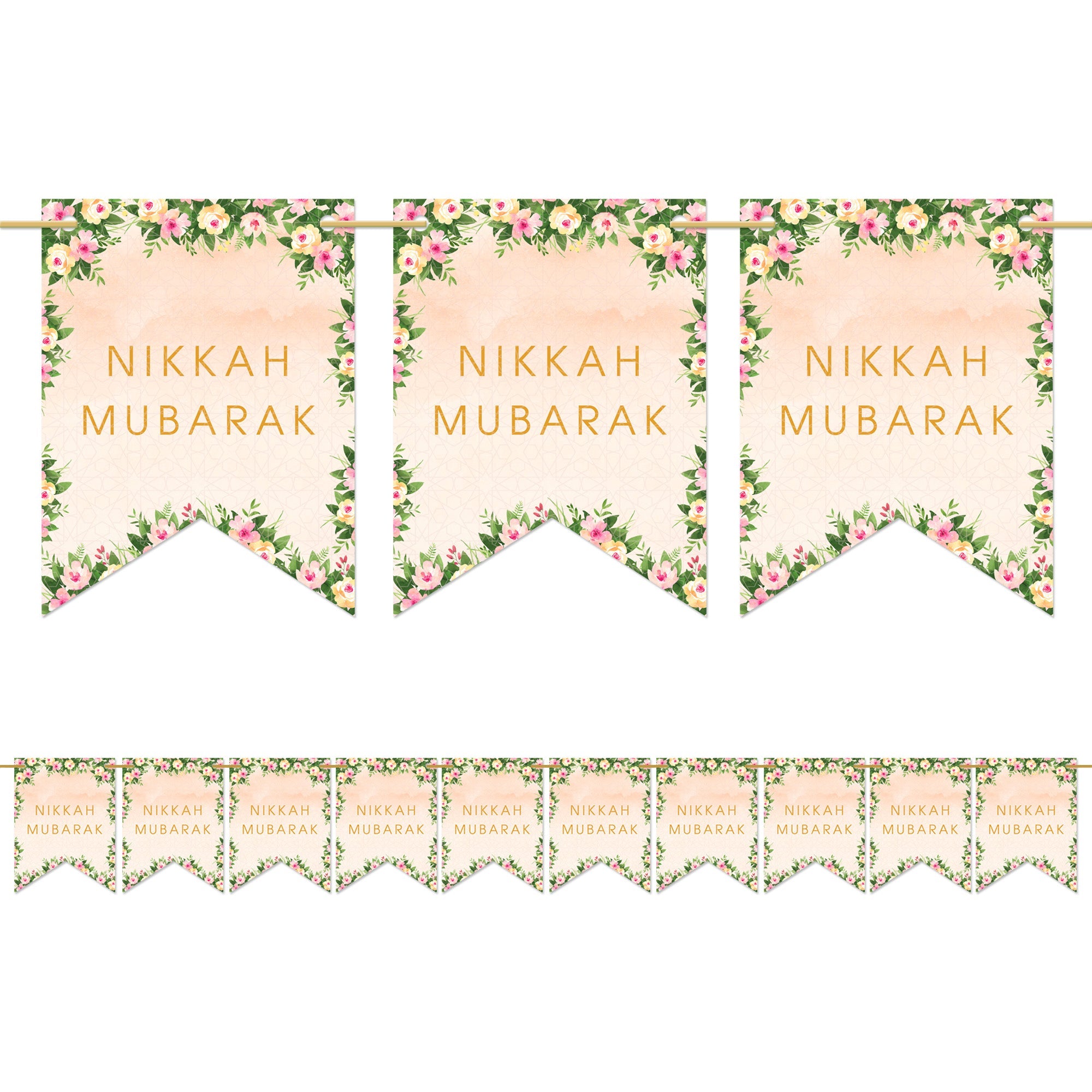 Our new 'Nikkah Mubarak' pennant shaped bunting is printed on both sides and comes with 3 metres of satin ribbon. A rich and bold new product with contemporary styling. Bring warmth and joy to your home and wedding venue with this stylish pack of reusable, double sided party bunting.
