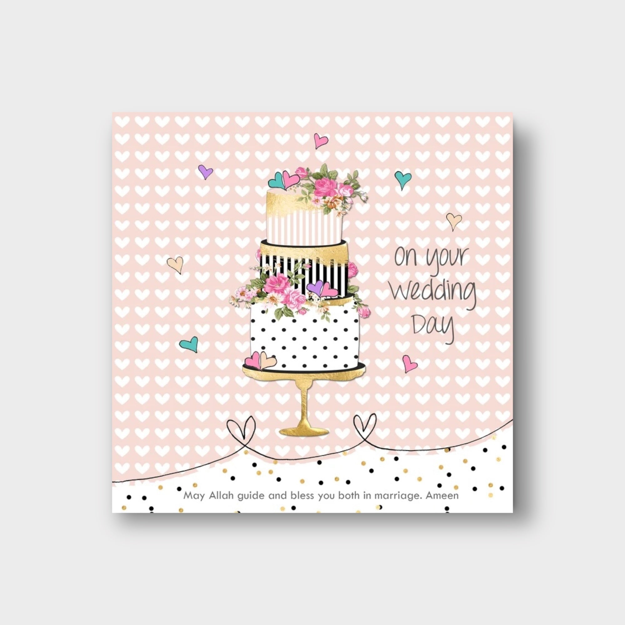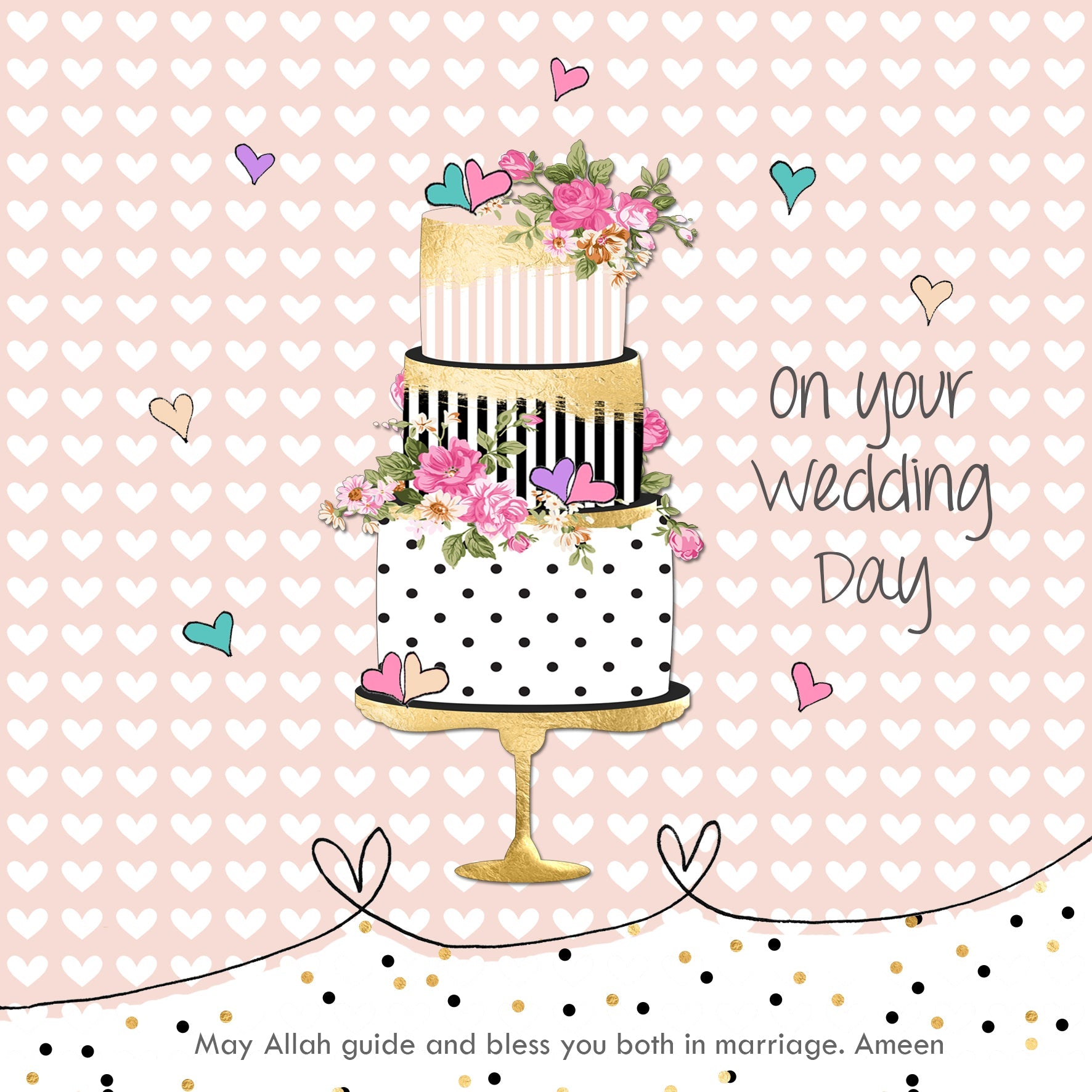 An elegant Islamic wedding card with a Du'a for the new couple : "May Allah guide and bless you both in marriage. Ameen". Elegant hand drawn 3 tier wedding cake illustration on love-heart background, this charming wedding card is from our new 'Bunting & Borders' series of Islamic greeting cards.