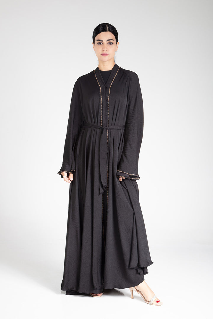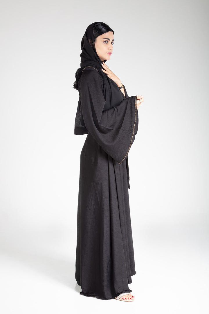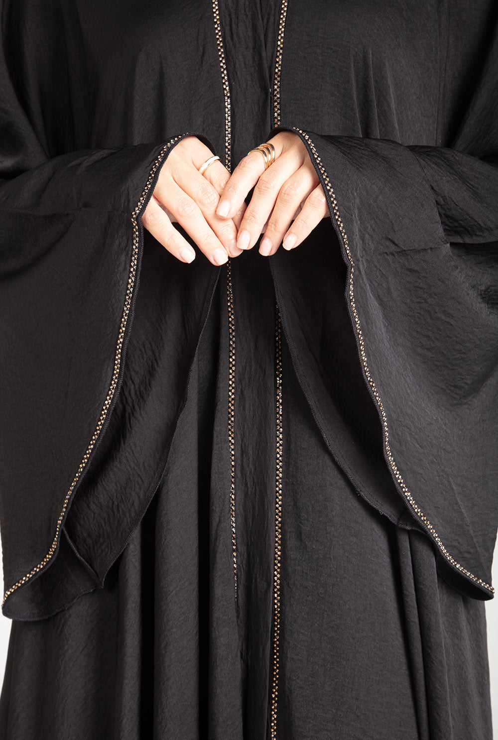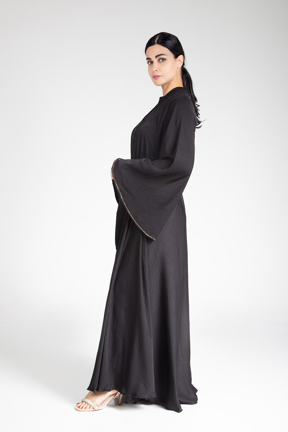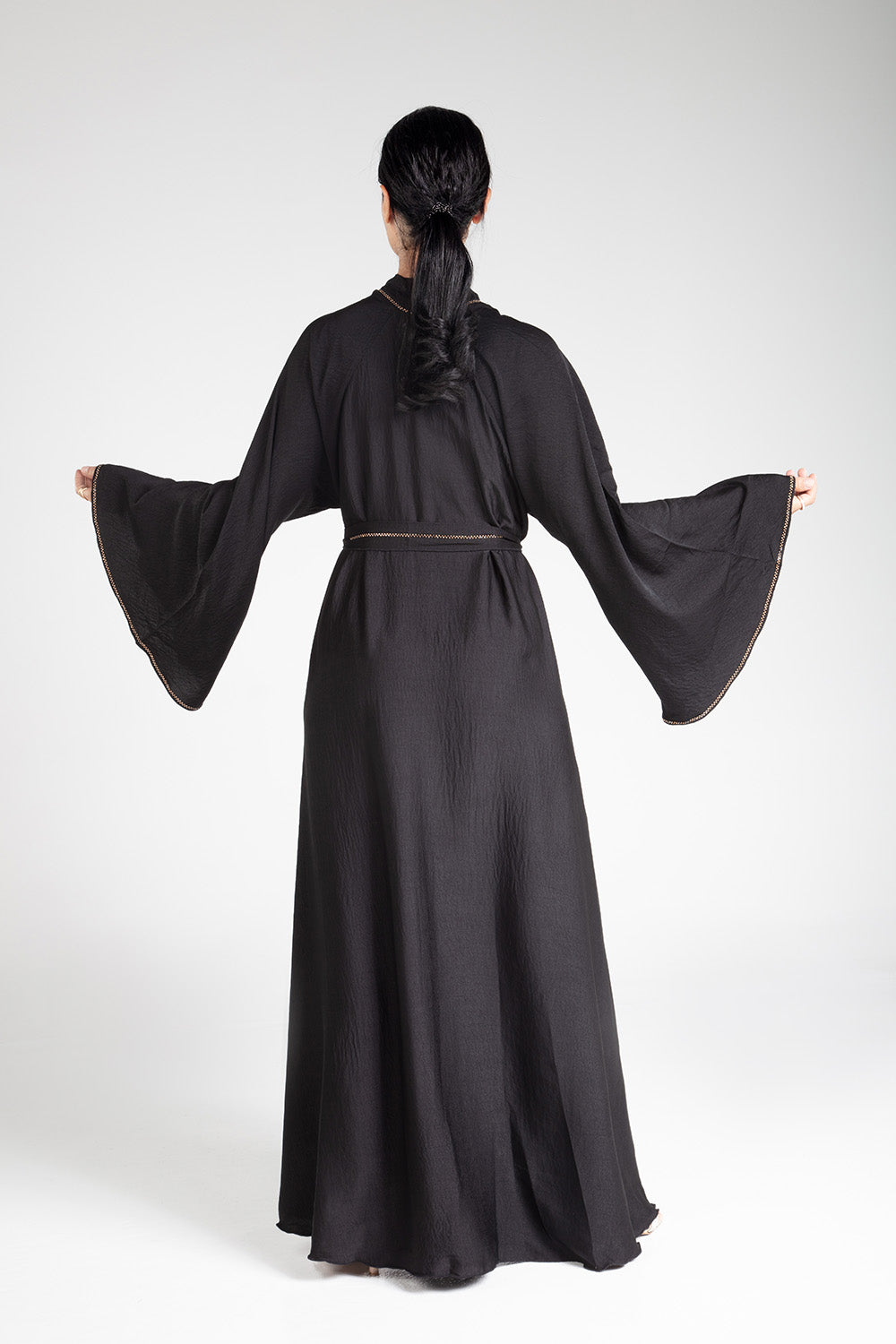 The Twilight Trim Abaya is a masterpiece of understated elegance, designed for versatile wear from day to night. This abaya is beautifully crafted from a lightweight, fluid fabric that drapes gracefully. It features meticulous copper and bronze beadwork along the neckline, placket, and cuffs, adding subtle shimmer. With its flared sleeves and cinching waist tie, it offers a universally flattering silhouette. The deep charcoal color enhances its timeless charm, making it a perfect choice for various occasions