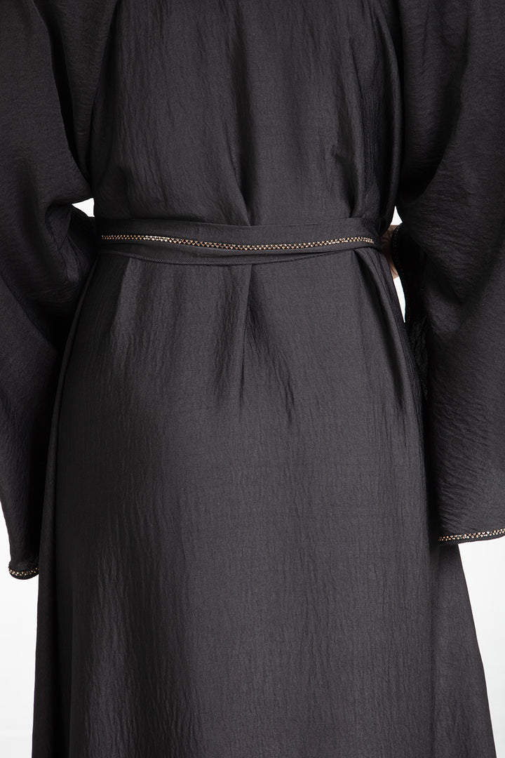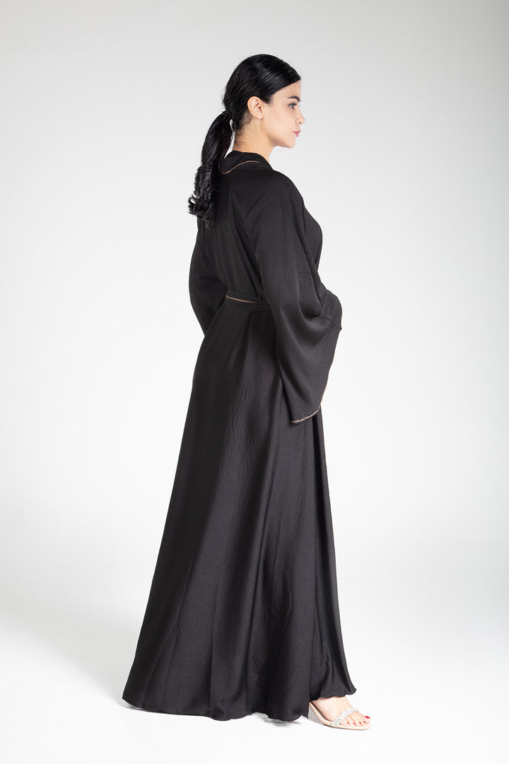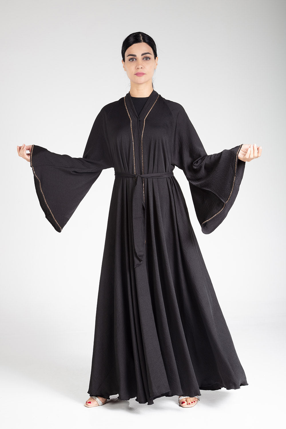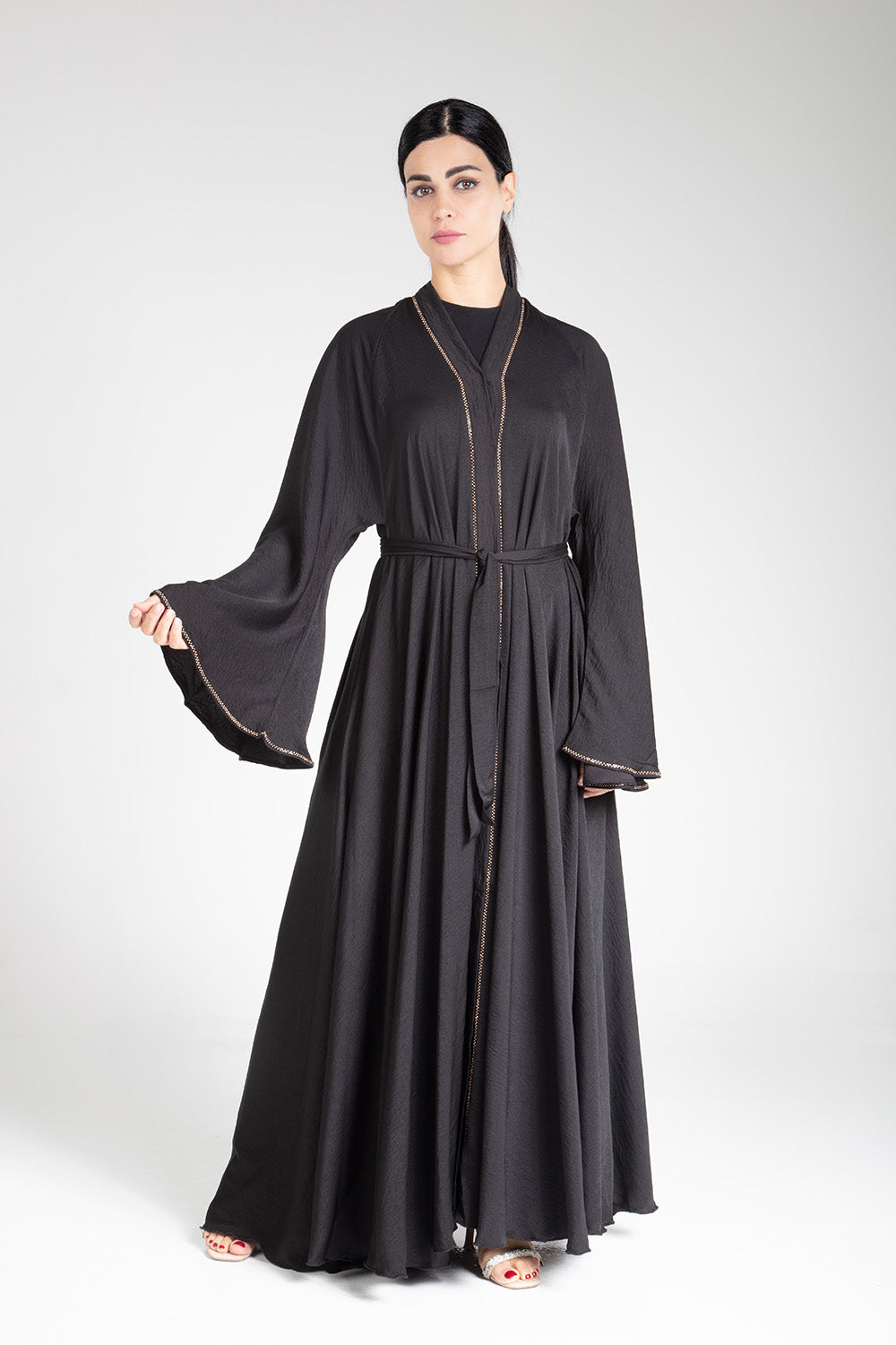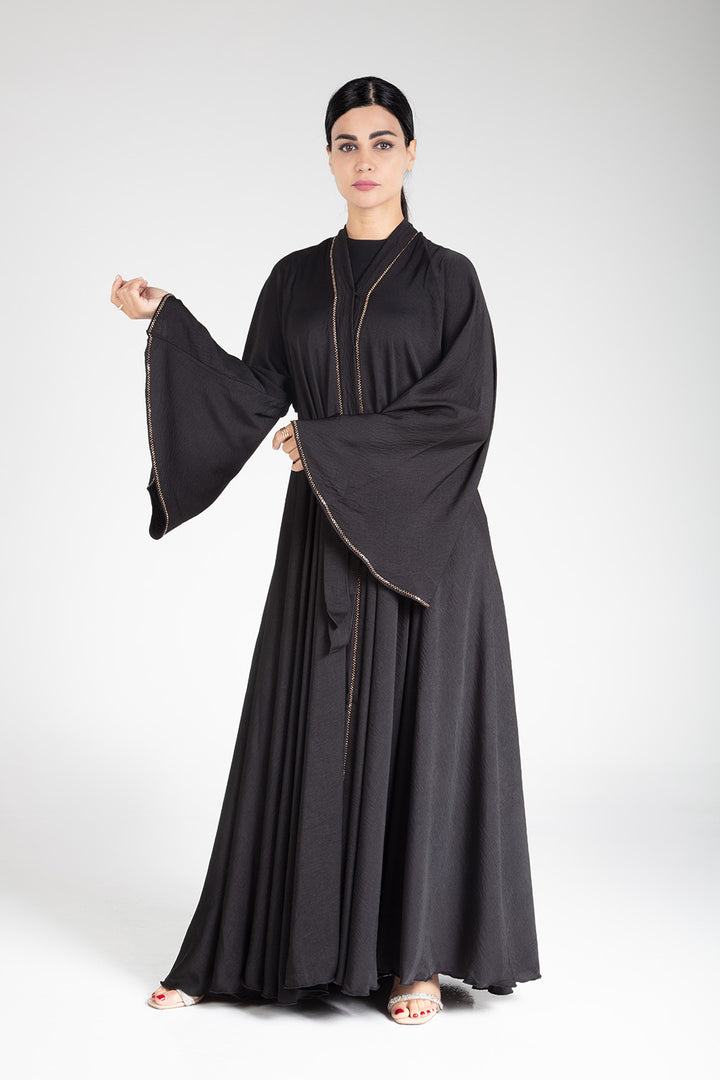 The Twilight Trim Abaya is a masterpiece of understated elegance, designed for versatile wear from day to night. This abaya is beautifully crafted from a lightweight, fluid fabric that drapes gracefully. It features meticulous copper and bronze beadwork along the neckline, placket, and cuffs, adding subtle shimmer. With its flared sleeves and cinching waist tie, it offers a universally flattering silhouette. The deep charcoal color enhances its timeless charm, making it a perfect choice for various occasions