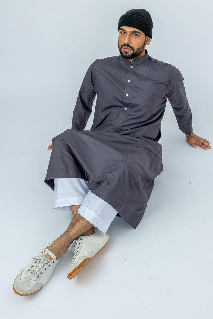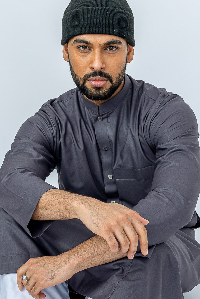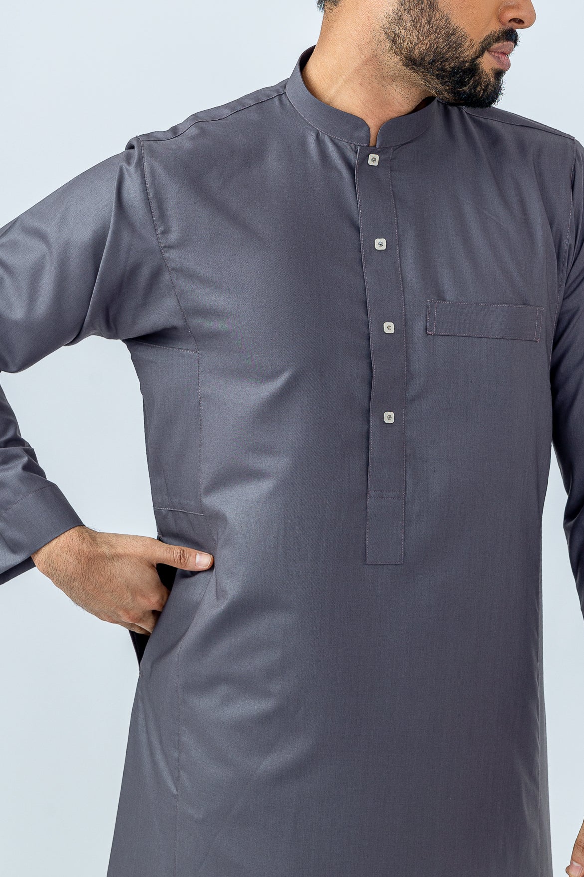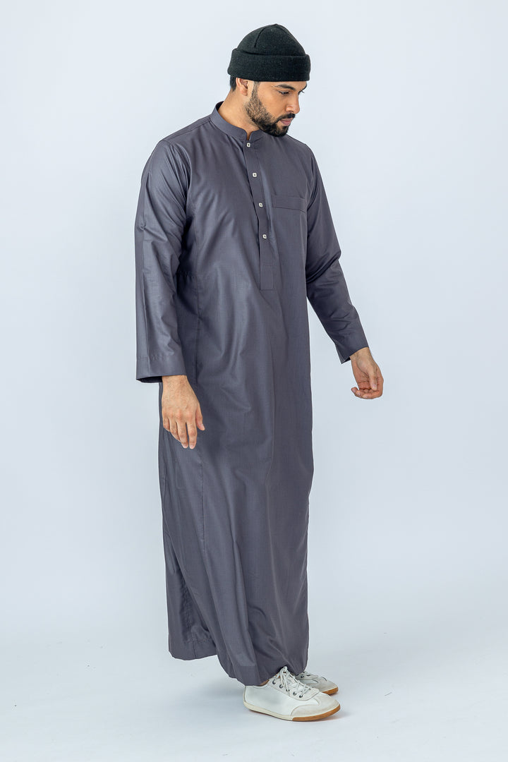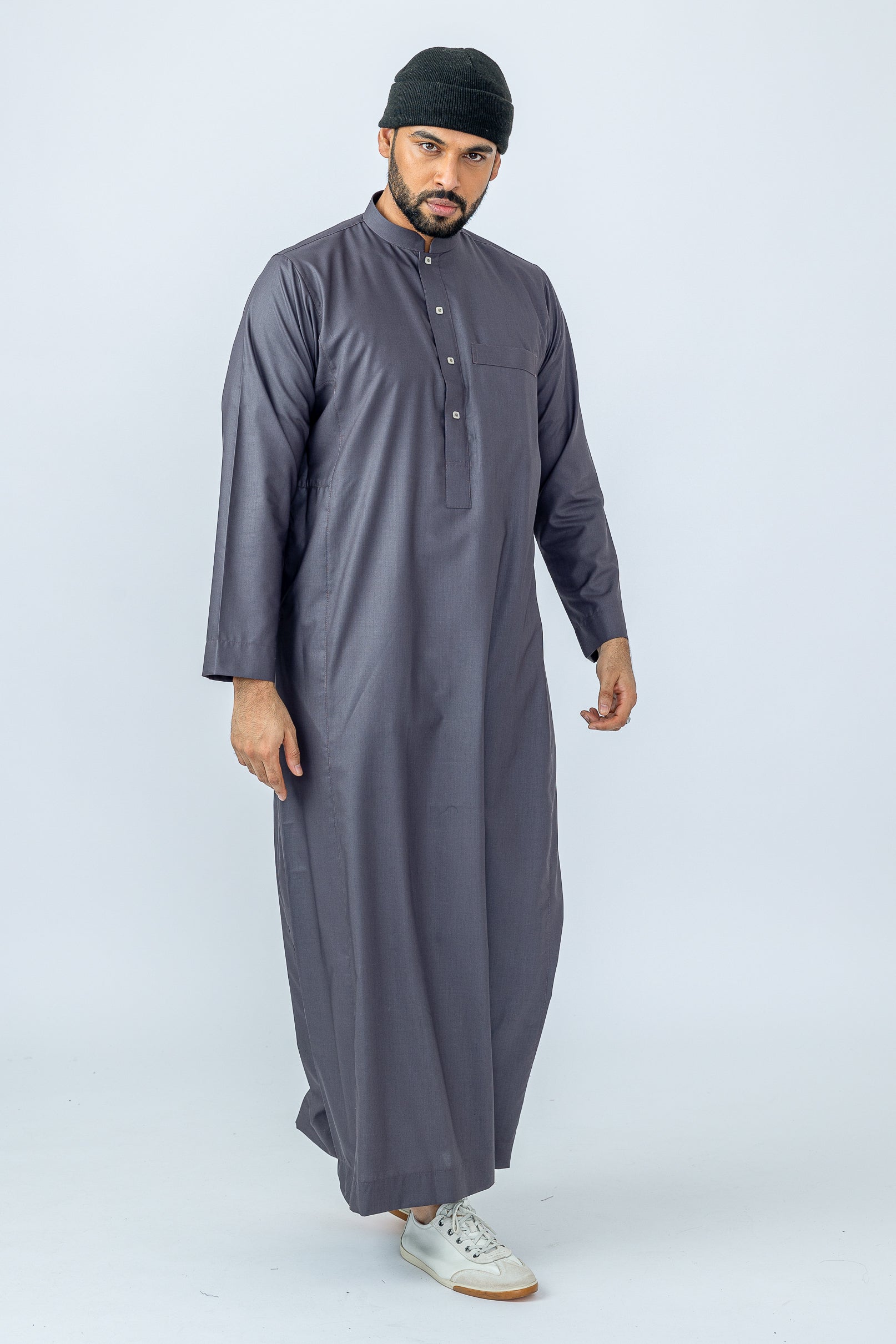 Our Dark Purple Taupe Arab Collar is part of our Al Noor Collection, perfect for everyday wear. Its simple design is carefully crafted with a soft split collar, metal press buttons, and soft polyester fabric. It also features two side pockets and a left chest pocket to store your belongings. Experience the comfort of our Purple Taupe Thobe.