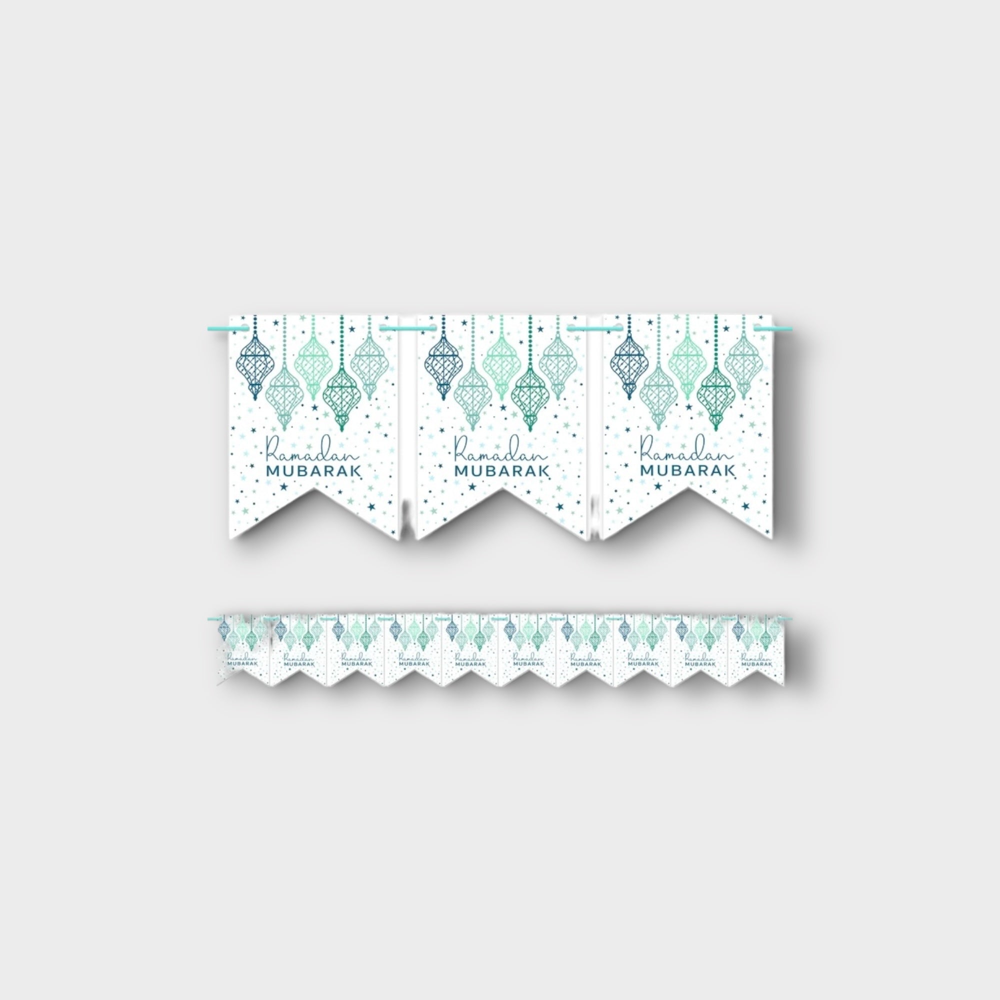 Our new 'Ramadan Mubarak' pennant shaped bunting is printed on both sides and comes with 3 metres of satin ribbon. A rich and bold new product to enjoy for the whole month of Ramadan. The month of mercy is a time of contemplation and reflection. Instil a fun atmosphere at suhoor and iftar times and celebrate this joyous occasion with friends and family. Style your home, school or work place with this pack of reusable, double sided Ramadan bunting.