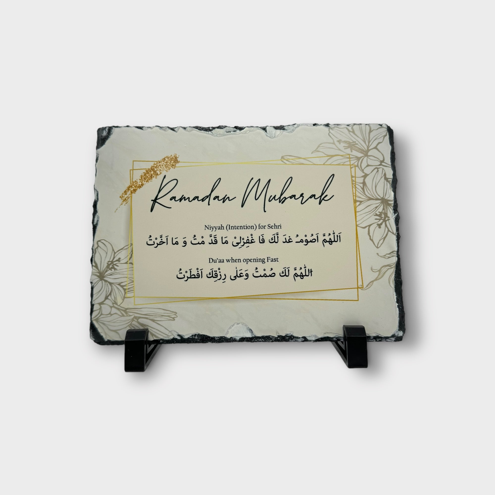 Celebrate the holy month of Ramadan with our handmade "Ramadan Mubarak" slate. This elegant and versatile piece is perfect for decorating your home or as a thoughtful gift for loved ones. Made with care for a special touch during this sacred time.