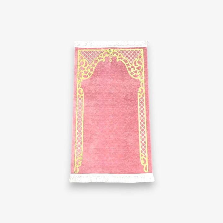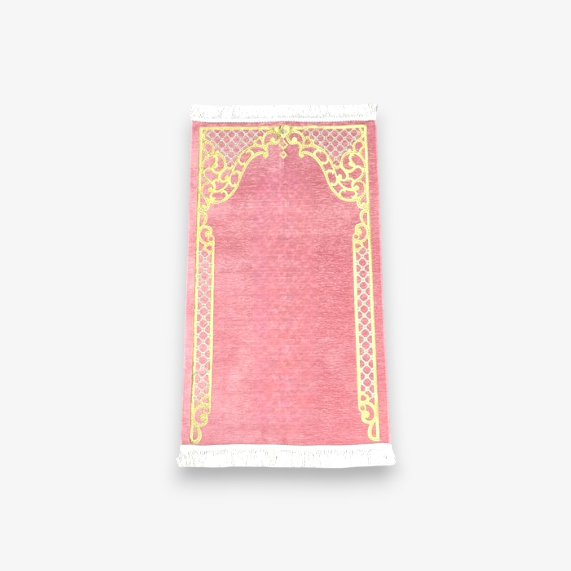 Crafted in a delicate rose pink shade, this prayer mat features a soft, velvety surface with a subtle sheen. The border is adorned with intricate gold metallic detailing, featuring an ornate mihrab arch design at the top and flowing arabesque patterns. The sides showcase a refined lattice pattern, while elegant scrollwork graces the corners. White fringed tassels add a finishing touch to both ends, creating a perfect blend of femininity and traditional Islamic design.