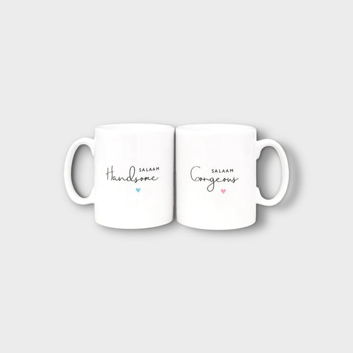 - 2 x 10 oz white ceramic mugs - Salaam Gorgeous and Salaam Handsome in a stylized font