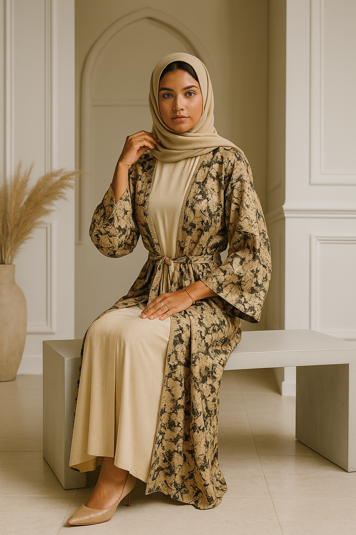 Step into elegance with the Sandstone Elegance Abaya, a perfect blend of sophistication and charm. Designed with intricate beadwork on the sleeves and a gracefully pleated hemline, this abaya brings timeless beauty to any occasion. The rich, earthy tone adds a touch of warmth, making it an ideal choice for both formal and casual wear. Draped in style, feel confident and radiant in this exquisite piece.