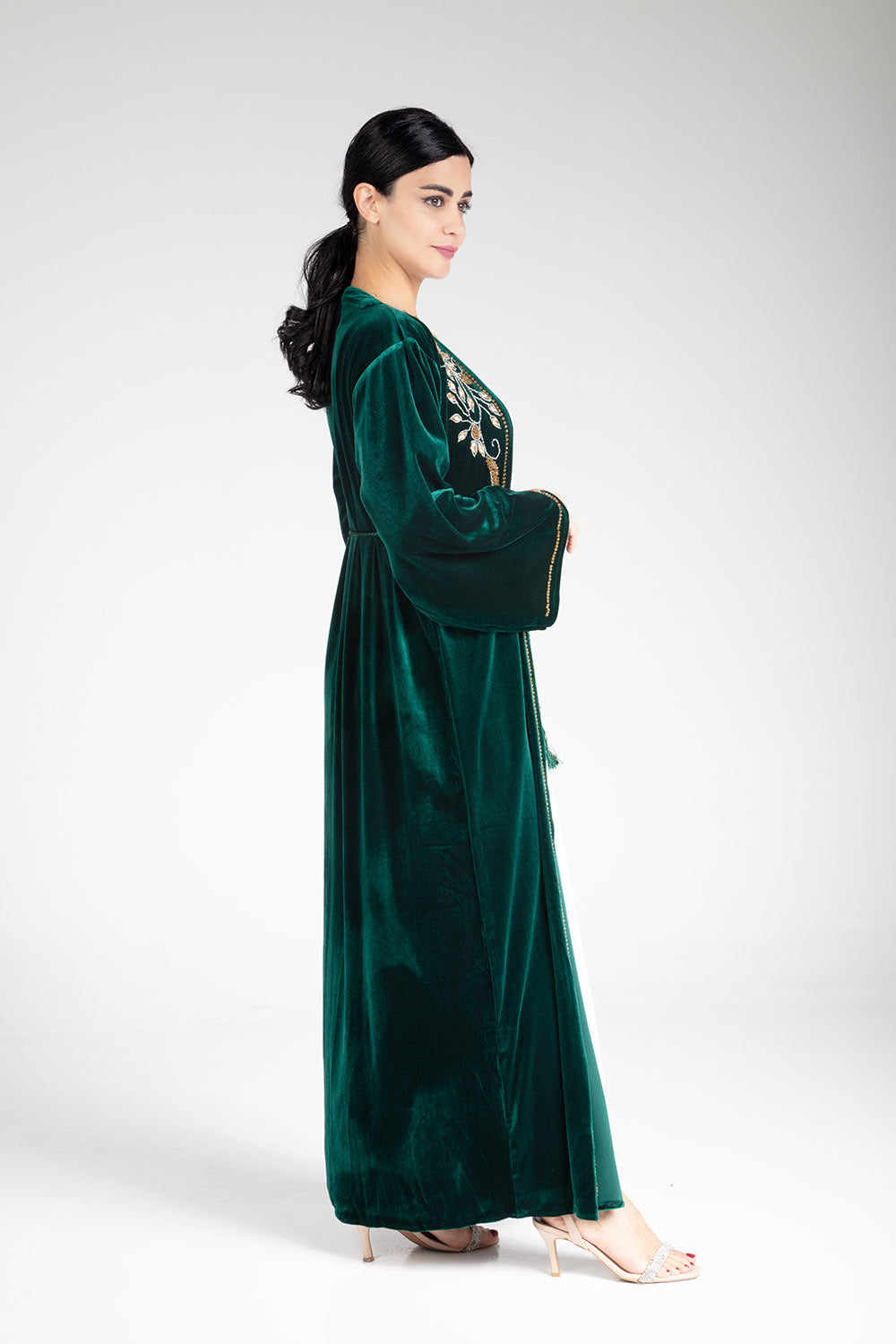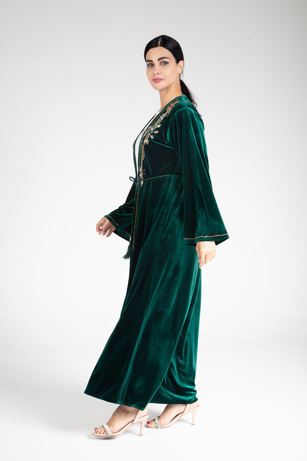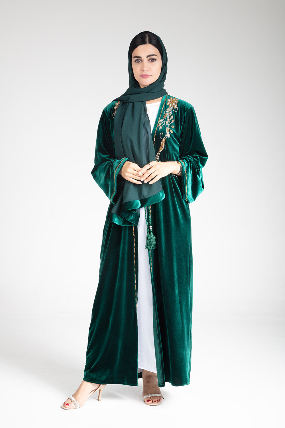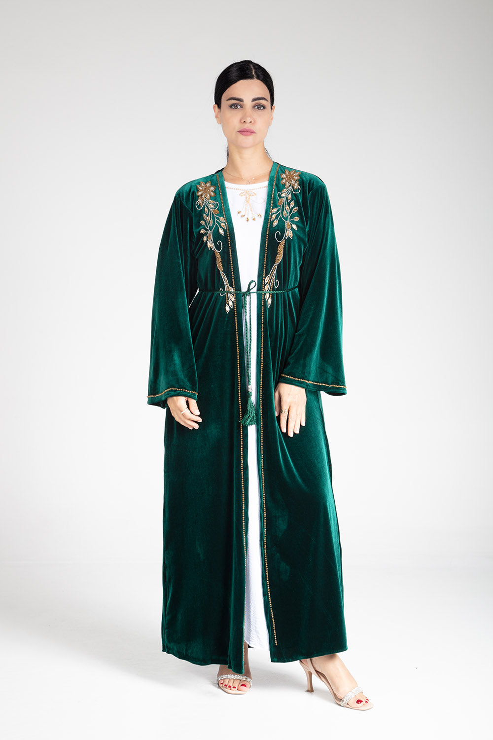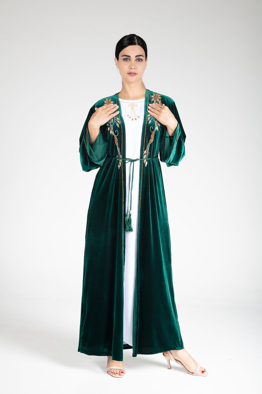 Introducing the luxurious Sherwood Green Velvet Kimono, featuring exquisite hand beaded work. Comes with a kimono, inner slip, and scarf for a complete and elegant look. Elevate your style and indulge in luxury with this must-have piece.