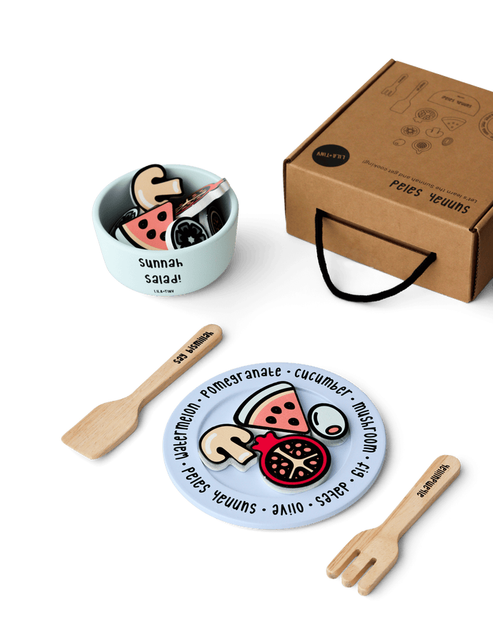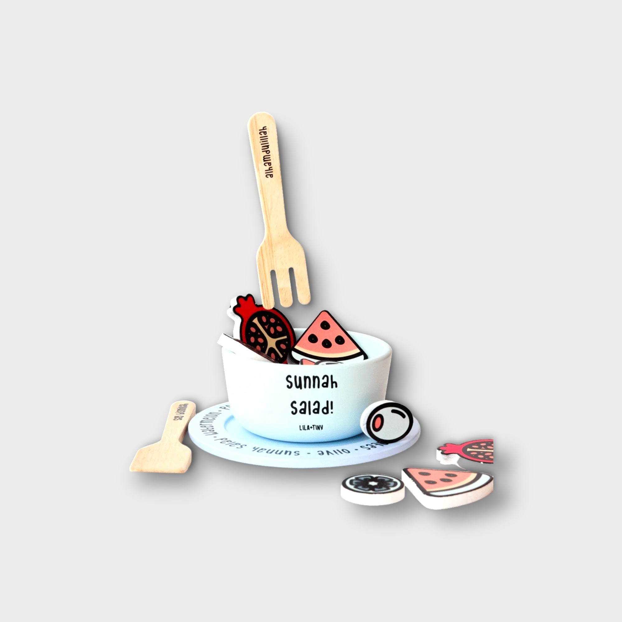 The Sunnah Salad wooden set is inspired by our Prophet’s (pbuh) foods, from fruits to vegetable. These consist of dates, olives, figs, mushrooms, cucumbers, watermelons and pomegranates! Let your child play endlessly in their kitchen, the Sunnah Salad will get your child playing chef in no time!