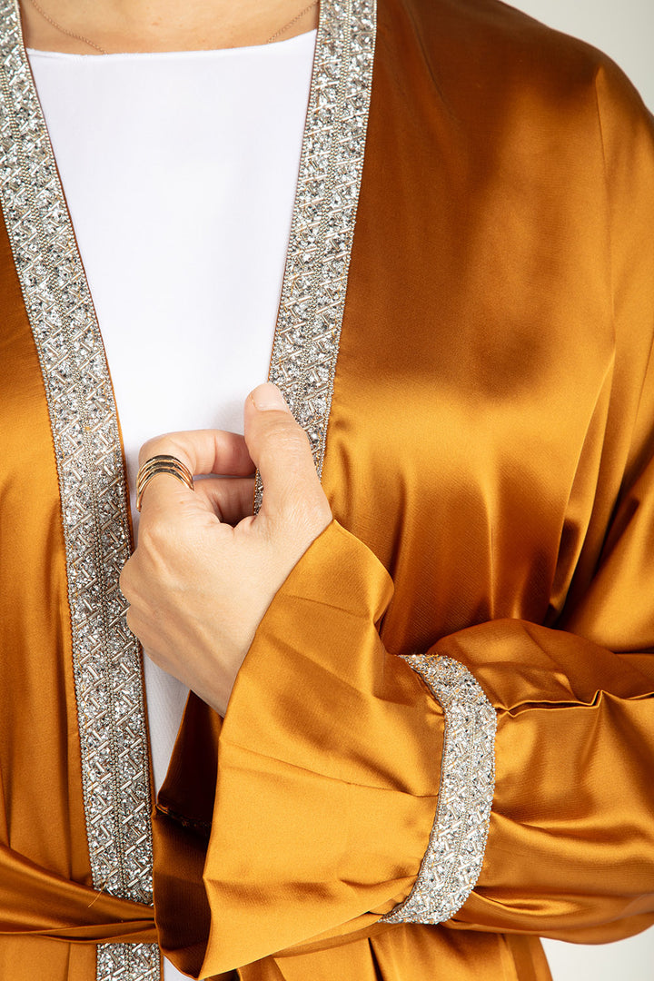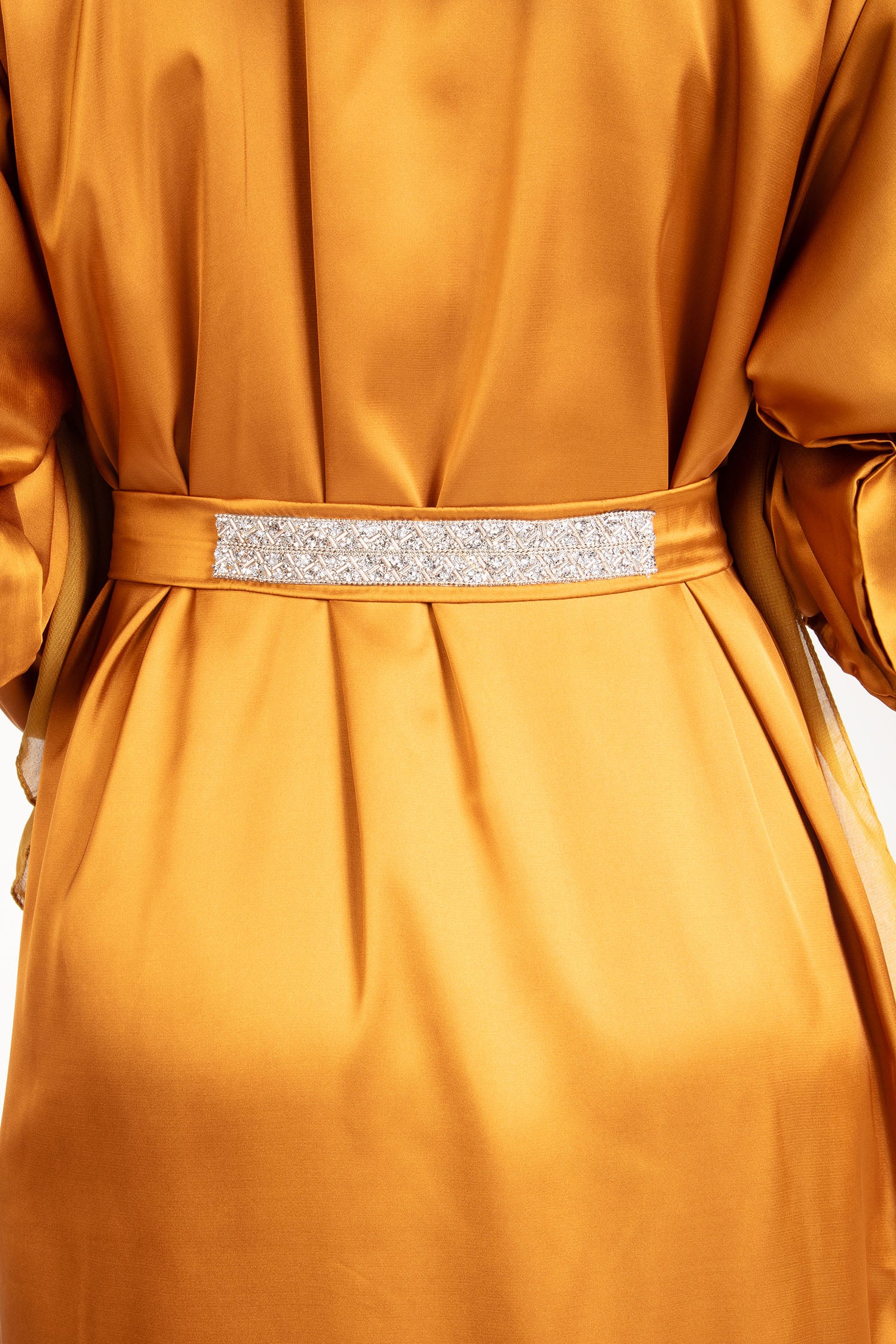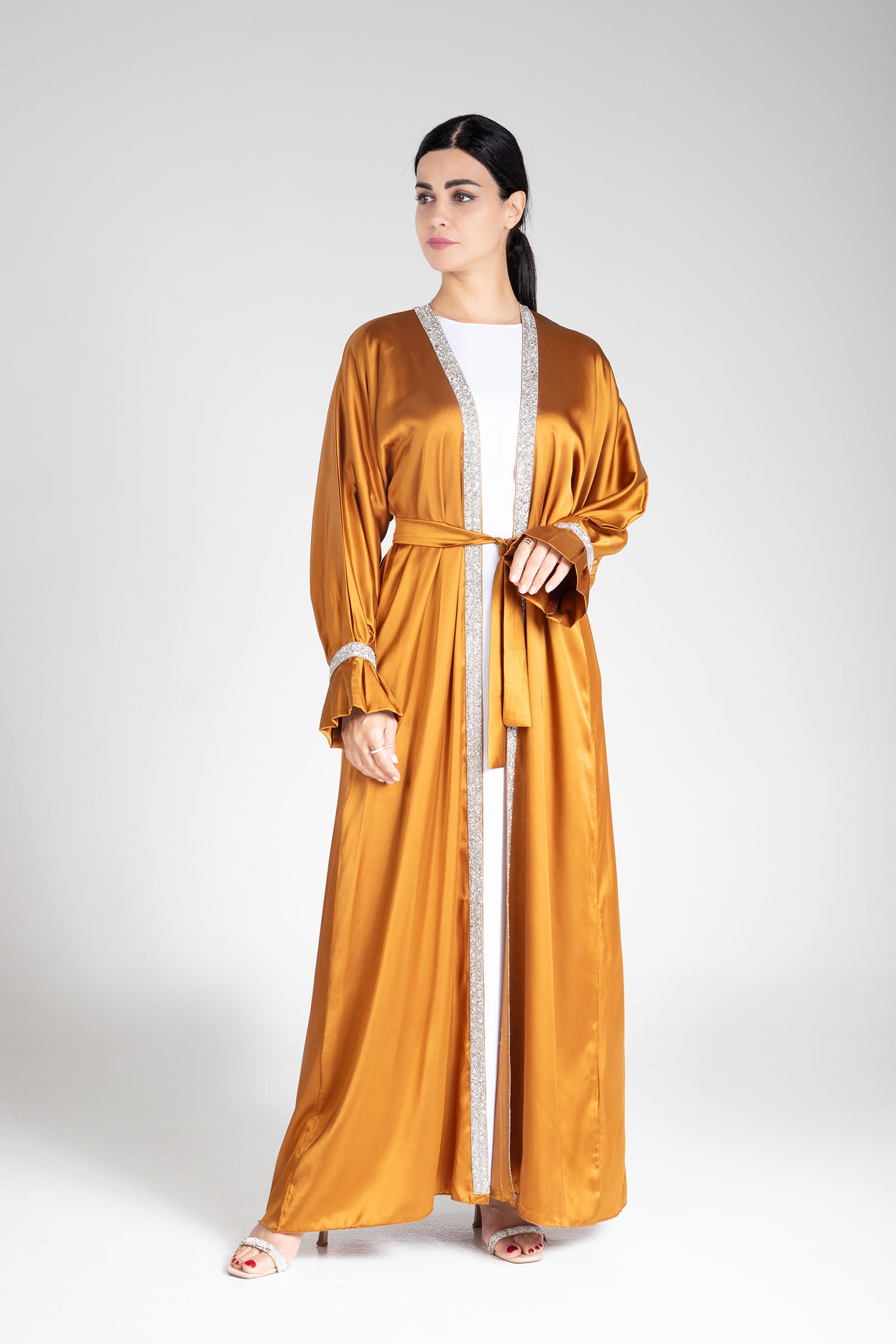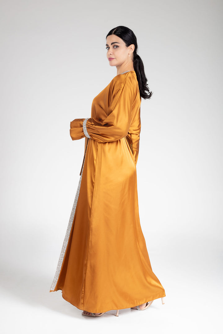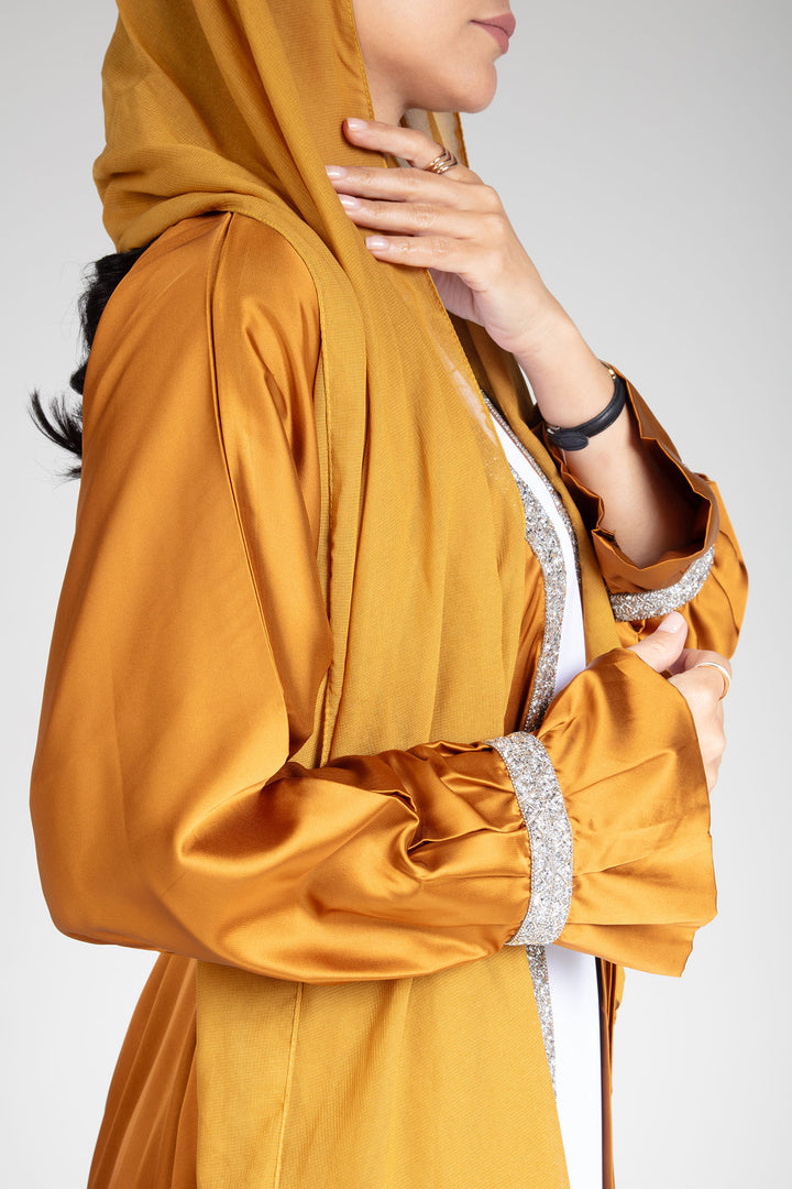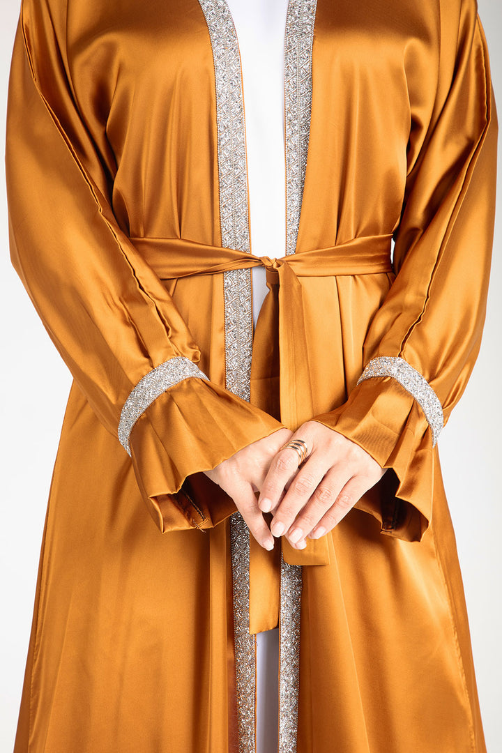 This "Sunset Majesty" abaya exudes sophistication and elegance, perfect for special occasions. Crafted from luxurious golden fabric, it features a graceful, floor-length silhouette that enhances its regal appeal. The abaya is beautifully accented with a silver trim along the edges and the front opening, adding a subtle sparkle that contrasts stunningly with the deep golden hue. The wrap-around style is secured with a matching fabric belt, emphasizing the waist and lending an overall poised and polished look. Completing the design are the finely tailored sleeves, each adorned with silver trim at the cuffs, harmonizing with the main aesthetic. This abaya is not just an outfit but a statement of grace and style.