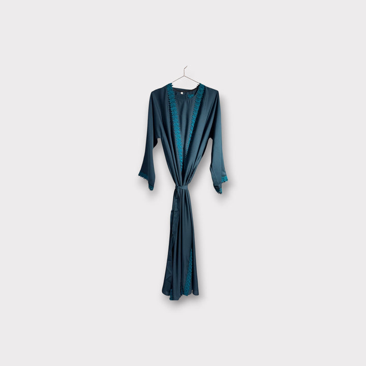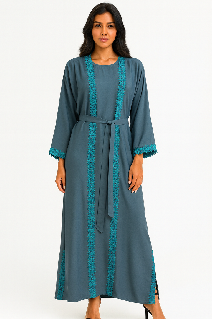 Elevate your modest wardrobe with our Teal Embroidery Abaya. Made with soft and lightweight fabric. The closed design will keep you stylishly covered, and the hijab is included. Hand wash gently for best care.