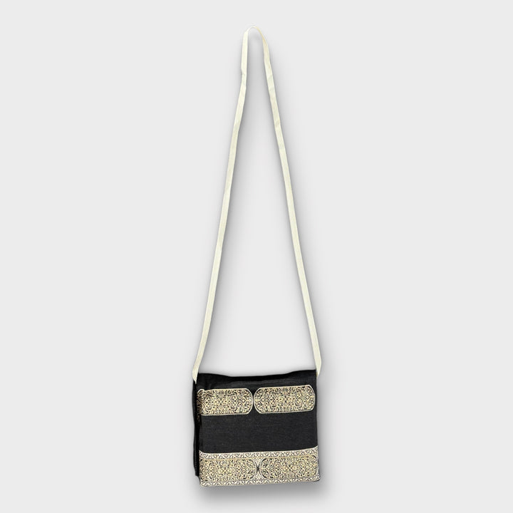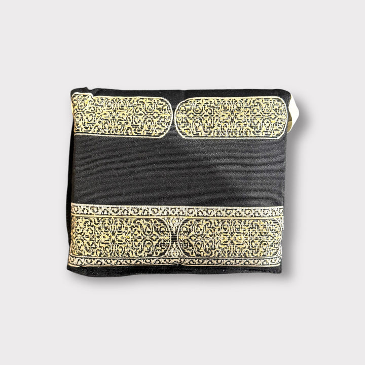 Matching Cover: The coordinating cover is specifically designed to protect and carry the travel prayer mat. It features the same charcoal black base color with decorative cream-gold bands at the top and bottom. Each band contains two rounded rectangular panels filled with detailed Islamic patterns, connected by a thin ornamental strip. The cover perfectly complements the prayer mat while providing practical protection during transport.